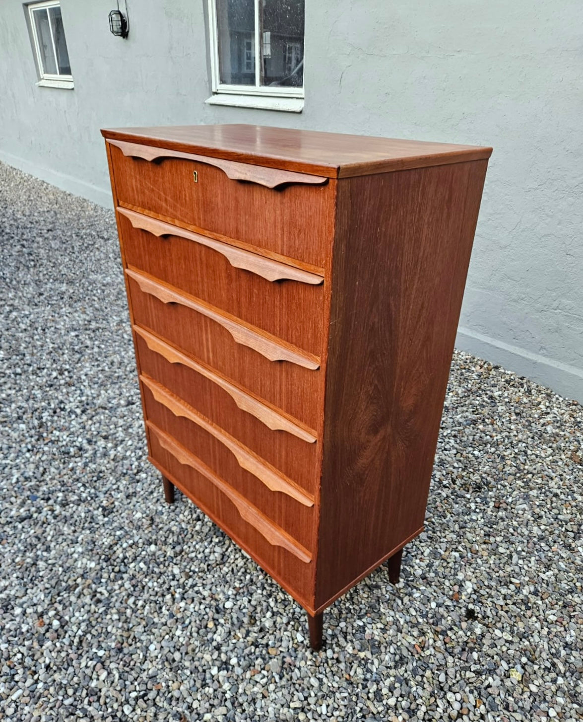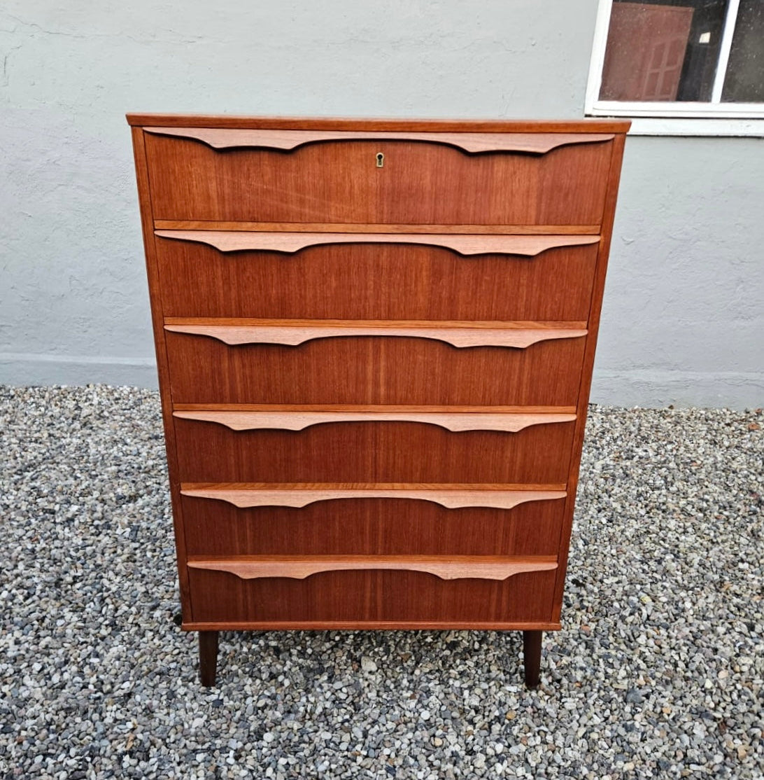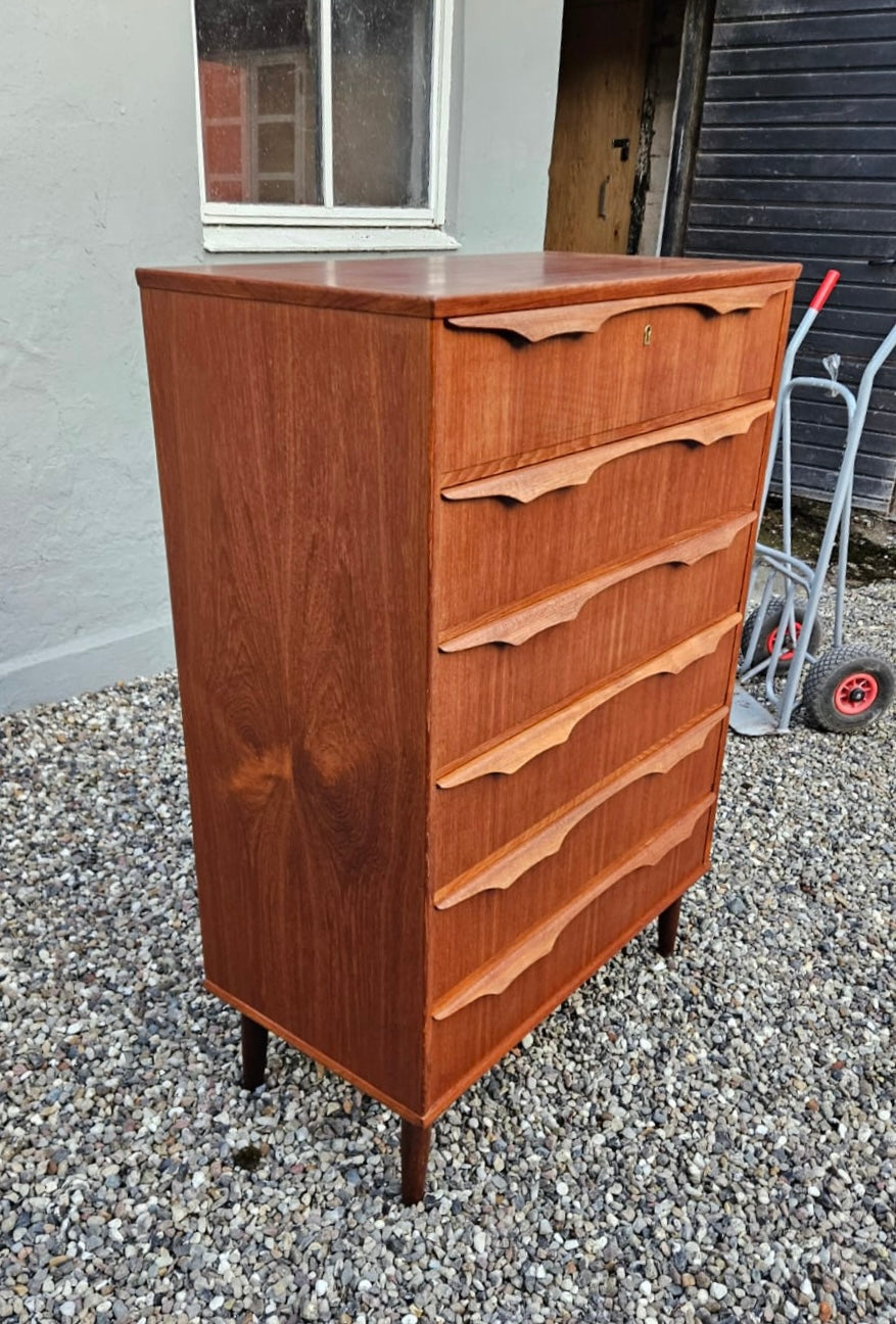 Six drawer tallboy in teak with “blade” handles and on slightly splayed legs.