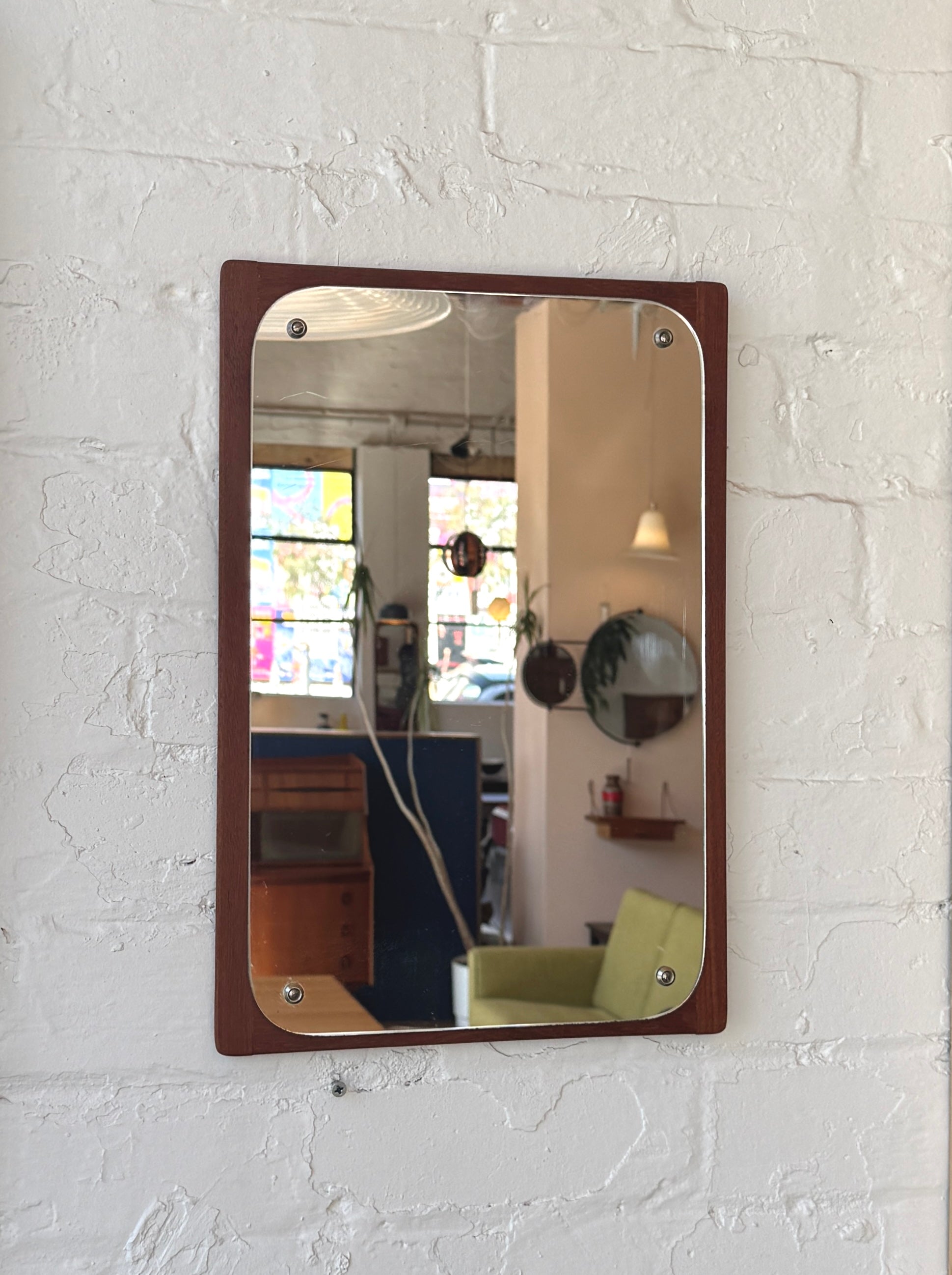 Rectangular shaped mirror floating on a teak base with rounded edges.