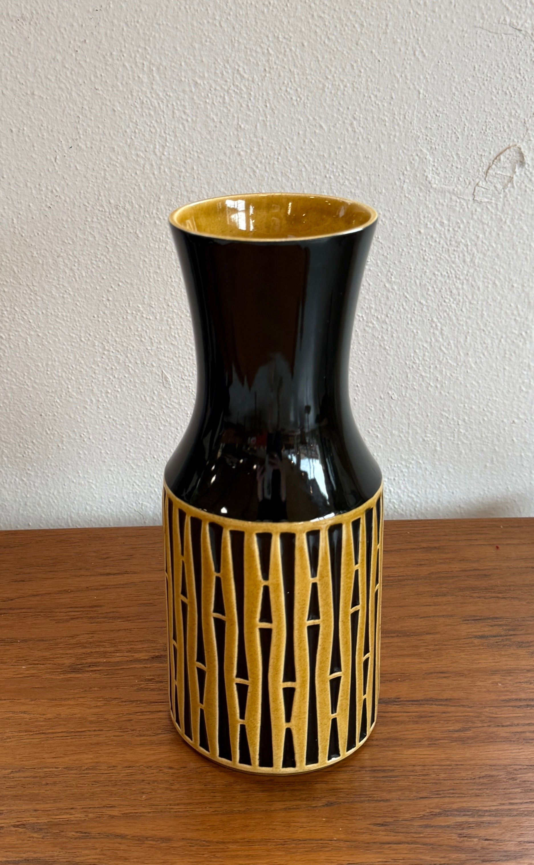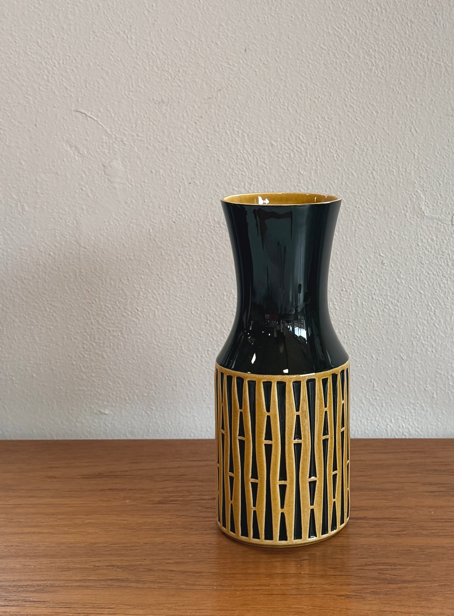 Wonderful vase from one of Britain's best. A deep, dark chocolate glaze underneath, with a pattern of golden shoot bamboo ringing the base.