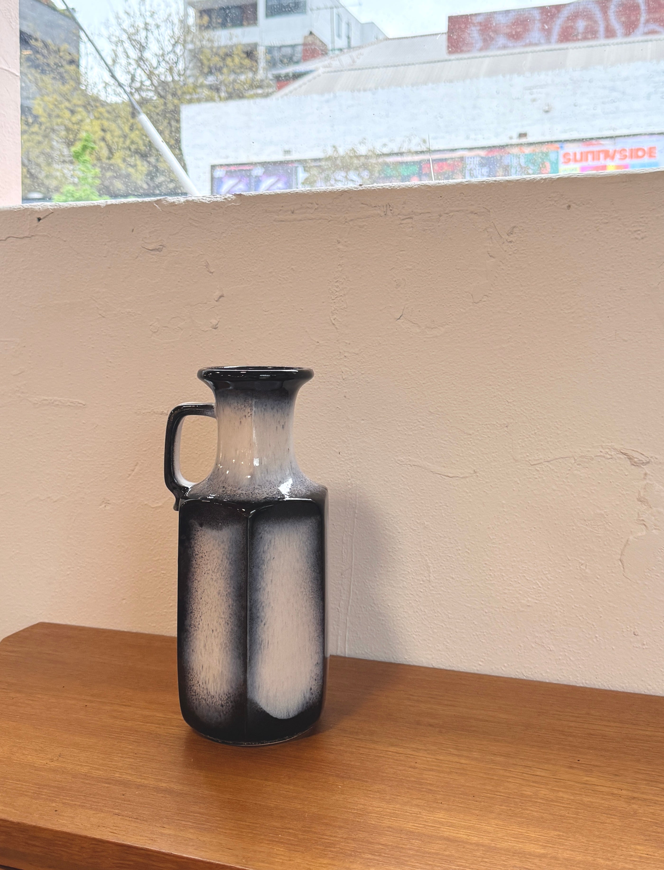 Produced in the 1970s by Scheurich Keramik, this hexagonal shaped vase has a mottled light grey background with corners and edges in a dark grey - black gloss glaze.