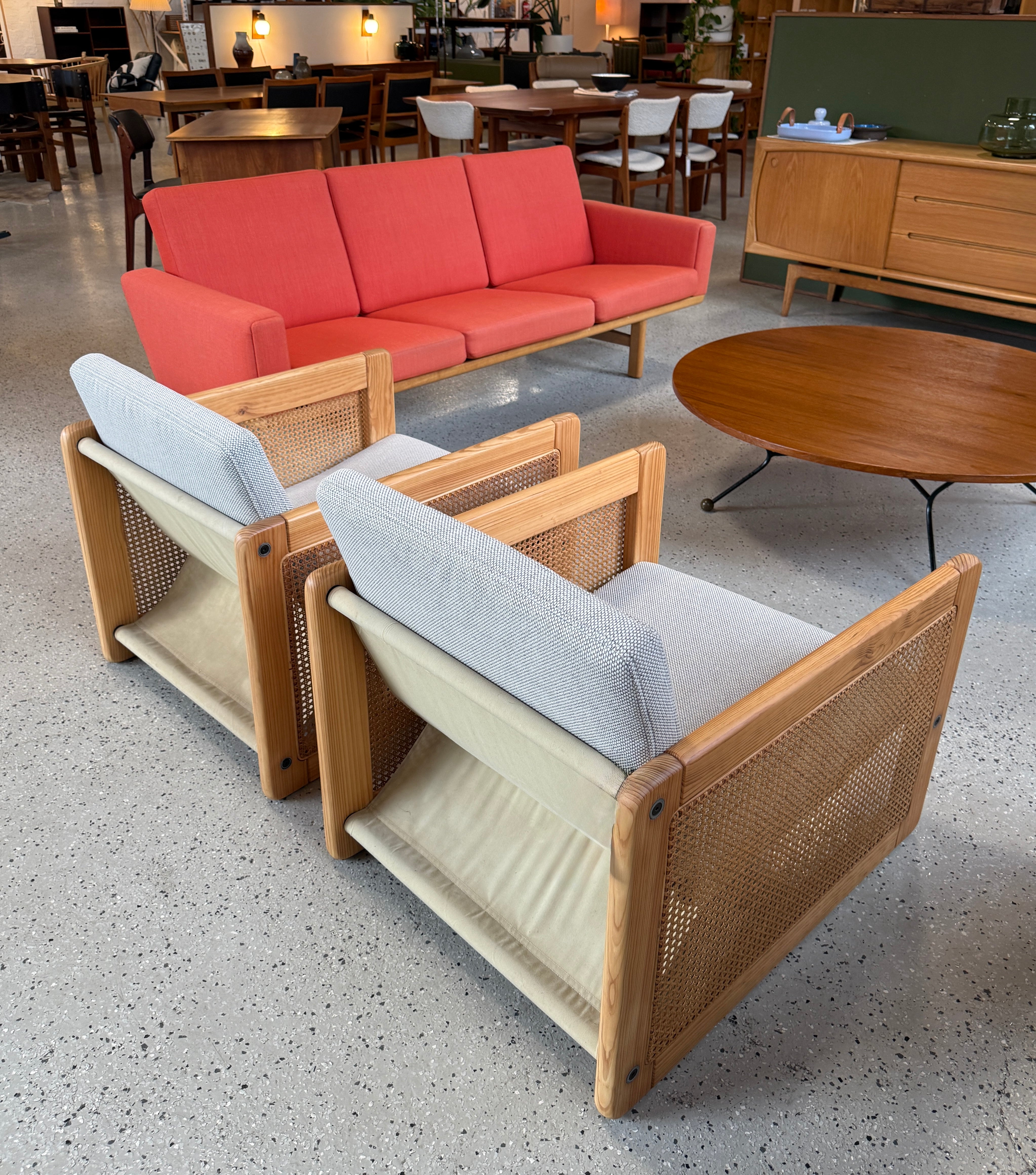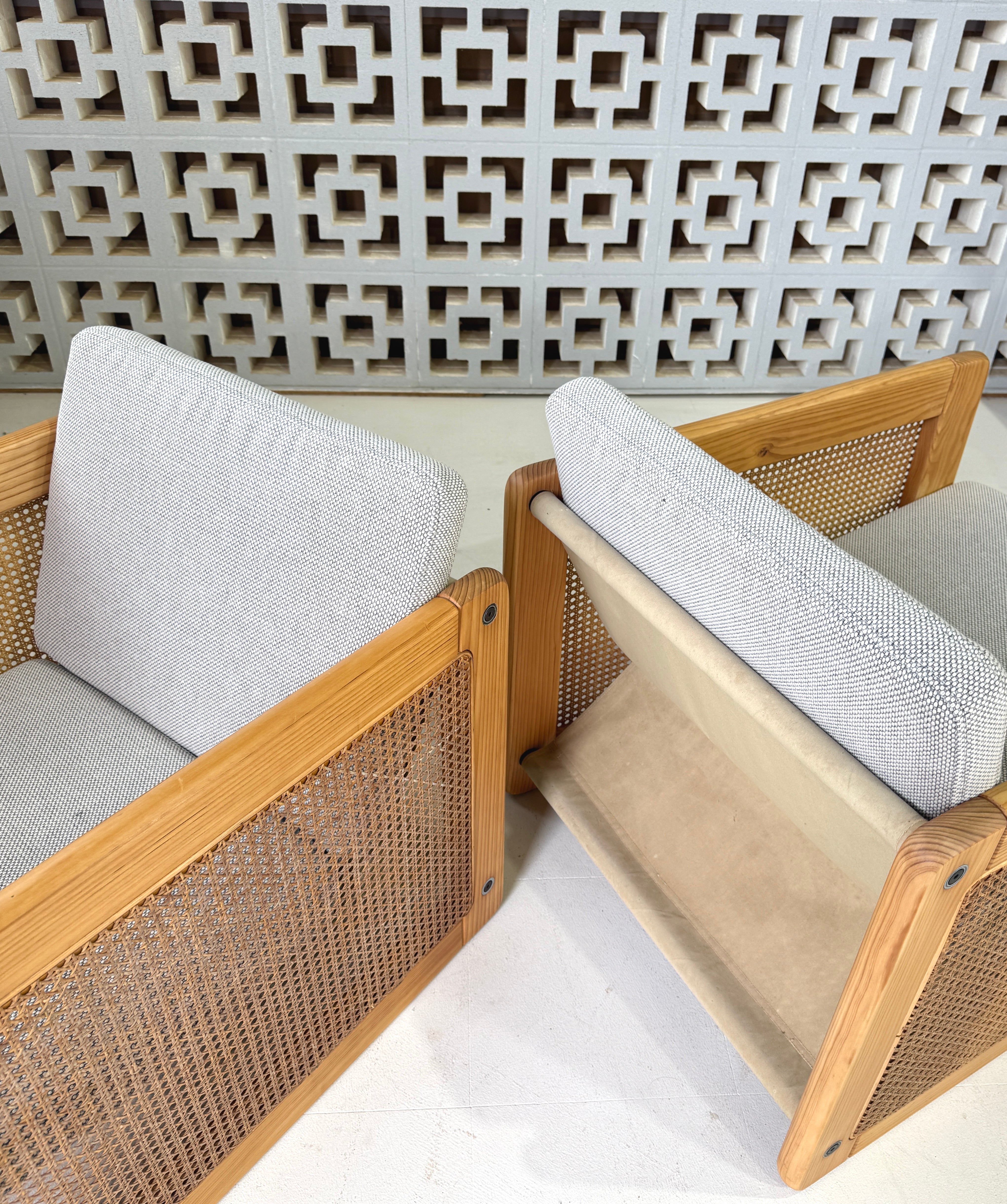 Splendid low-profile lounge chairs constructed from Nordic Redwood pine and with split-cane panels.