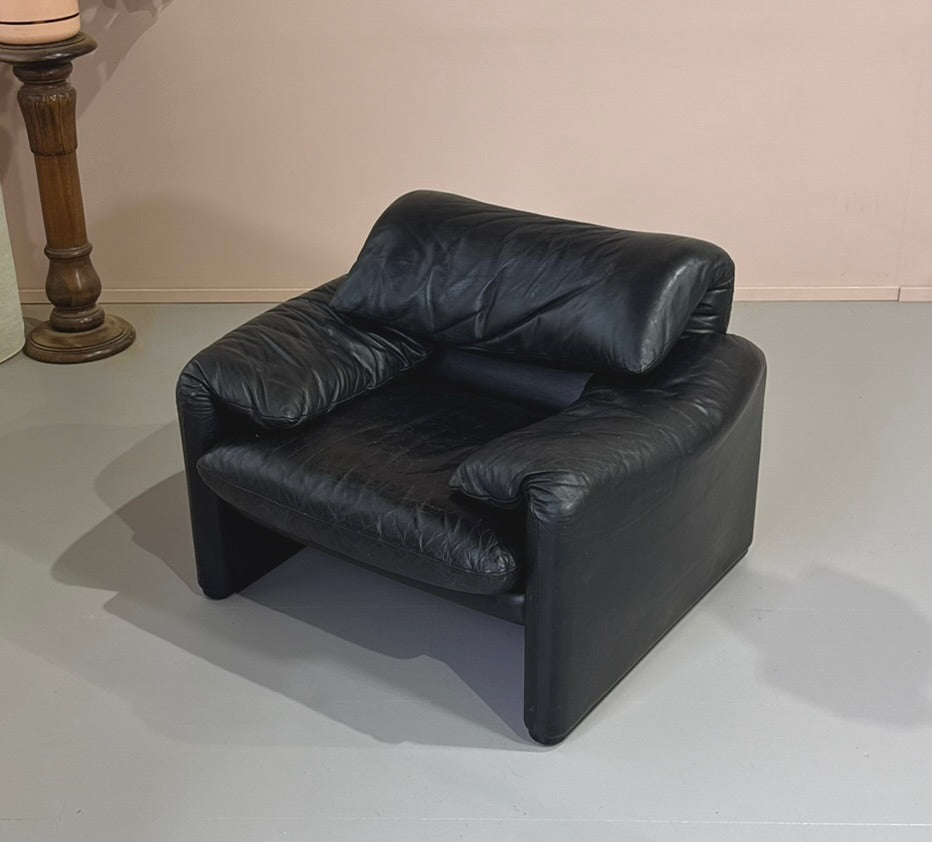 Note: We also have two Maralunga lounge chairs, both requiring upholstery, a Maralunga two-seater sofa requiring upholstery as well as a two seater sofa in original black leather.