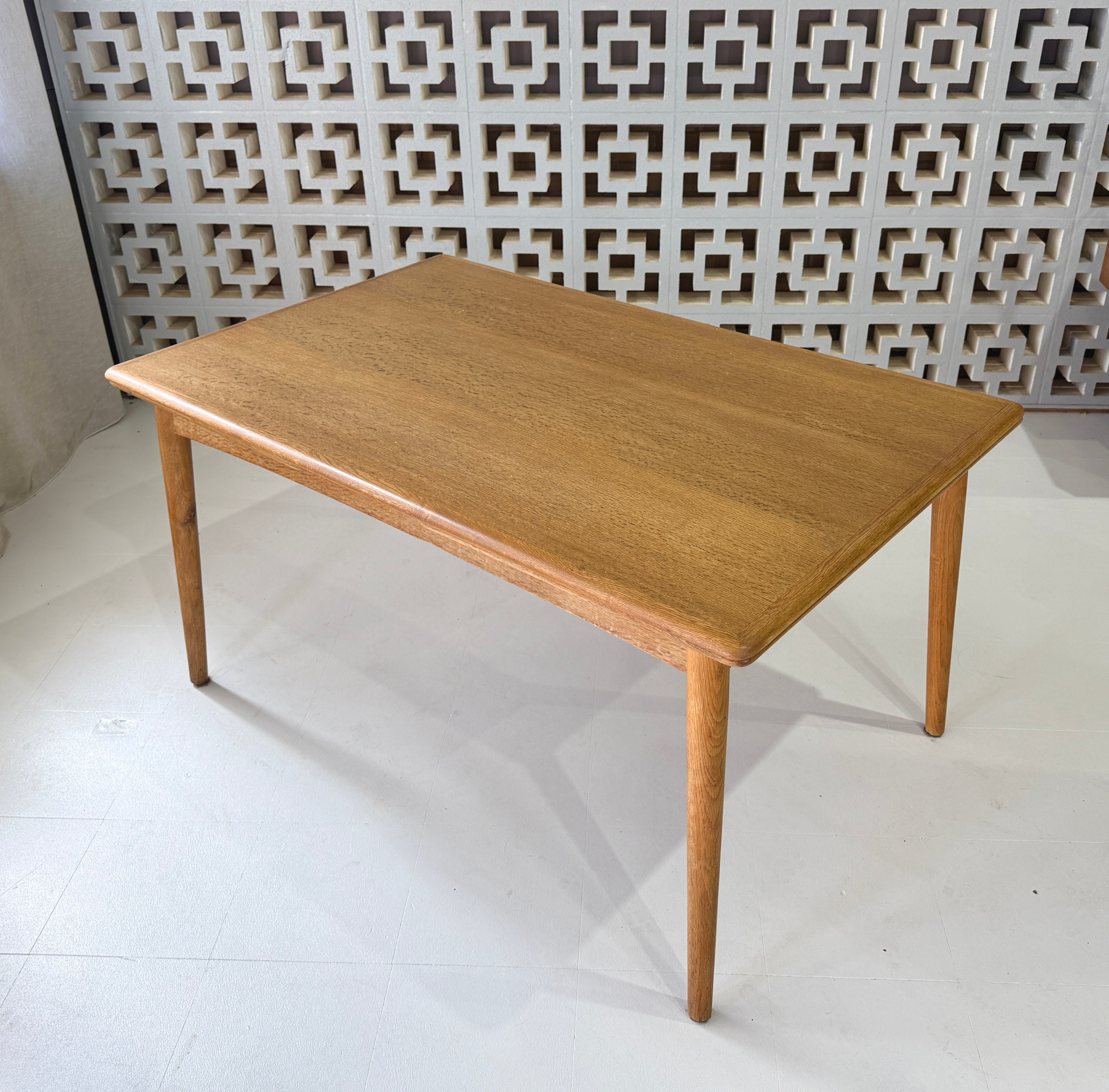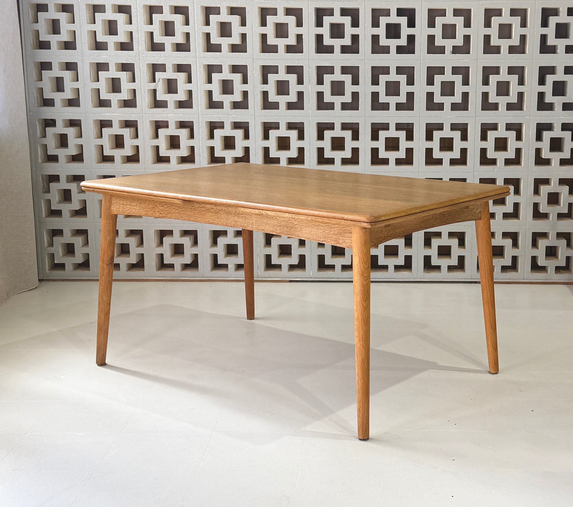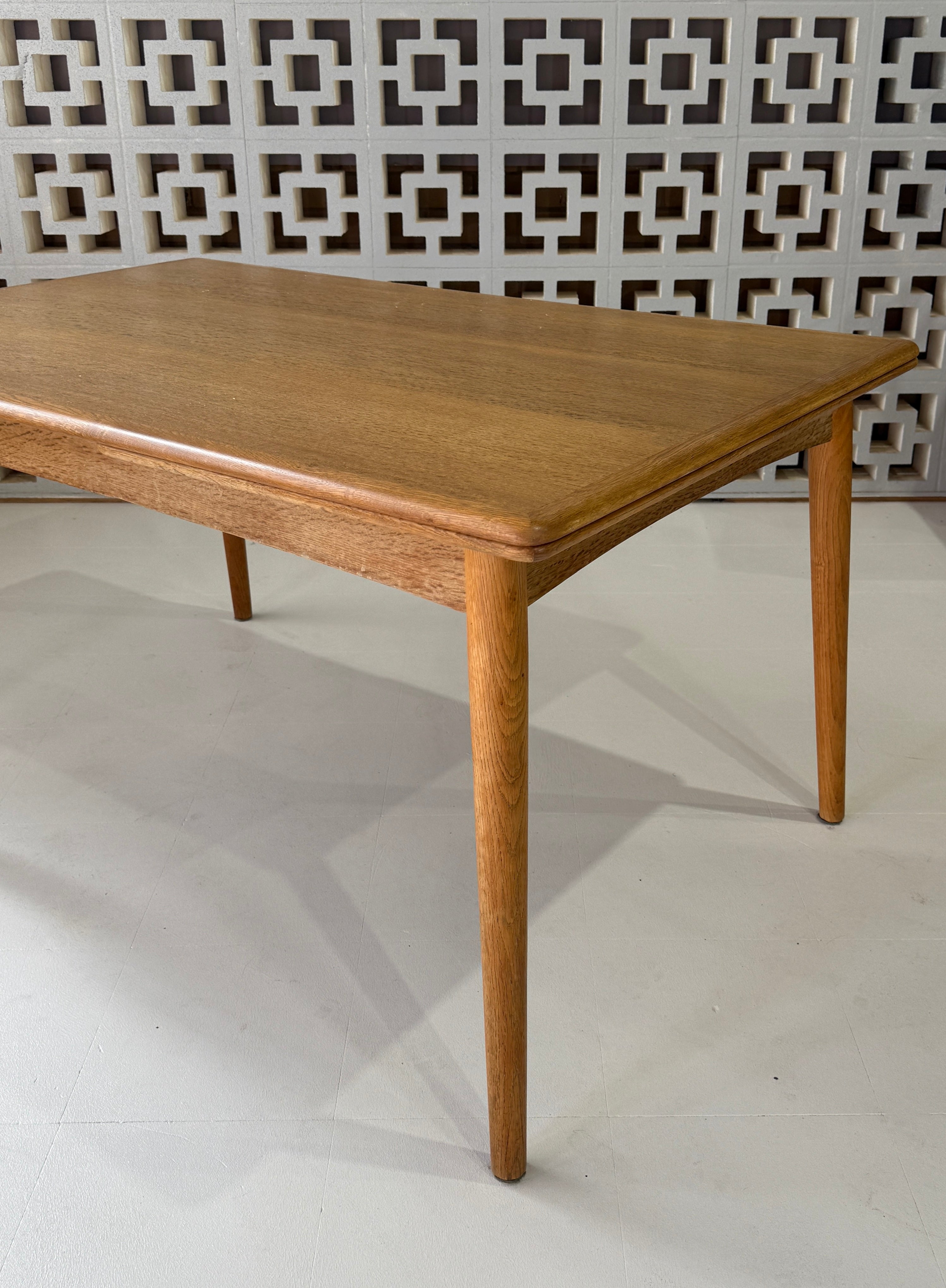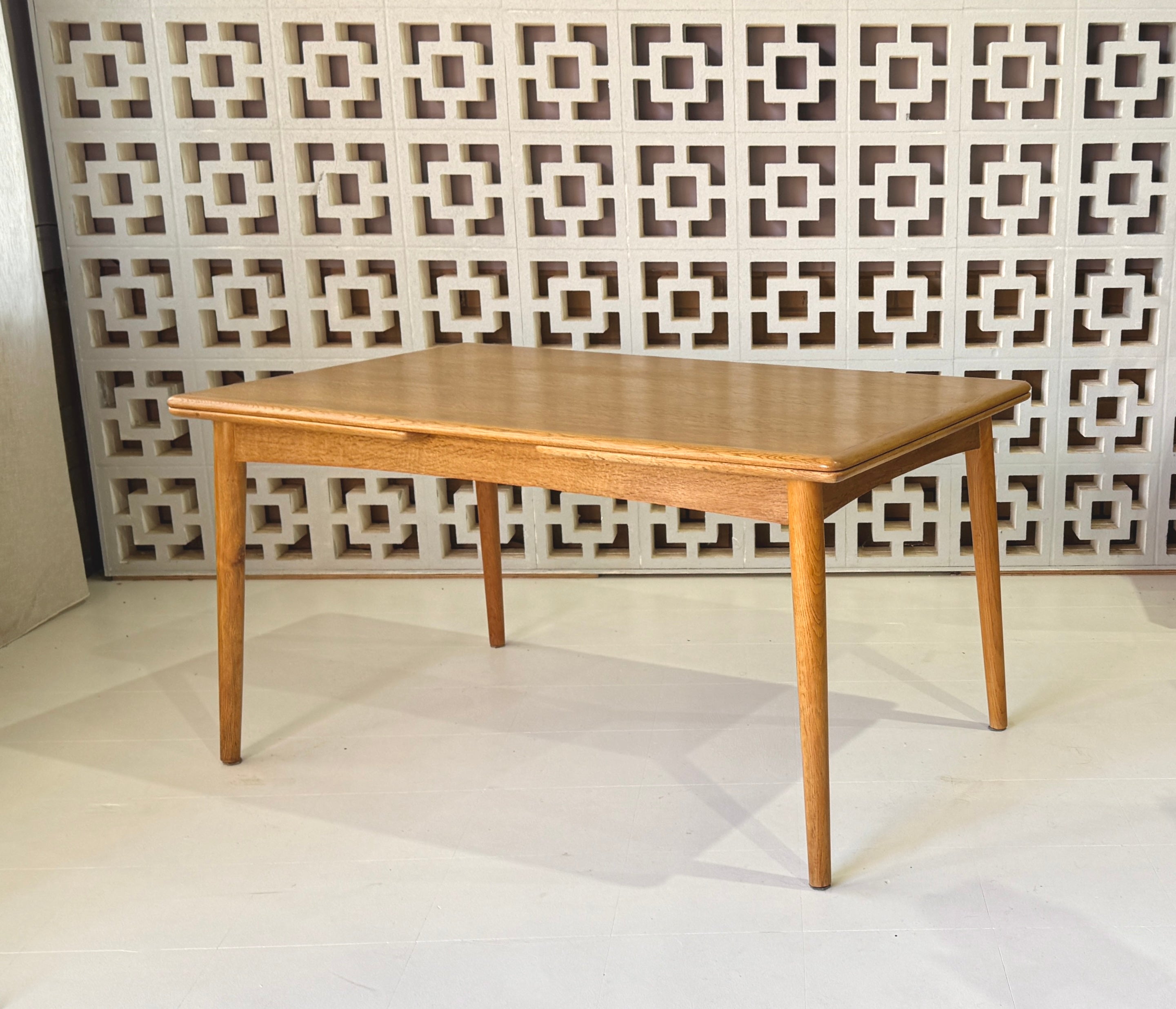 Excellent European oak, larger dining table with twin extensions and elevated on splayed legs