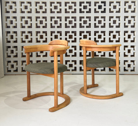 Set of six ladder-back chairs in European oak and in their original striped green wool.