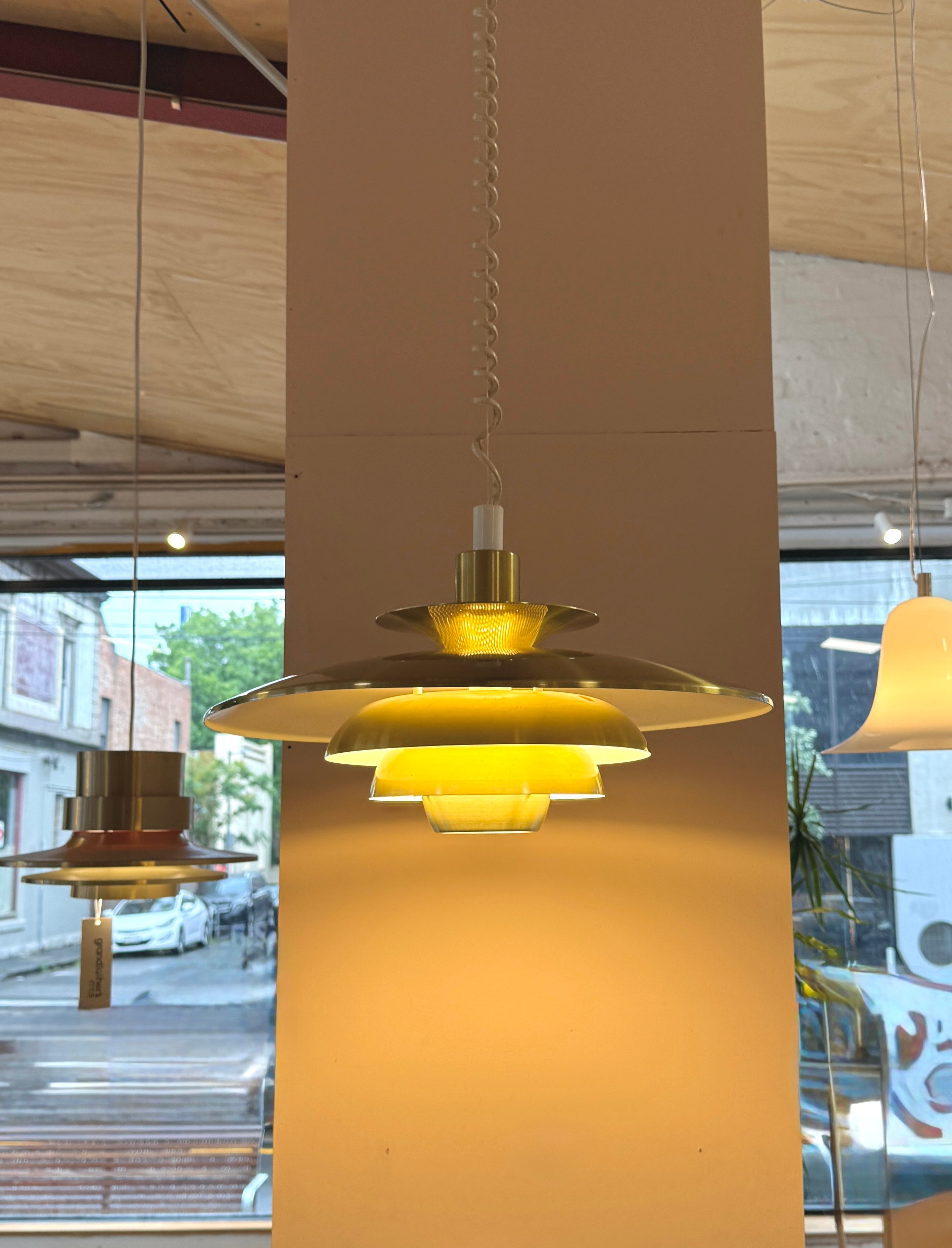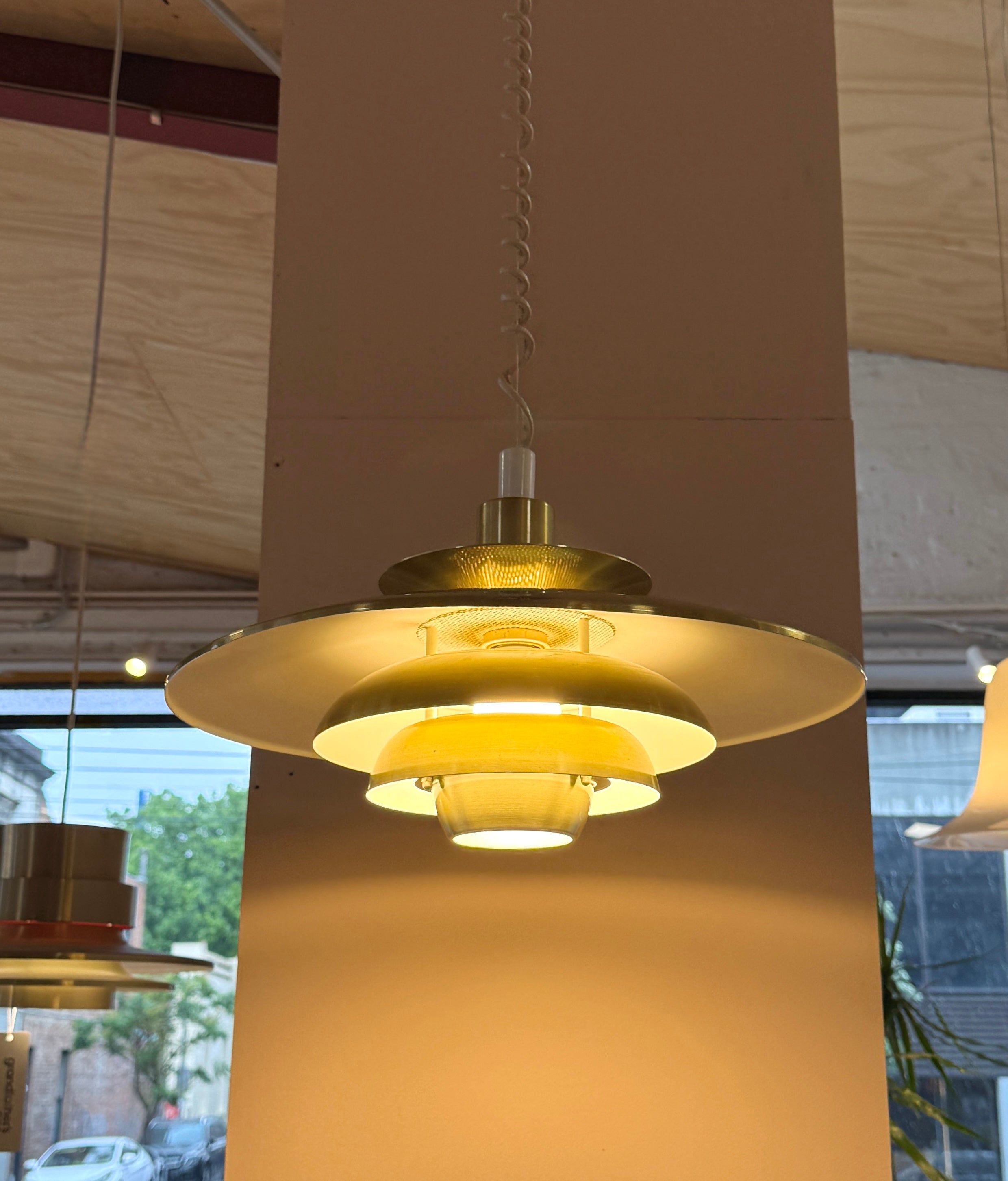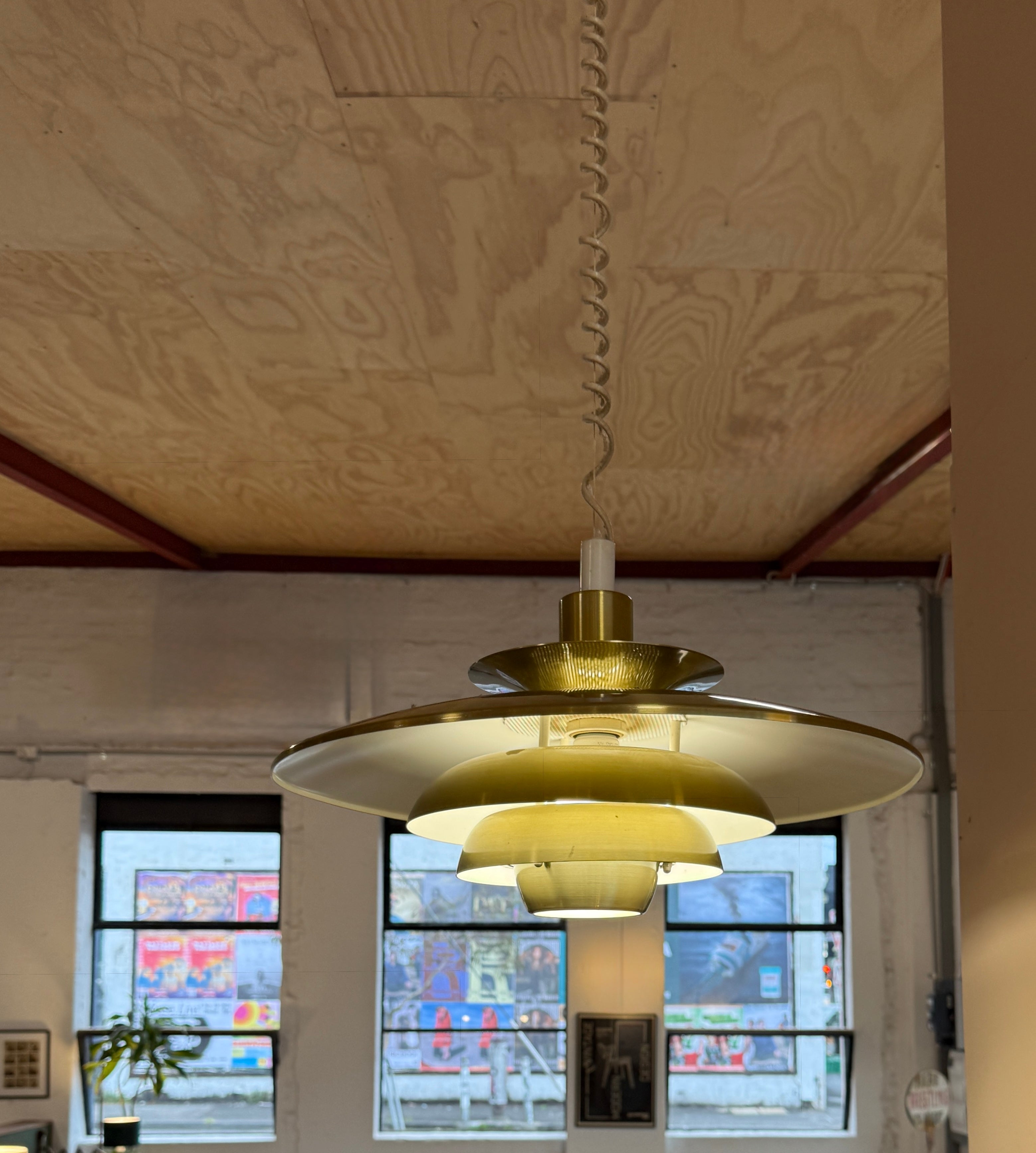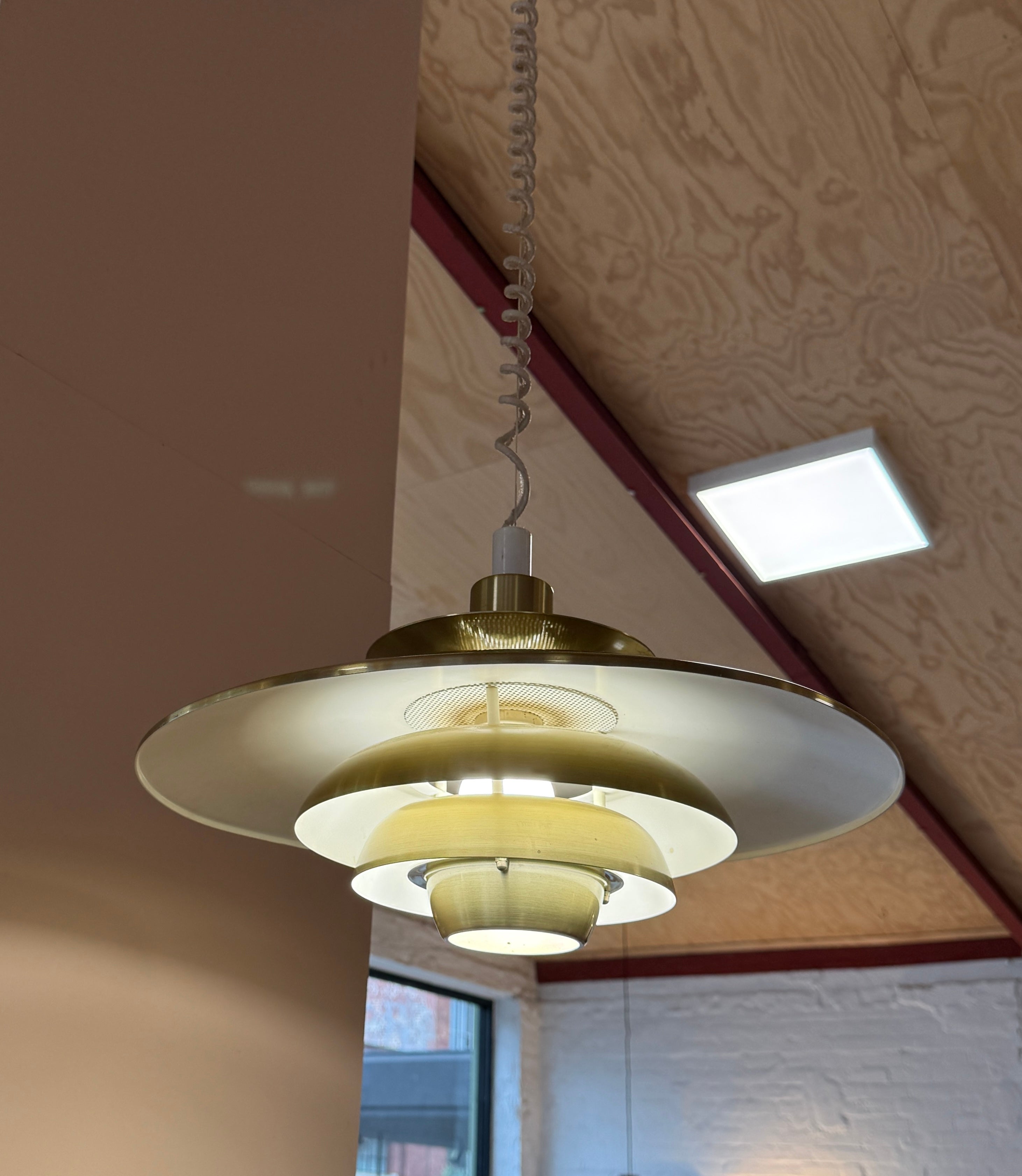 Louvred pendant in brushed brass enamel and with a working retractable mechanism.