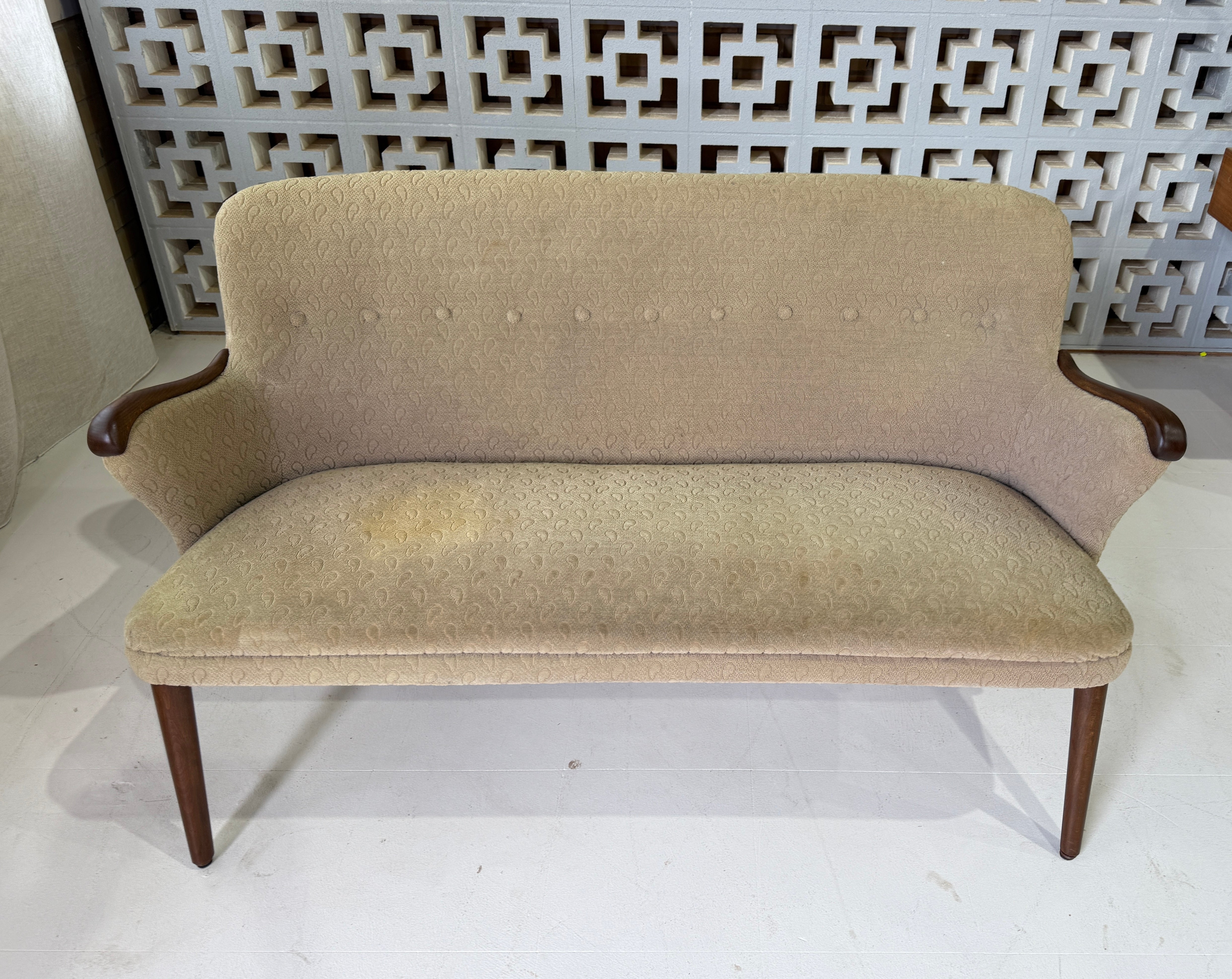 Will have the arms and legs restored, contact us for a quote on your preferred upholstery or take it as it is. (We estimate that upholstery work will cost $800-$1000 plus your choice of fabric.)