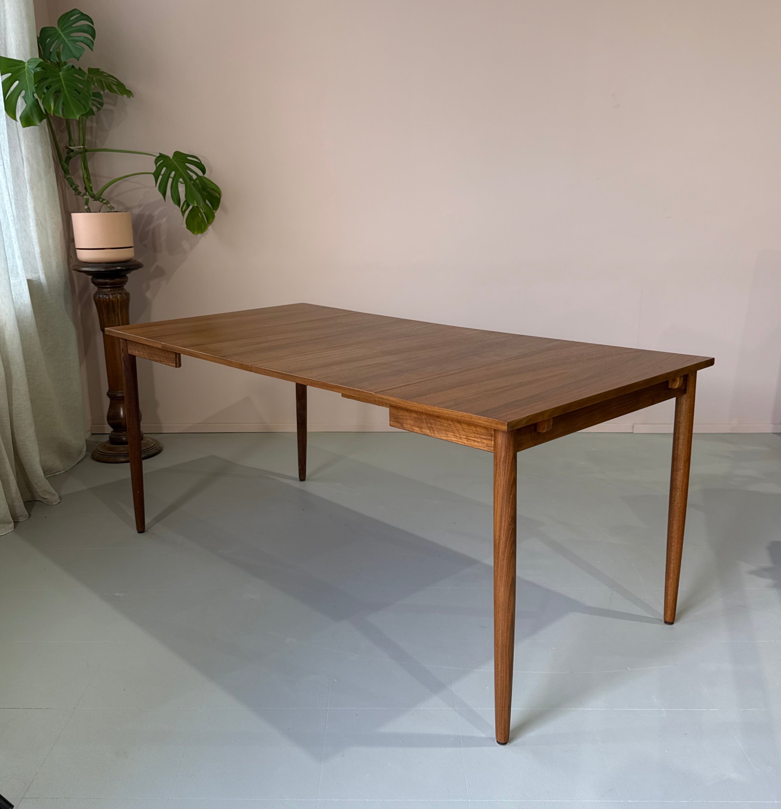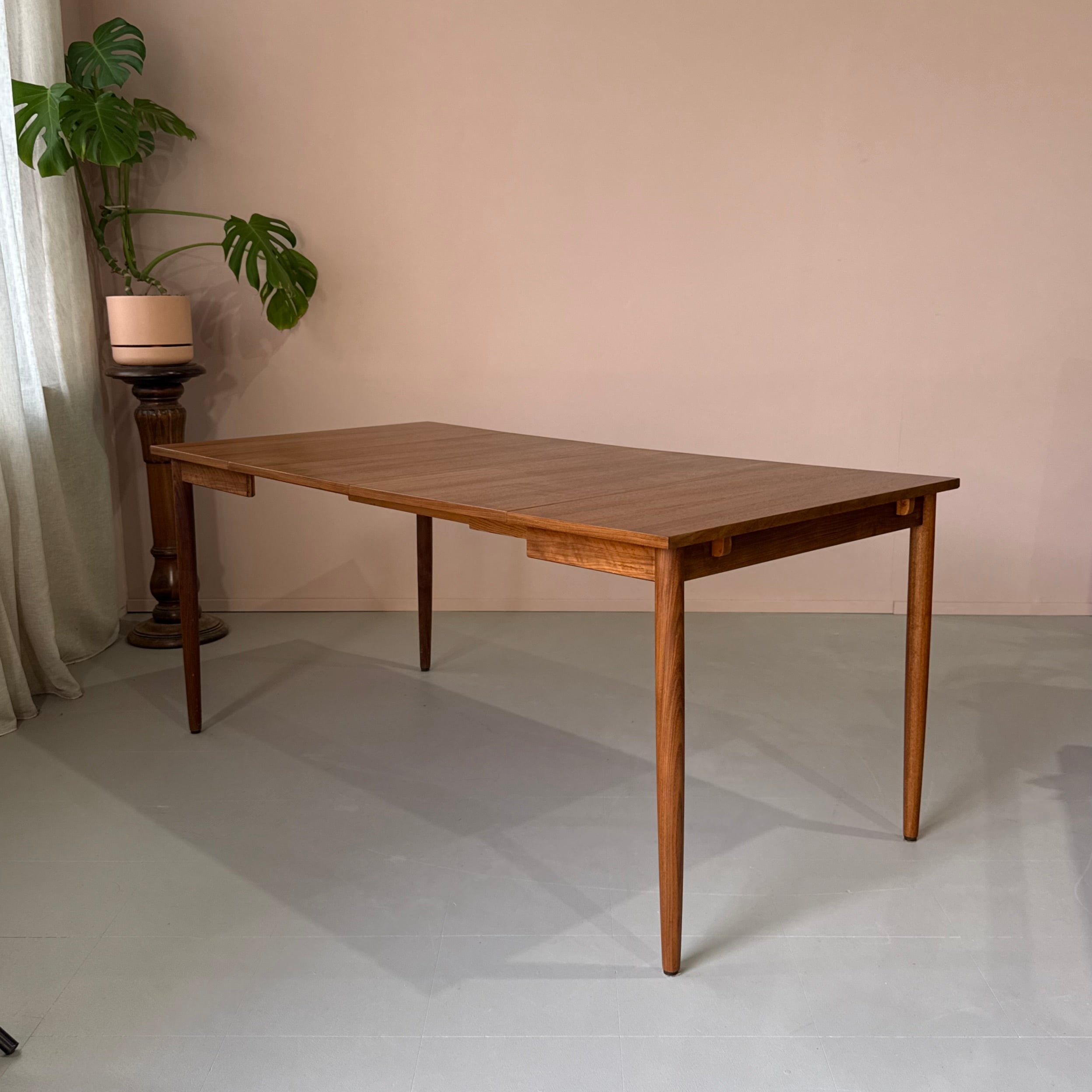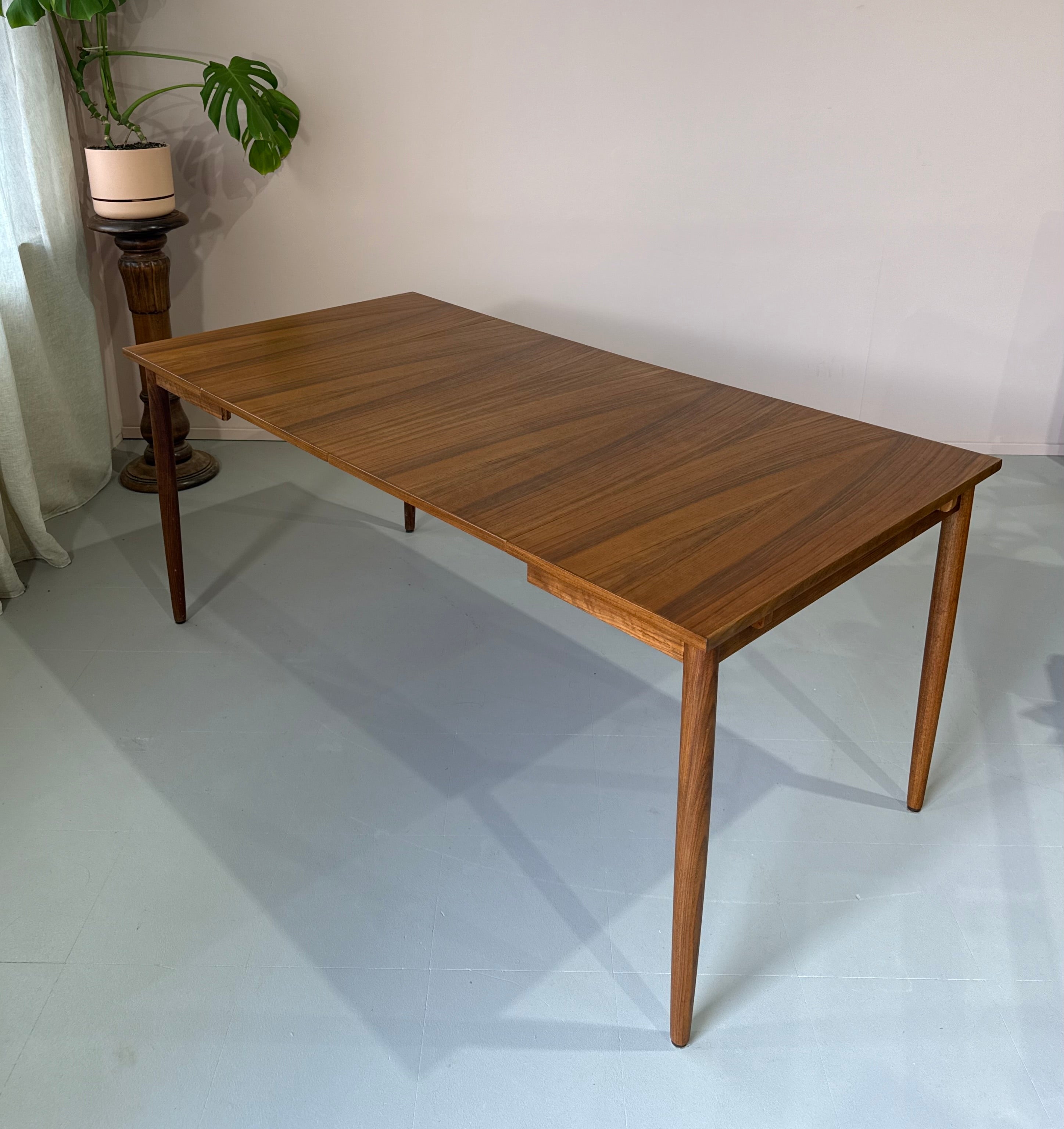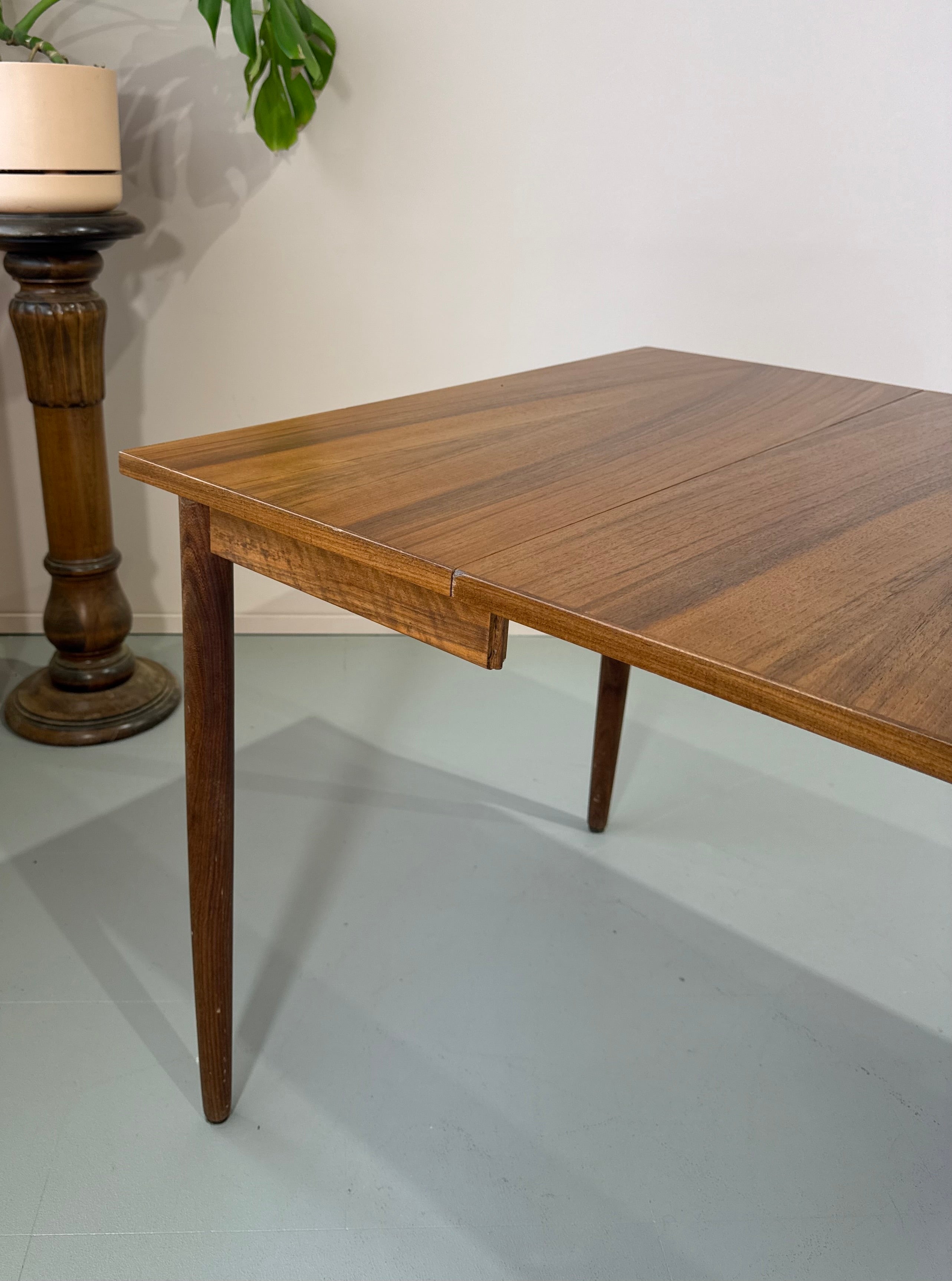 Versatile drop in leaf extension dining table with a vibrant teak grain and elevated on tapered legs.