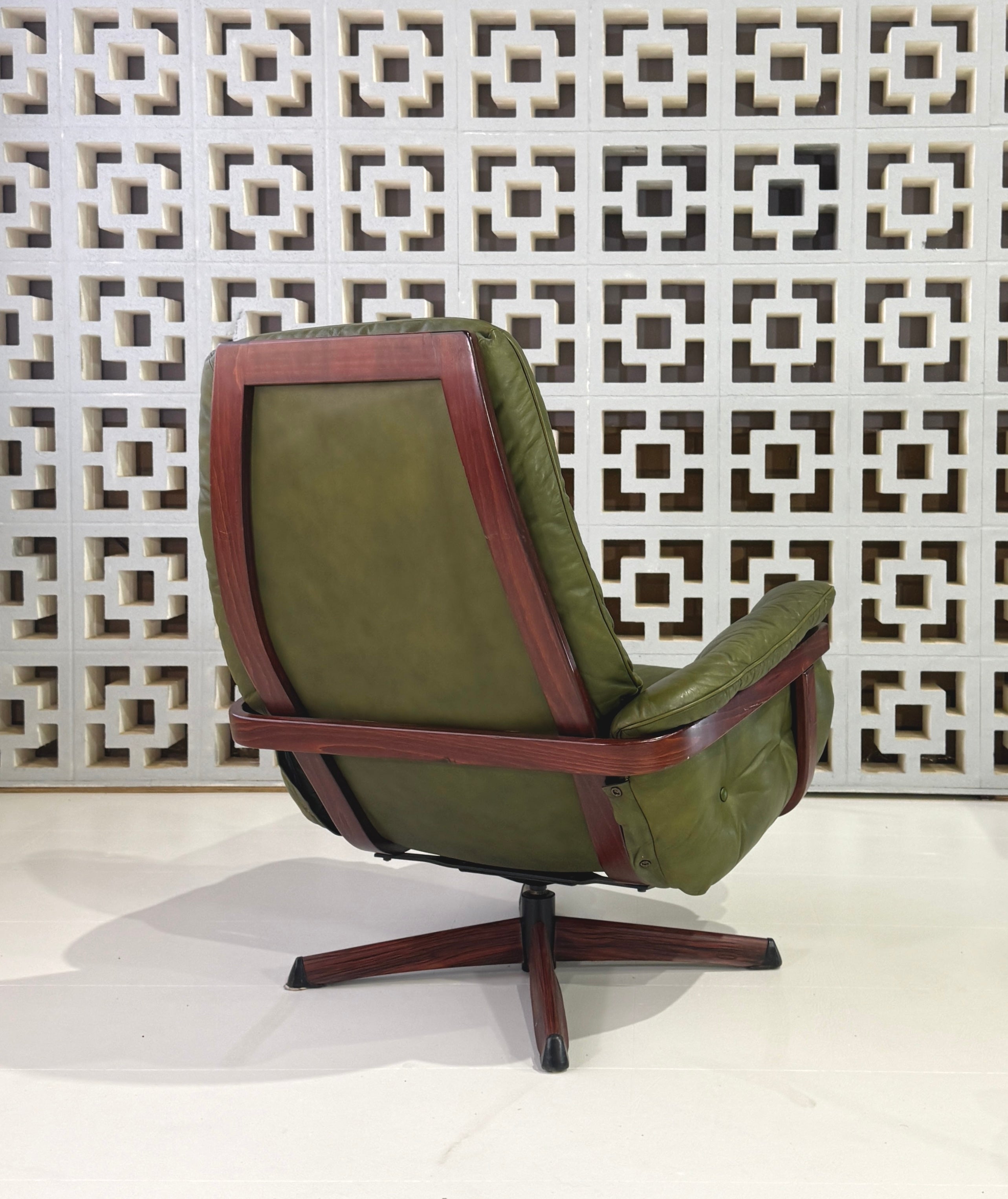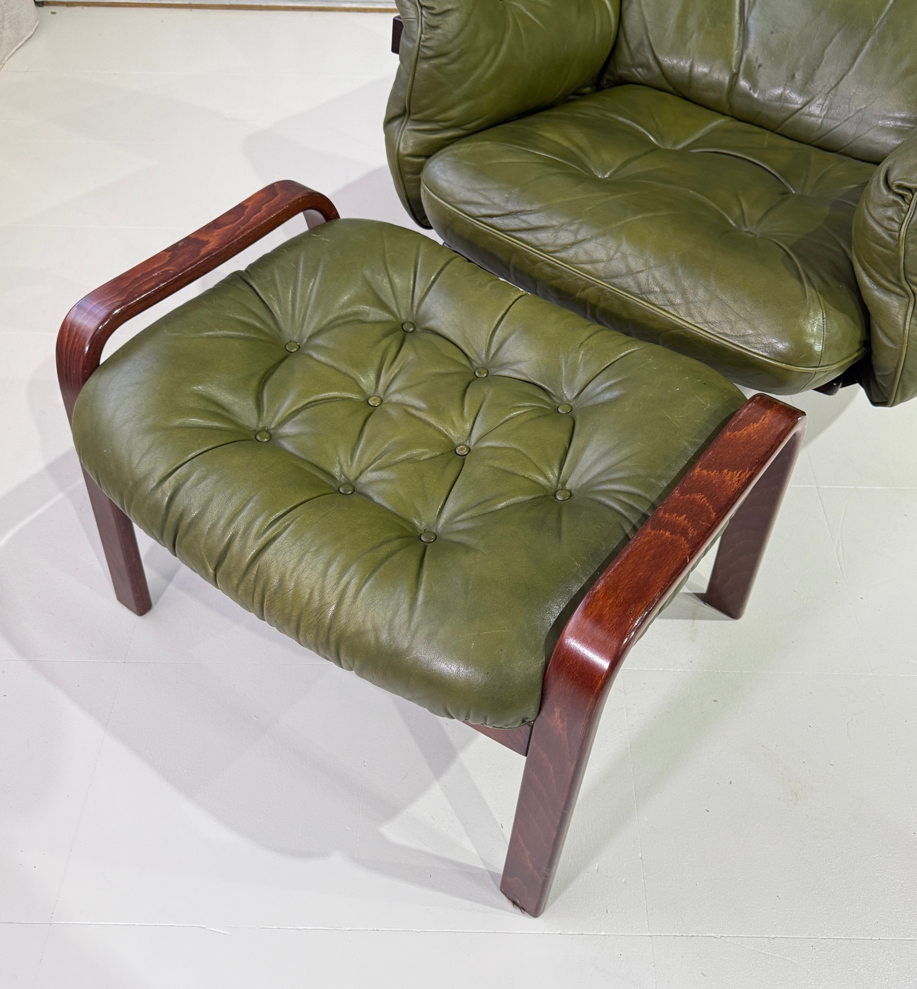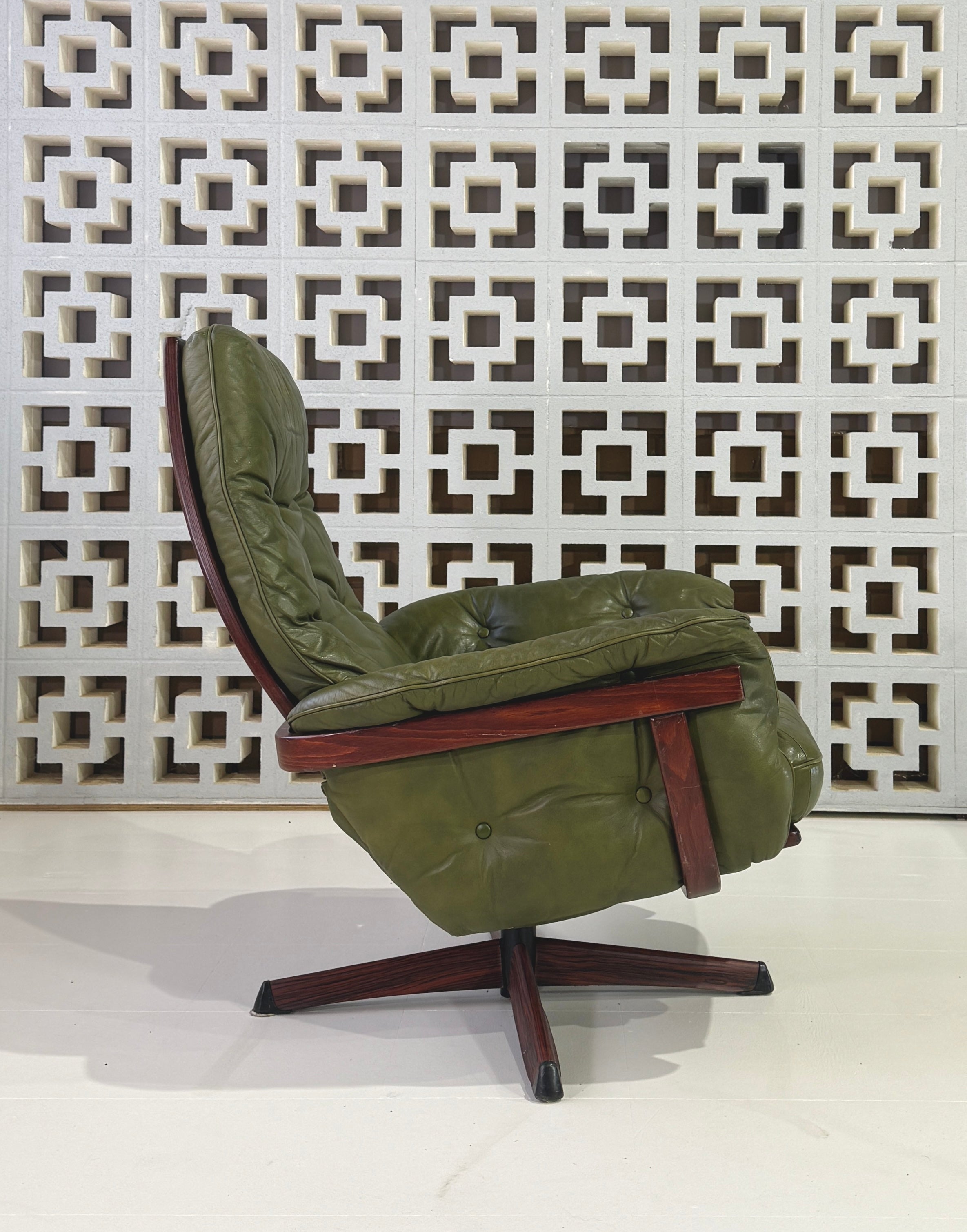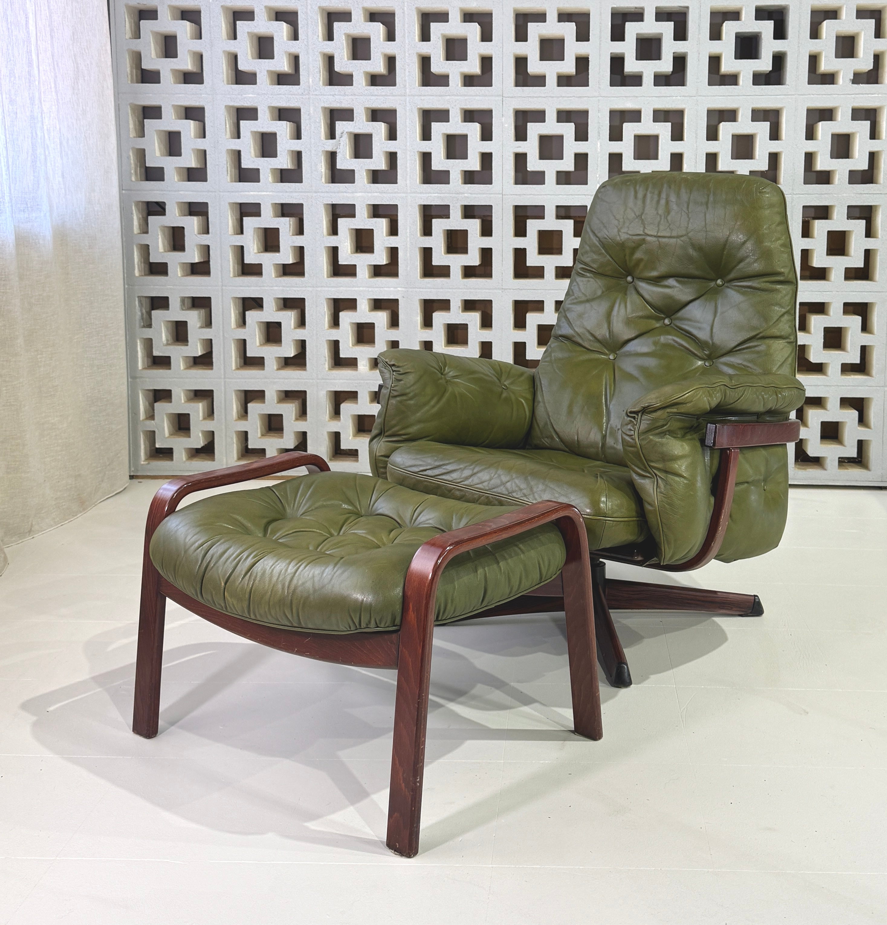 Striking swivel chair & footstool in green leather and with a rosewood finished frame.