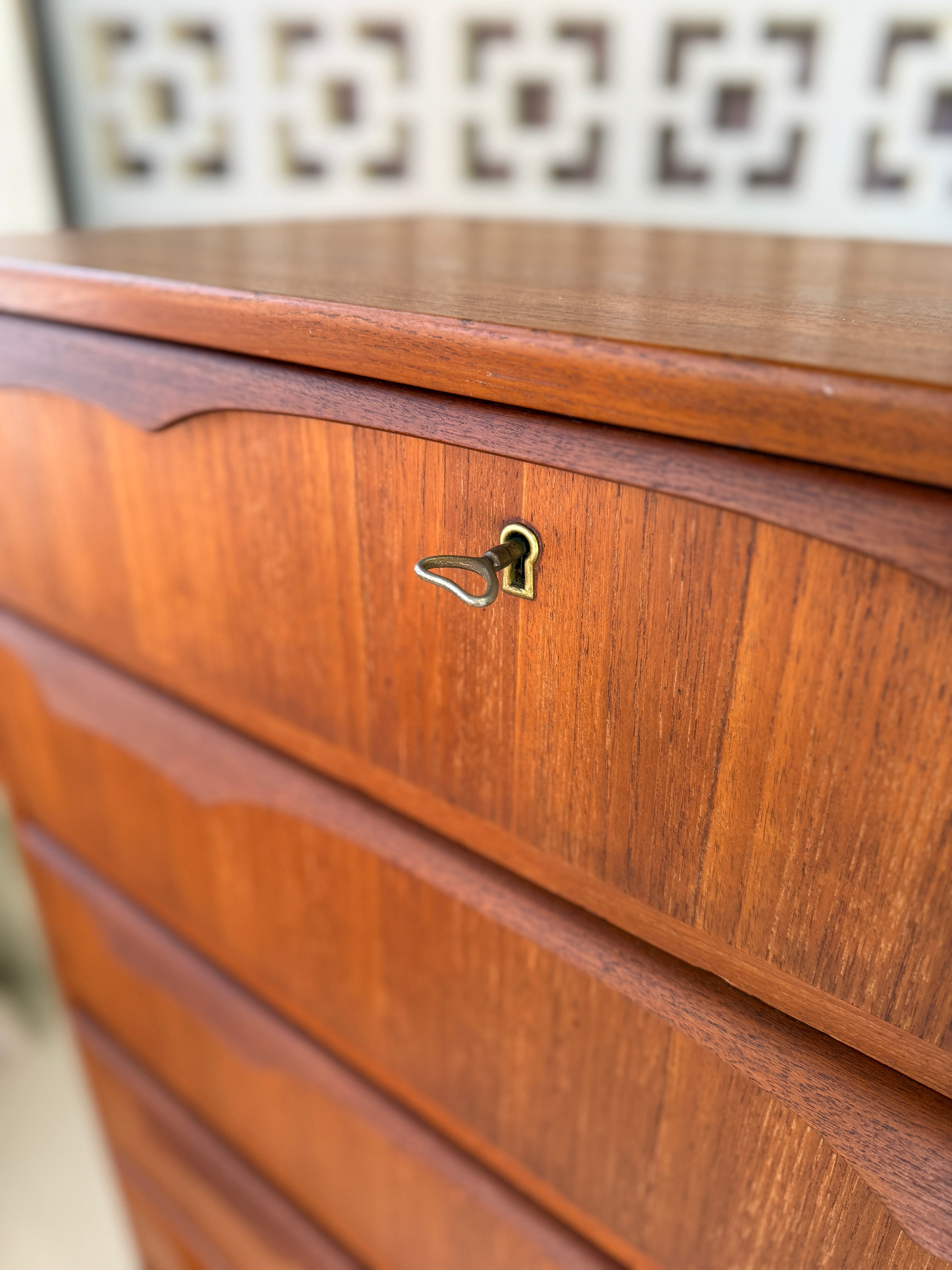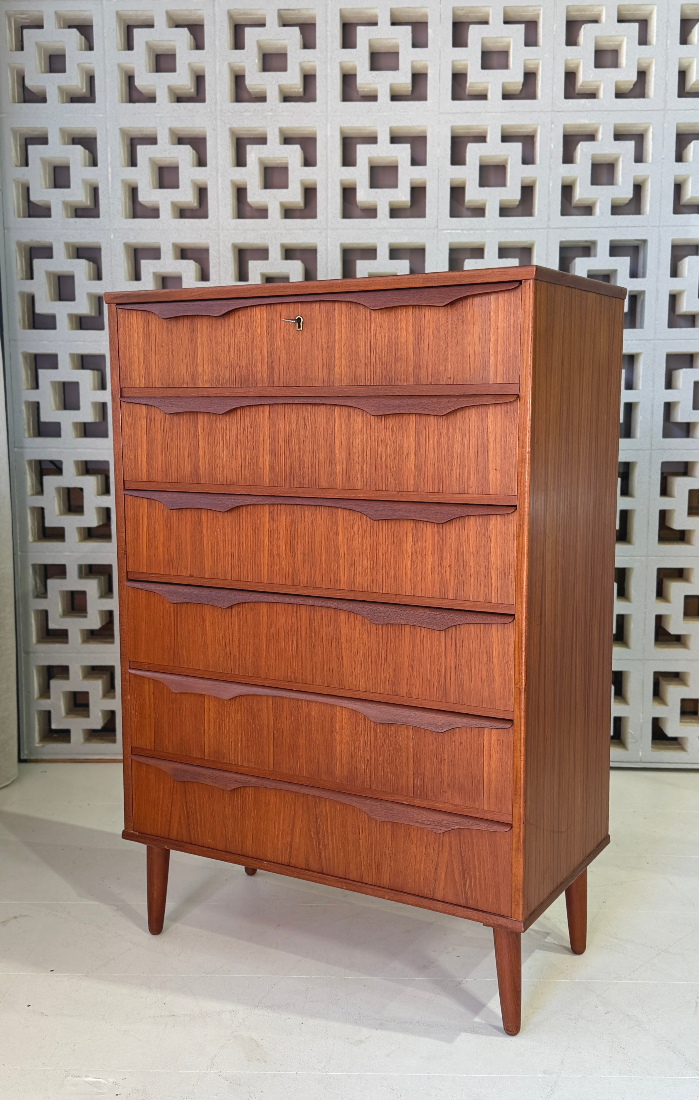 Tallboy in teak with twin blade handles. Features six generous drawers.