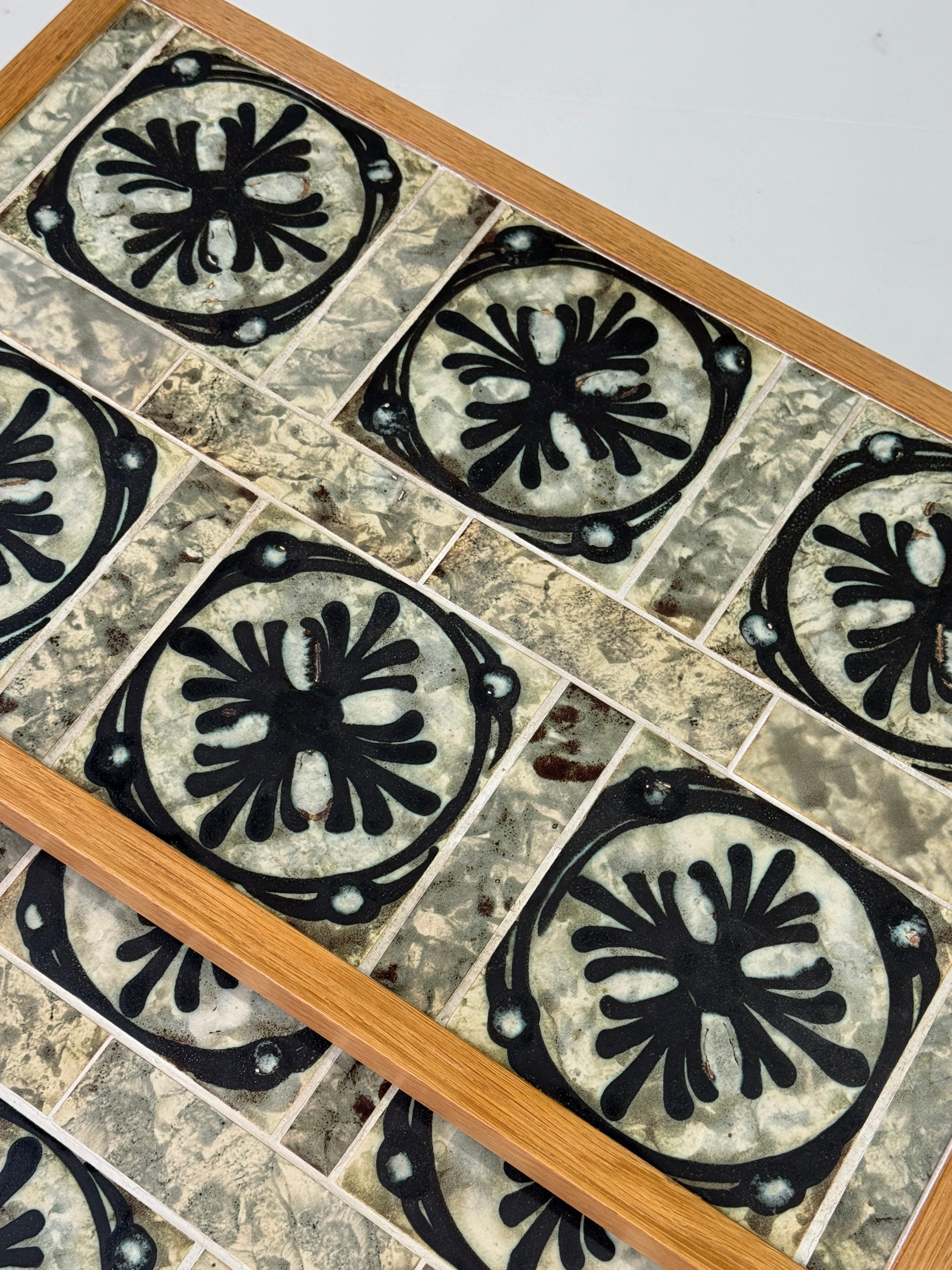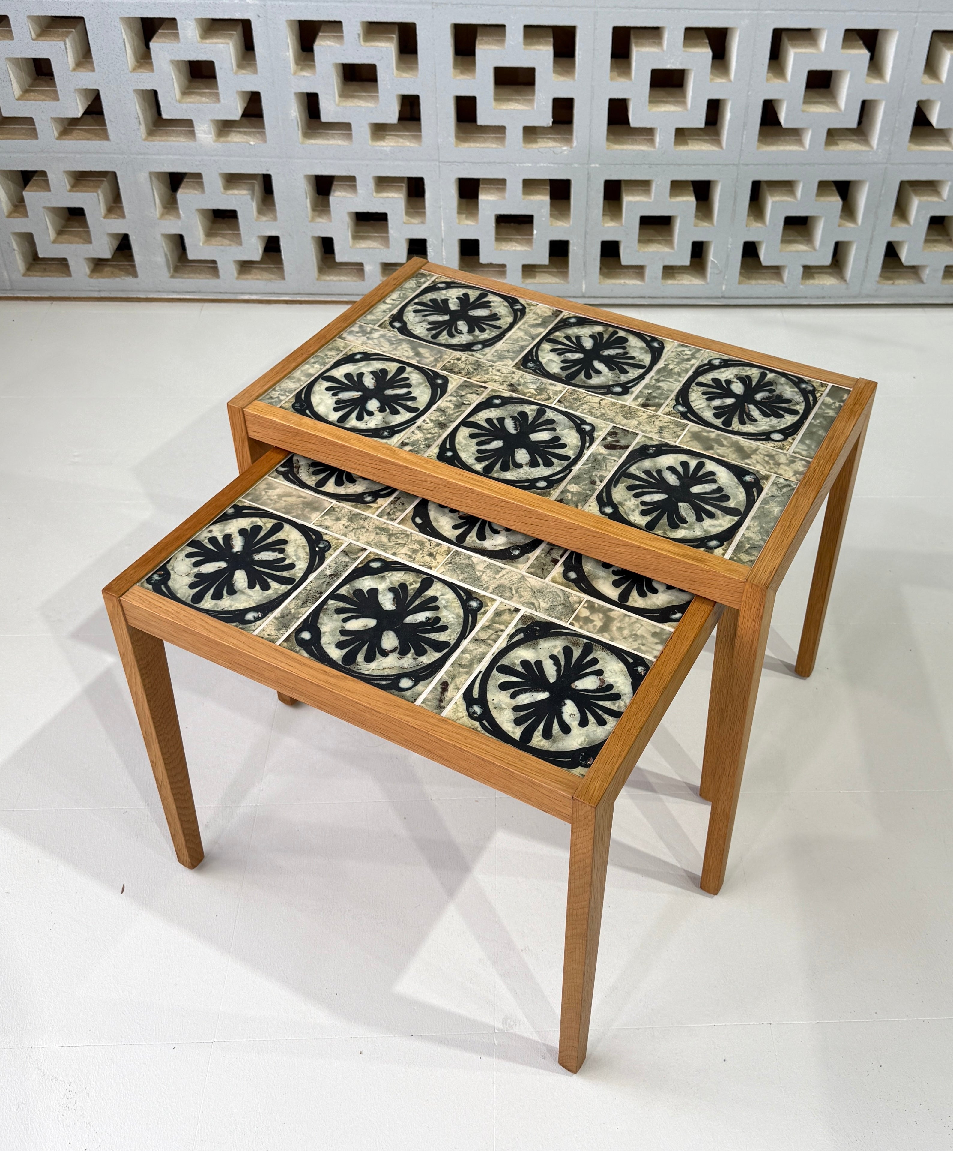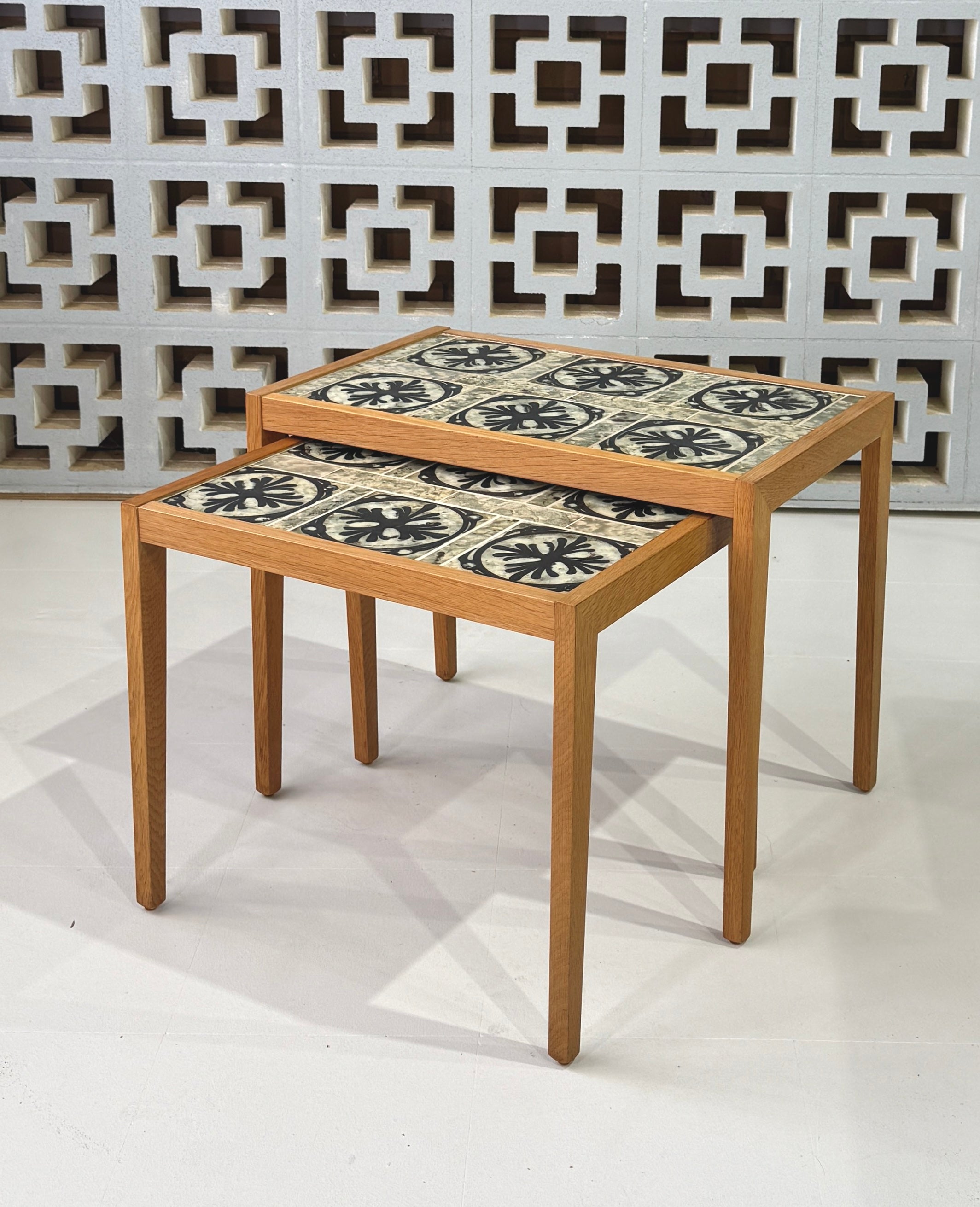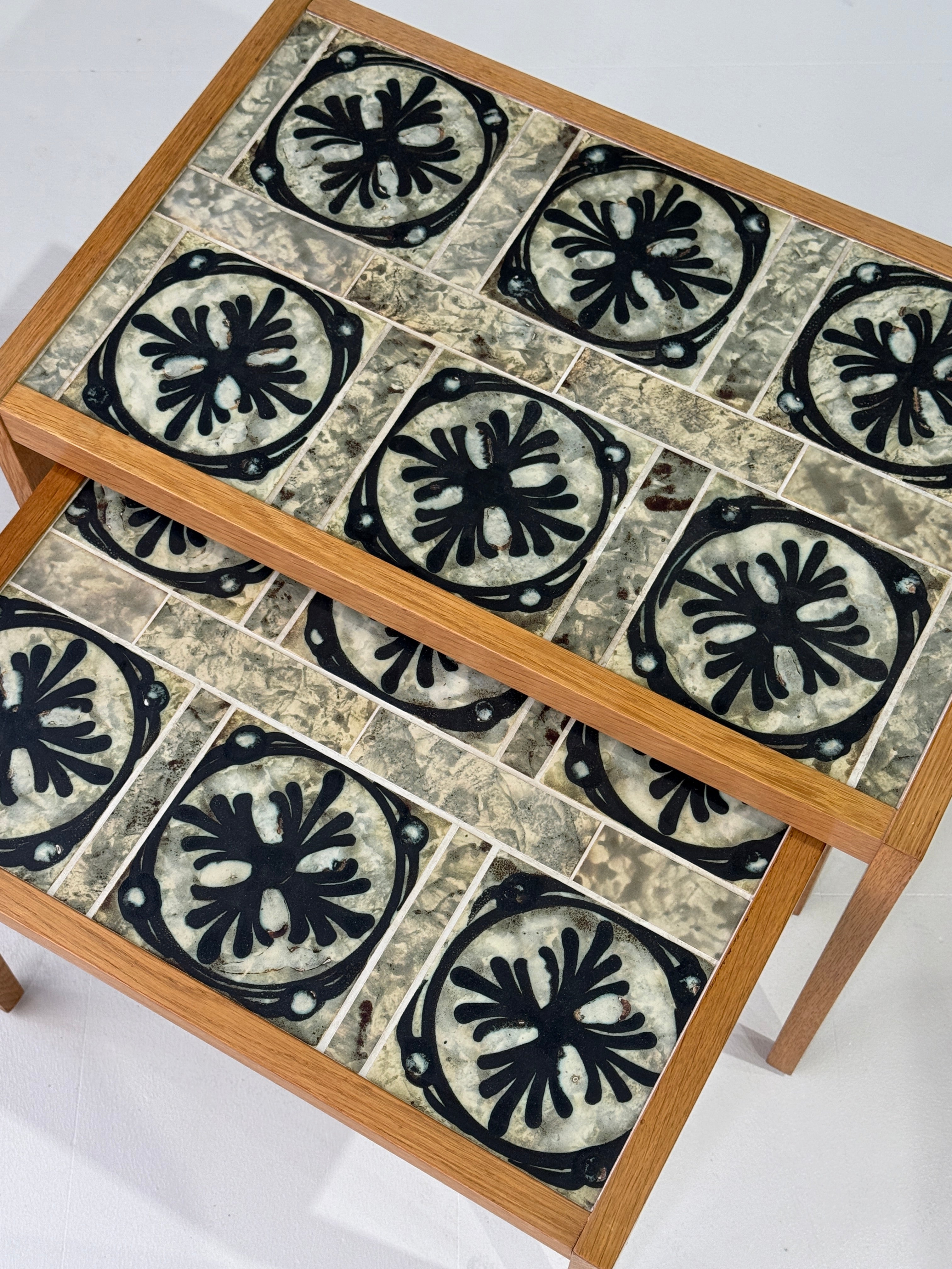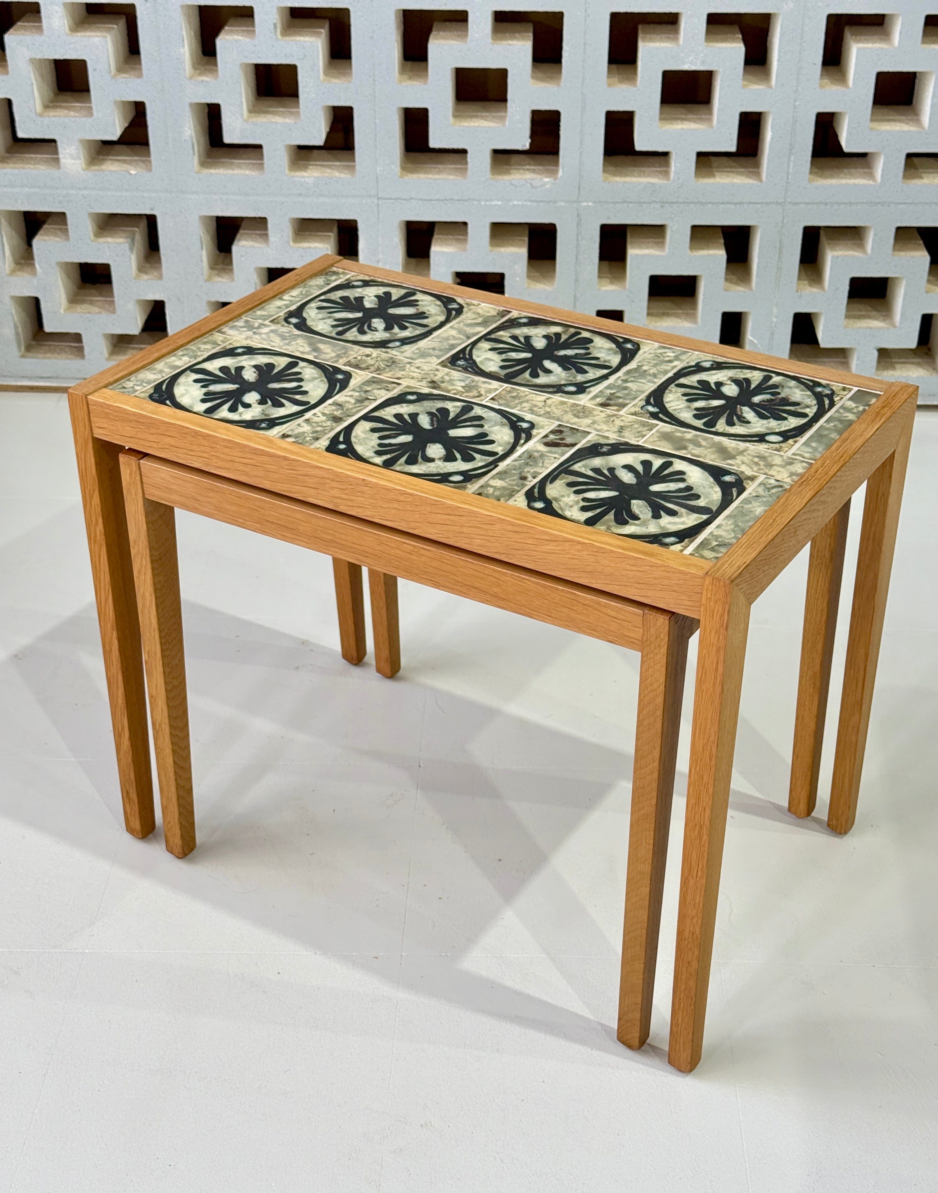 Graduating nest of tables in oak with tiles by ceramicist Tue Poulsen