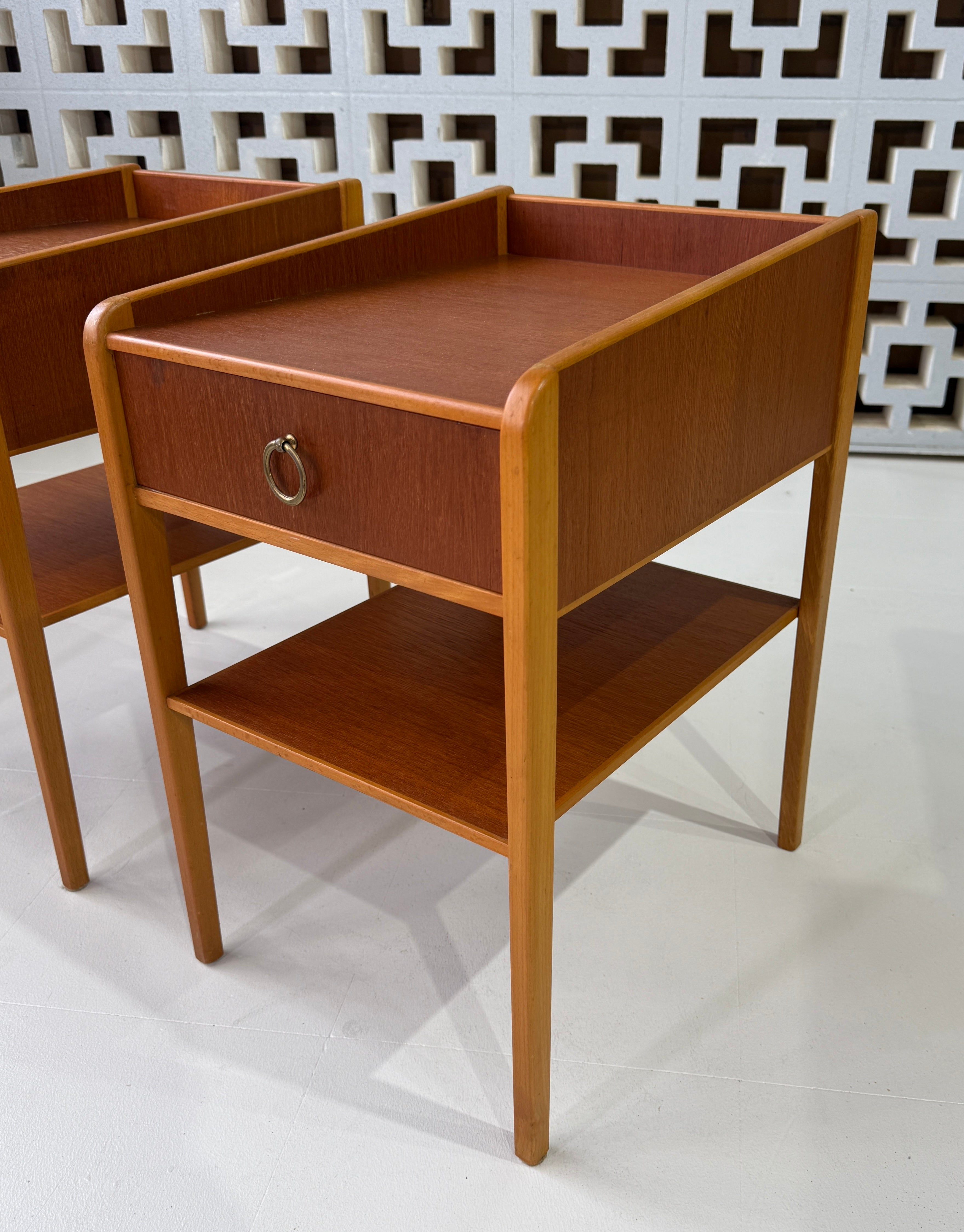 Pair of Swedish bedside tables in teak & with highlights in European beechwood.