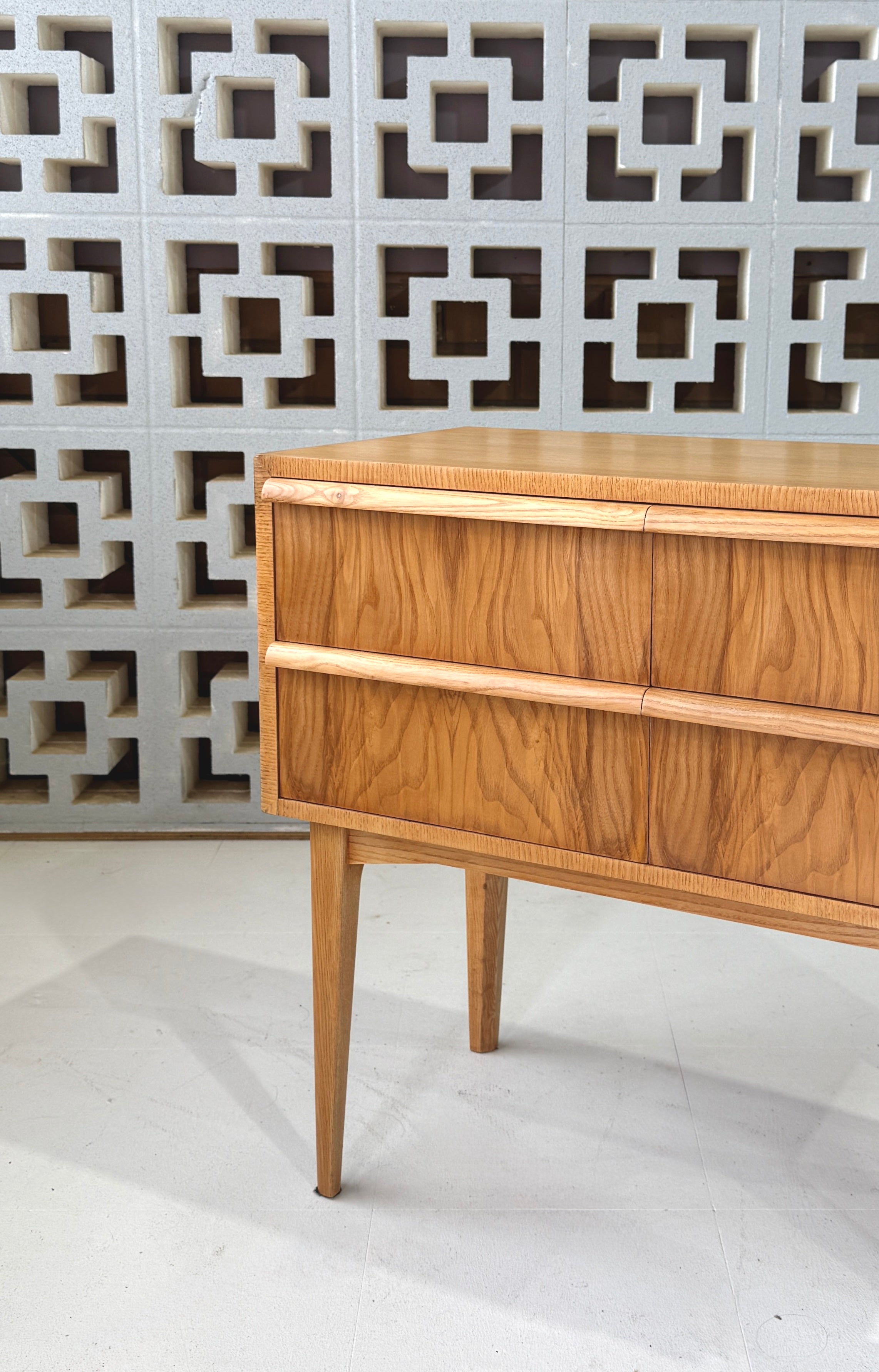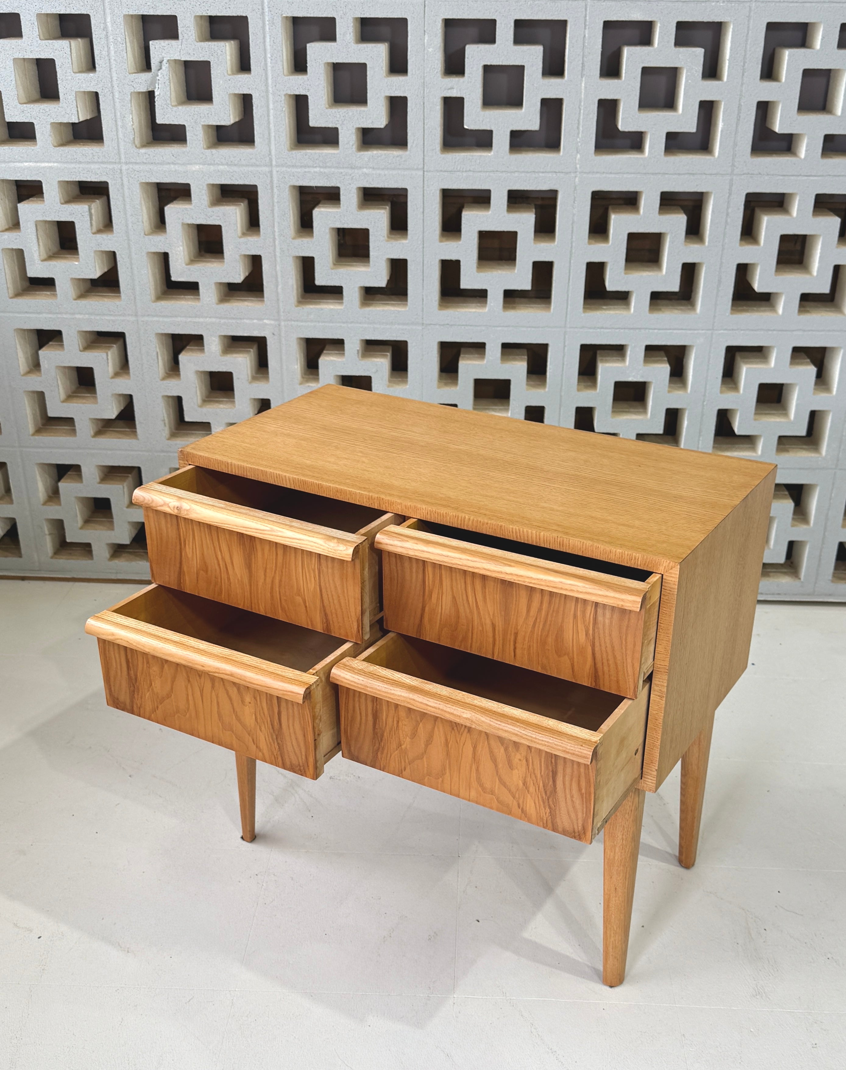 Single chest of drawers comprising of four individual drawers and elevated on a matching tapered elm base.