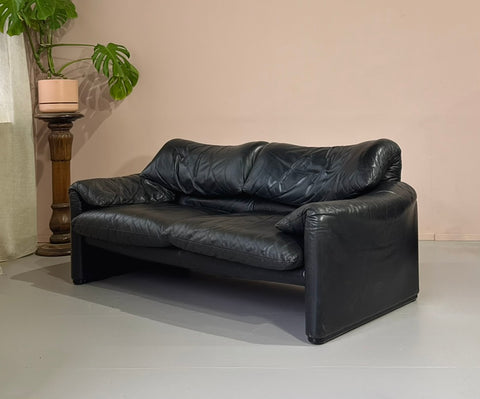 Coffee table with a sculptural leg base and with a black banded table top.