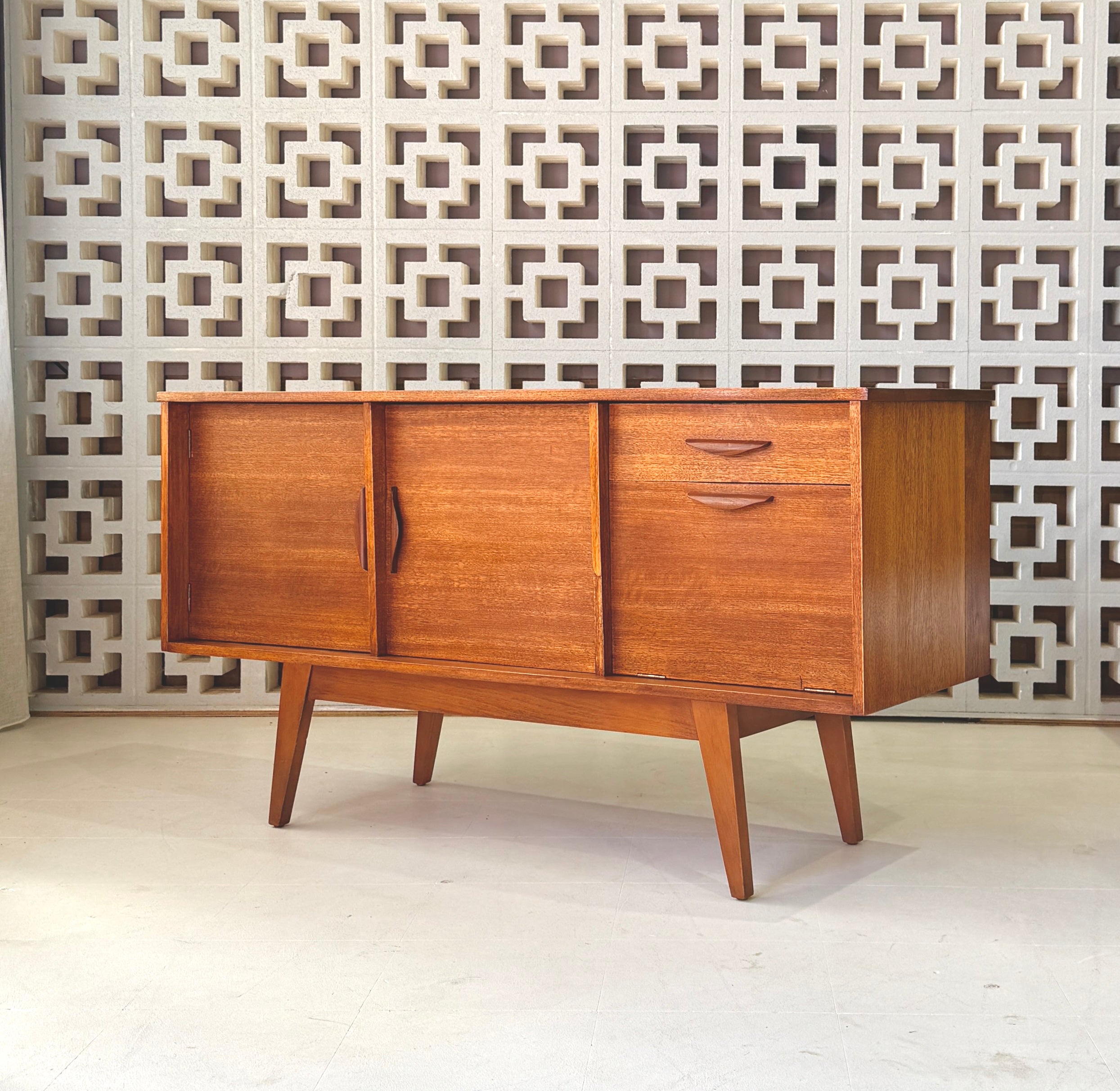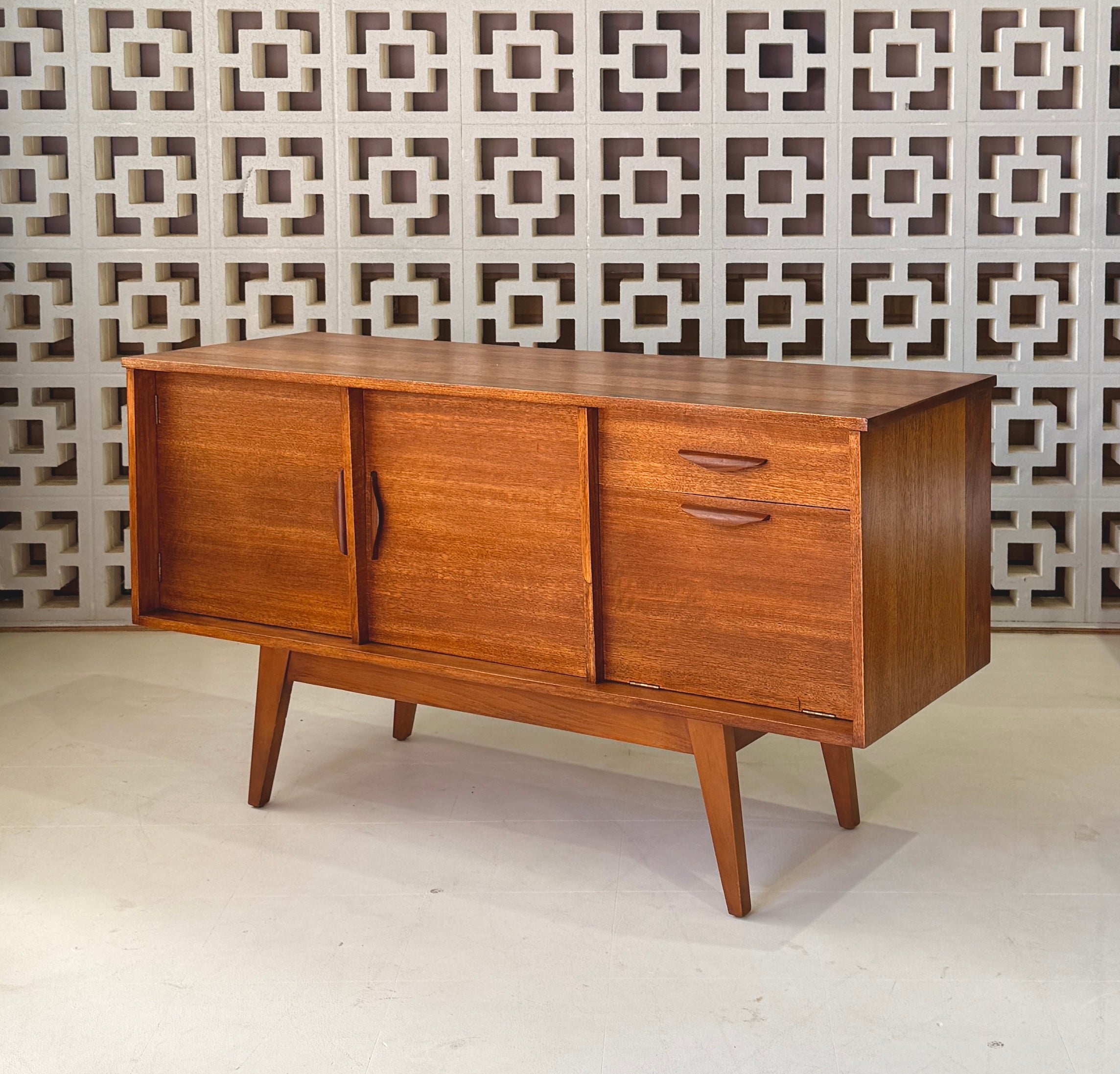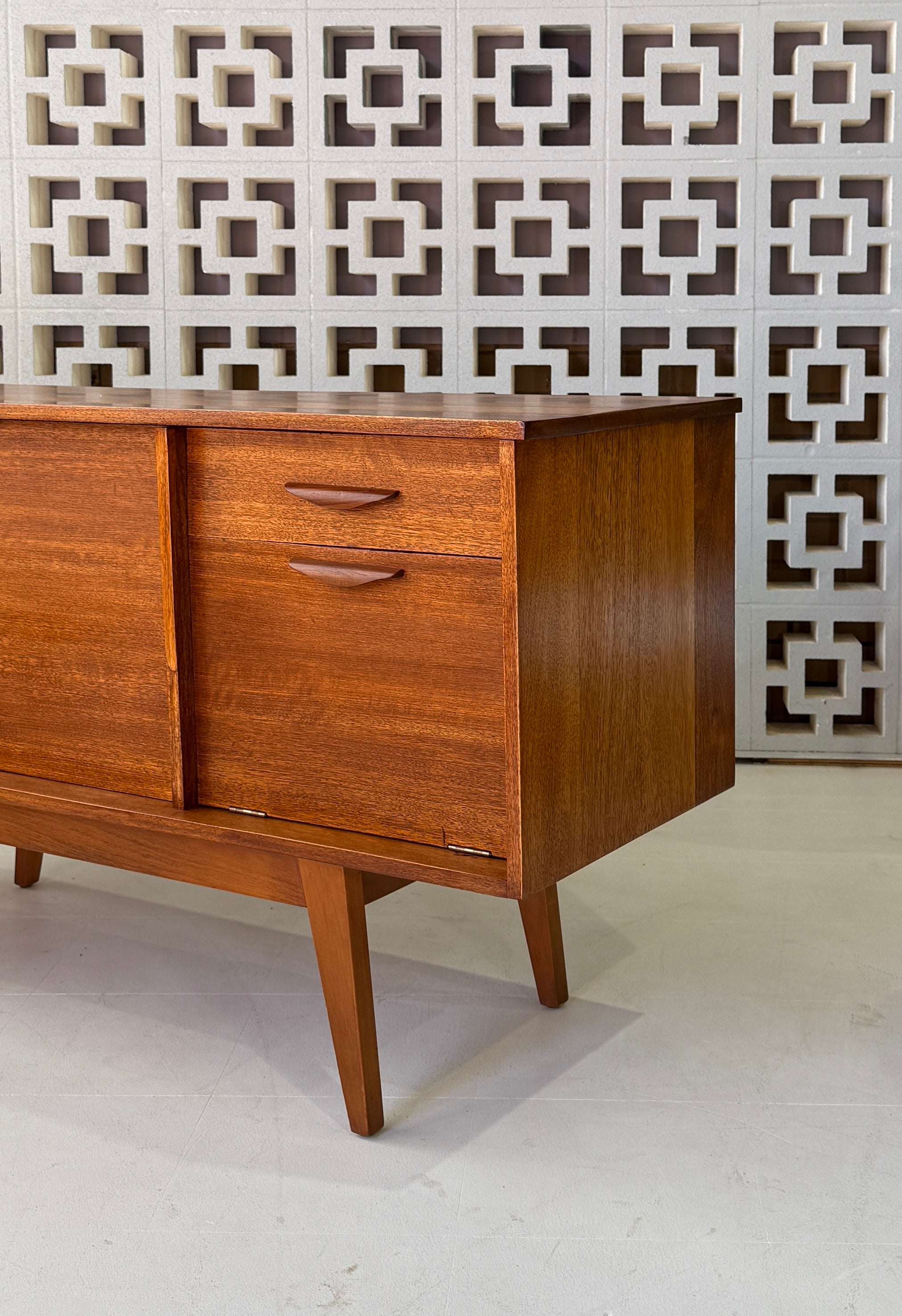 Custom and locally made sideboard in eucalyptus with two swing doors on the left and a single drawer above a drop down bar area on the right
