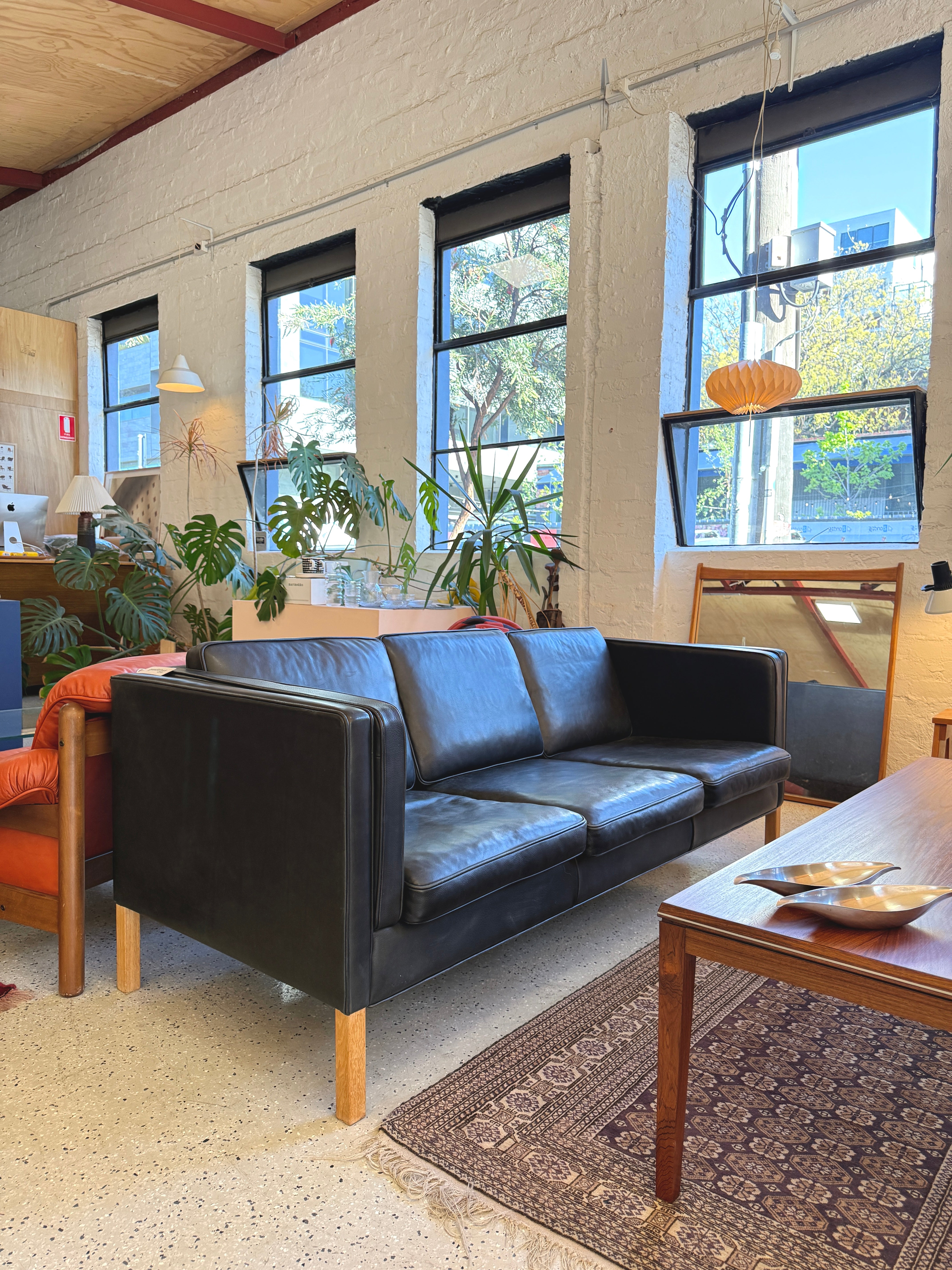 Wonderful sofa in a quality black / charcoal leather and elevated on European oak legs.