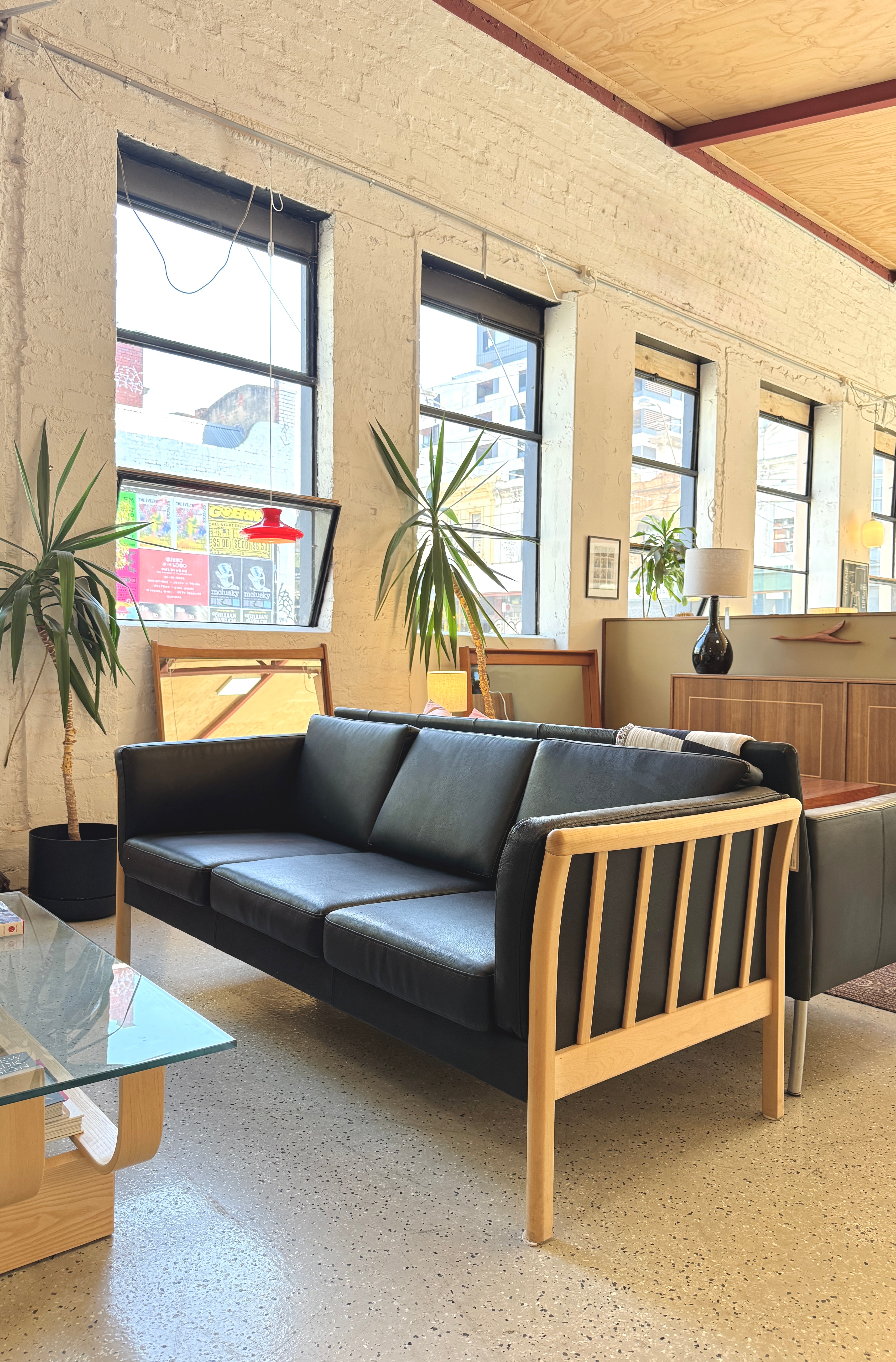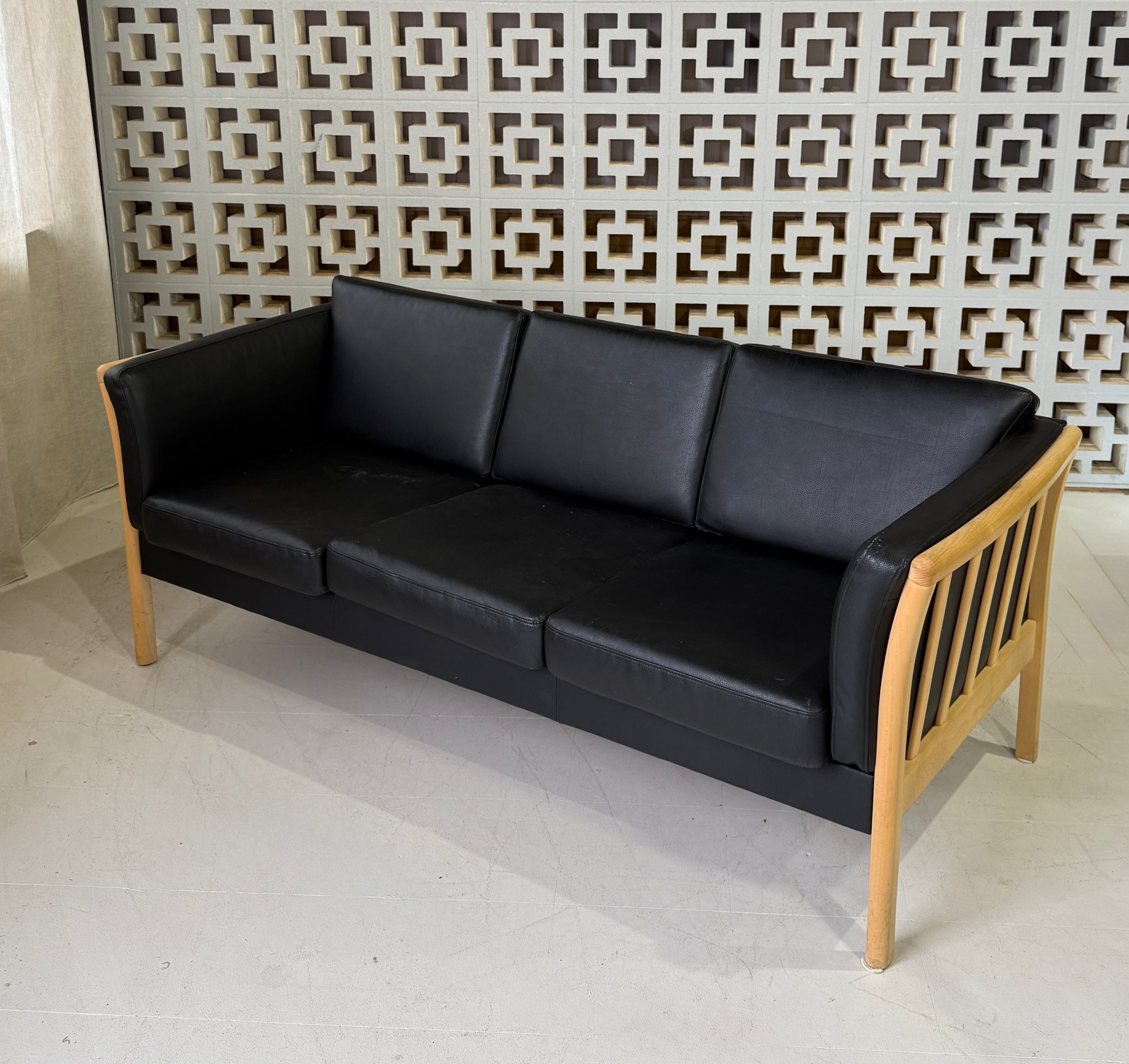 Classic shaped Danish sofa in a quality black leather and within a beechwood frame.