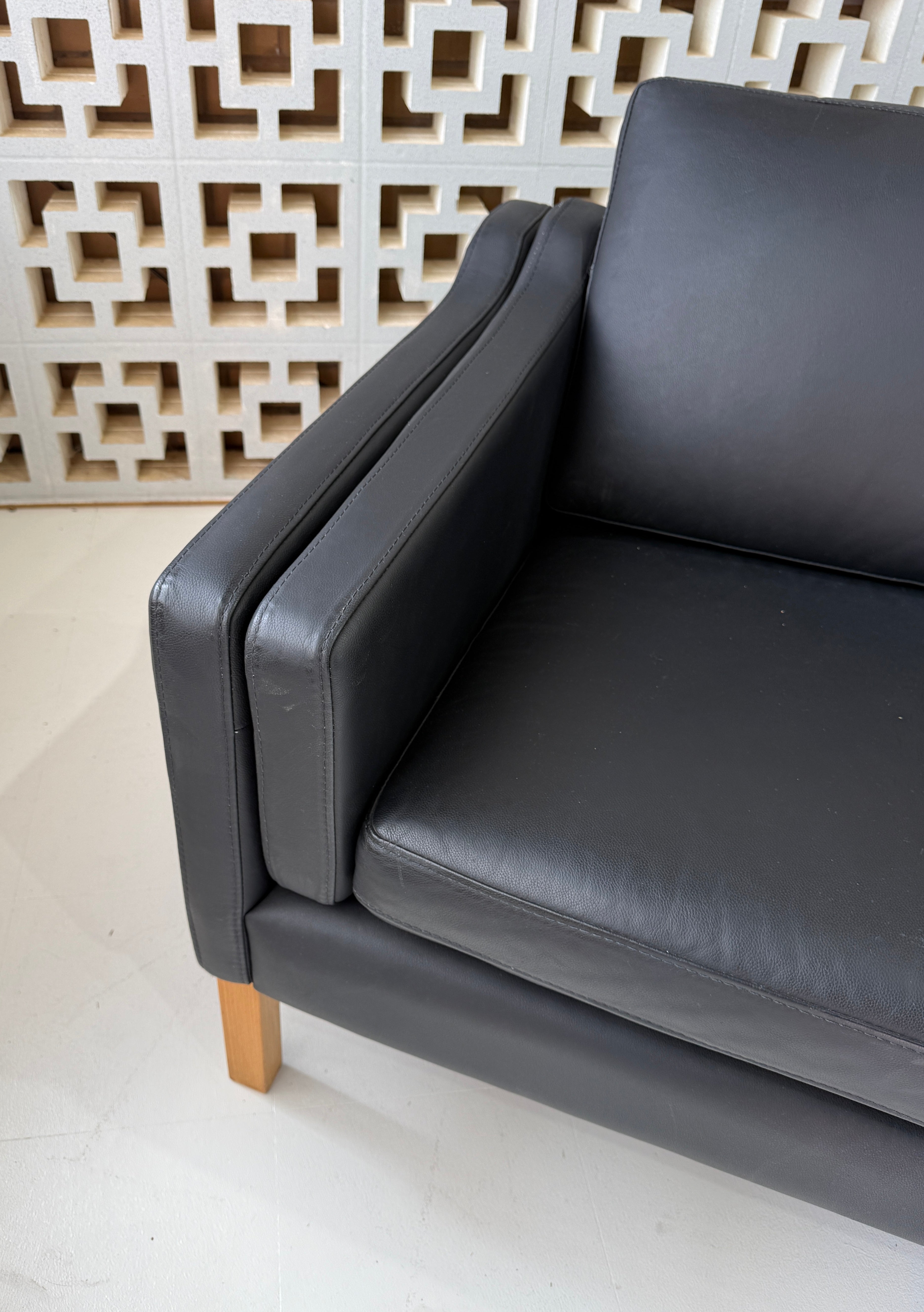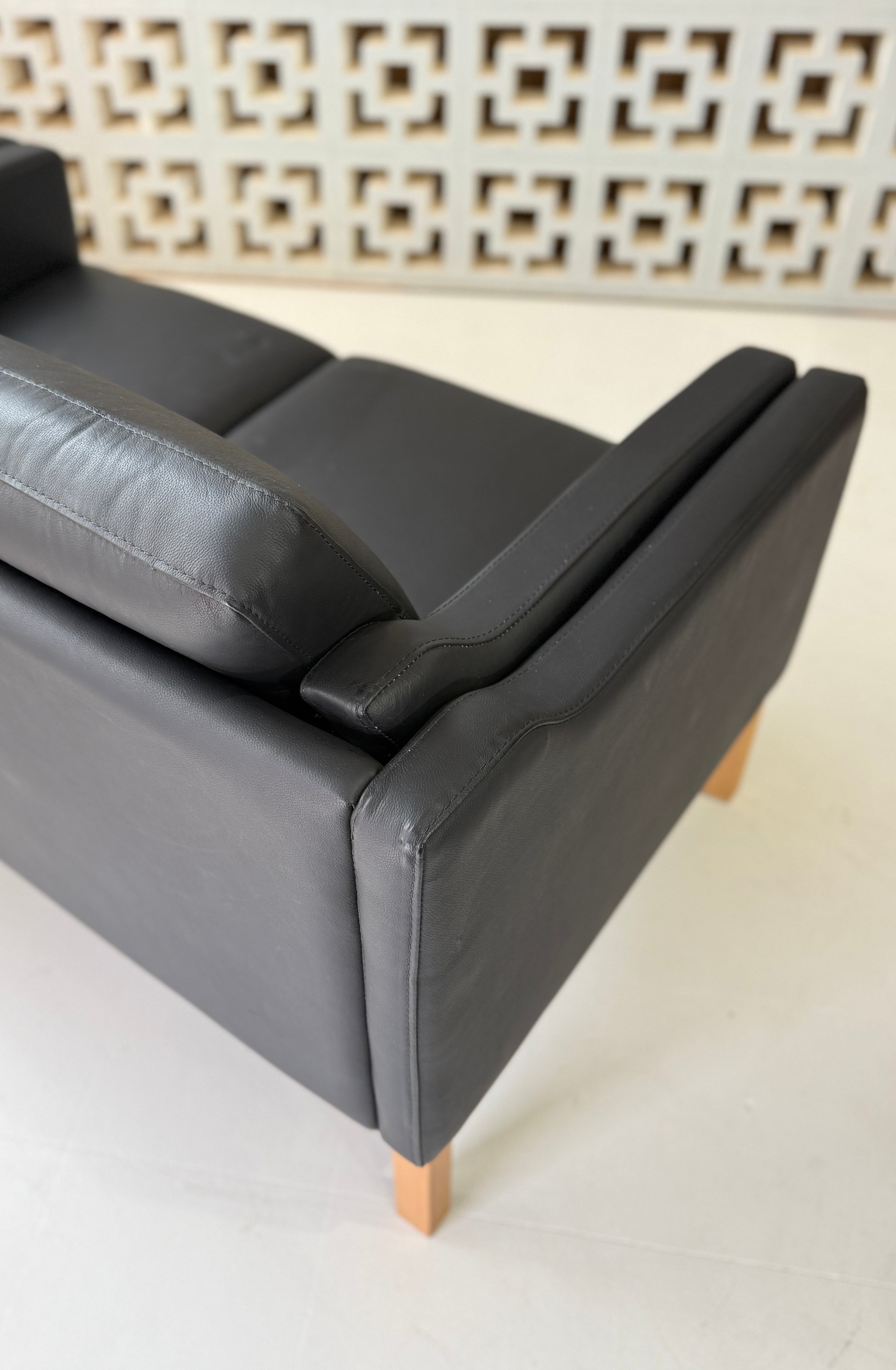 Classic shaped Danish sofa in black leather and elevated on beech legs.