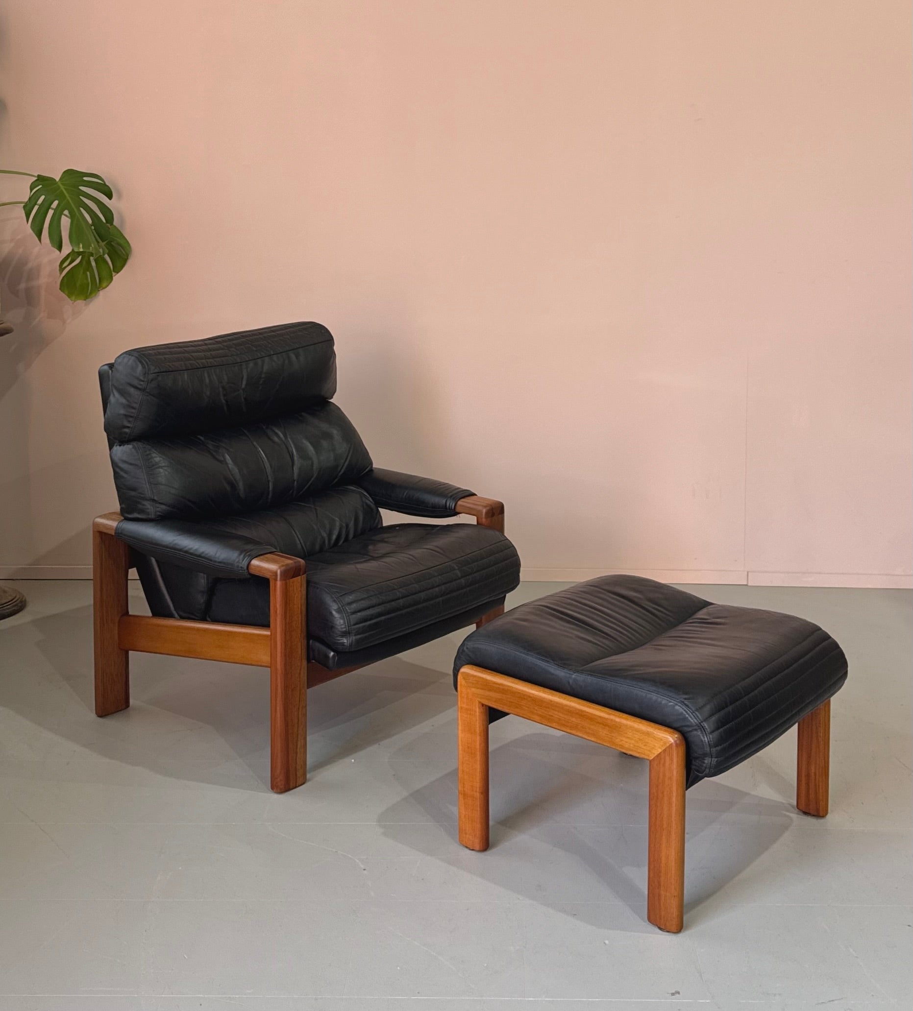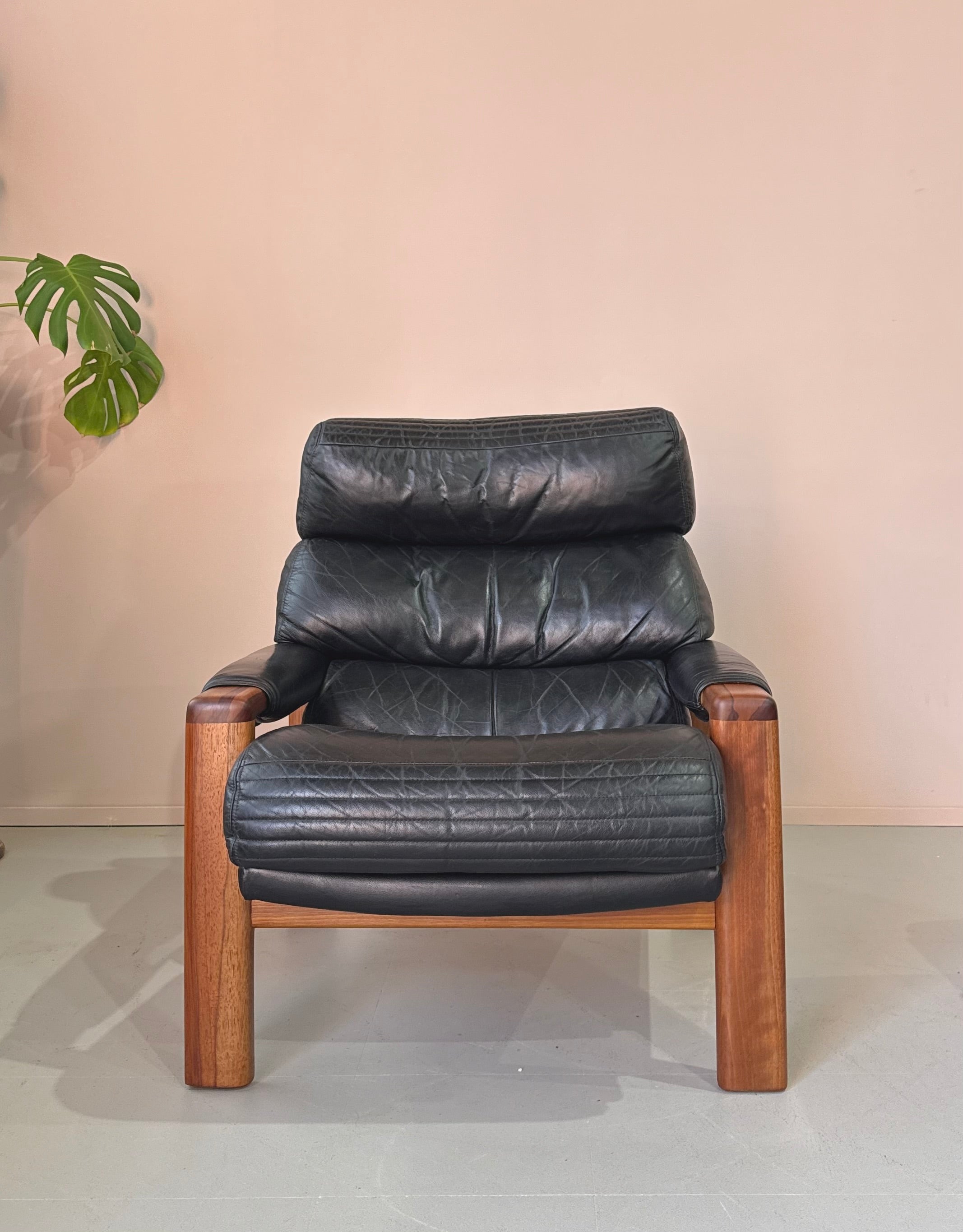 Rarely seen, low-profile lounge chair and footstool in original black leather and on a Tasmanian Blackwood frame.