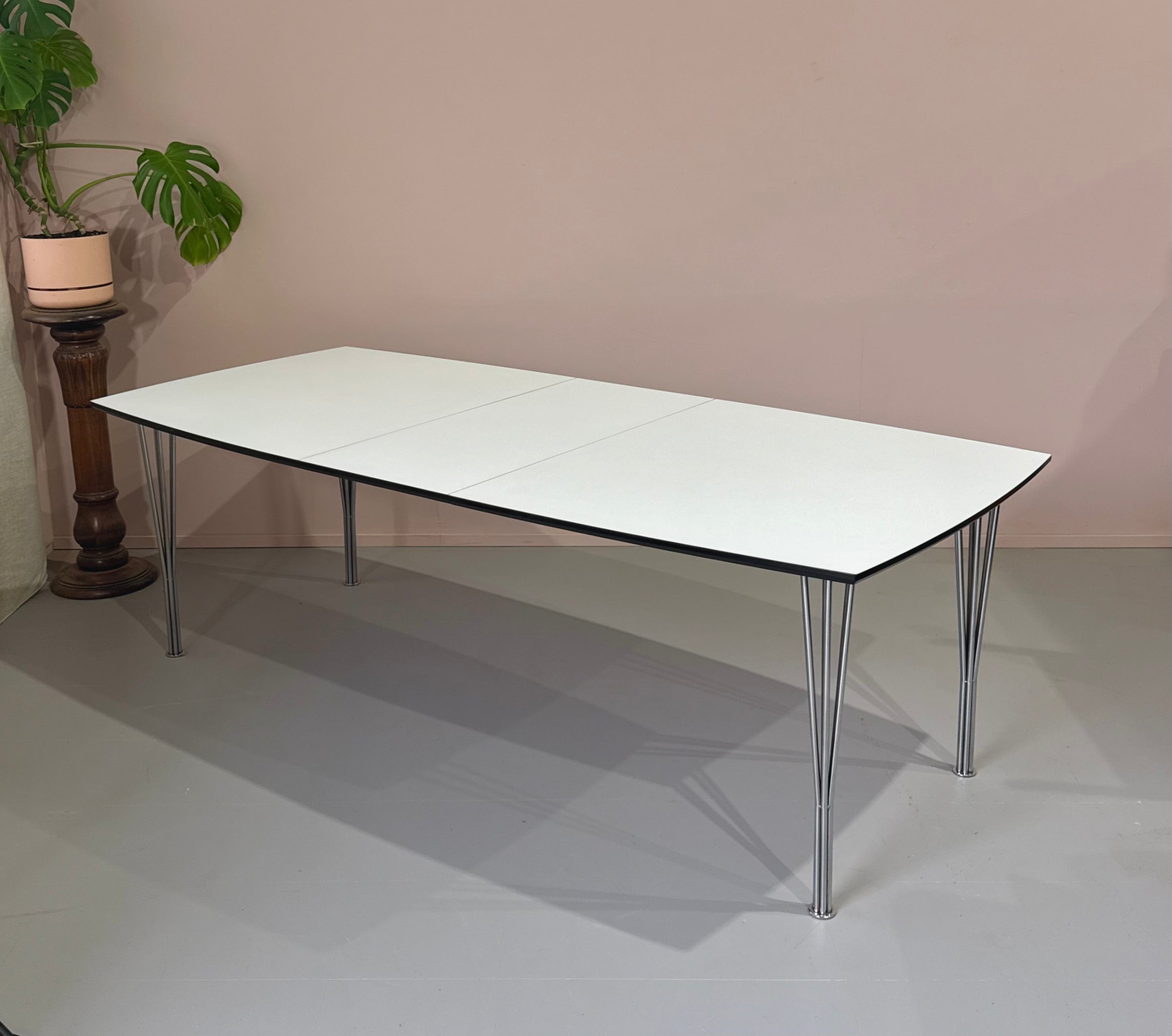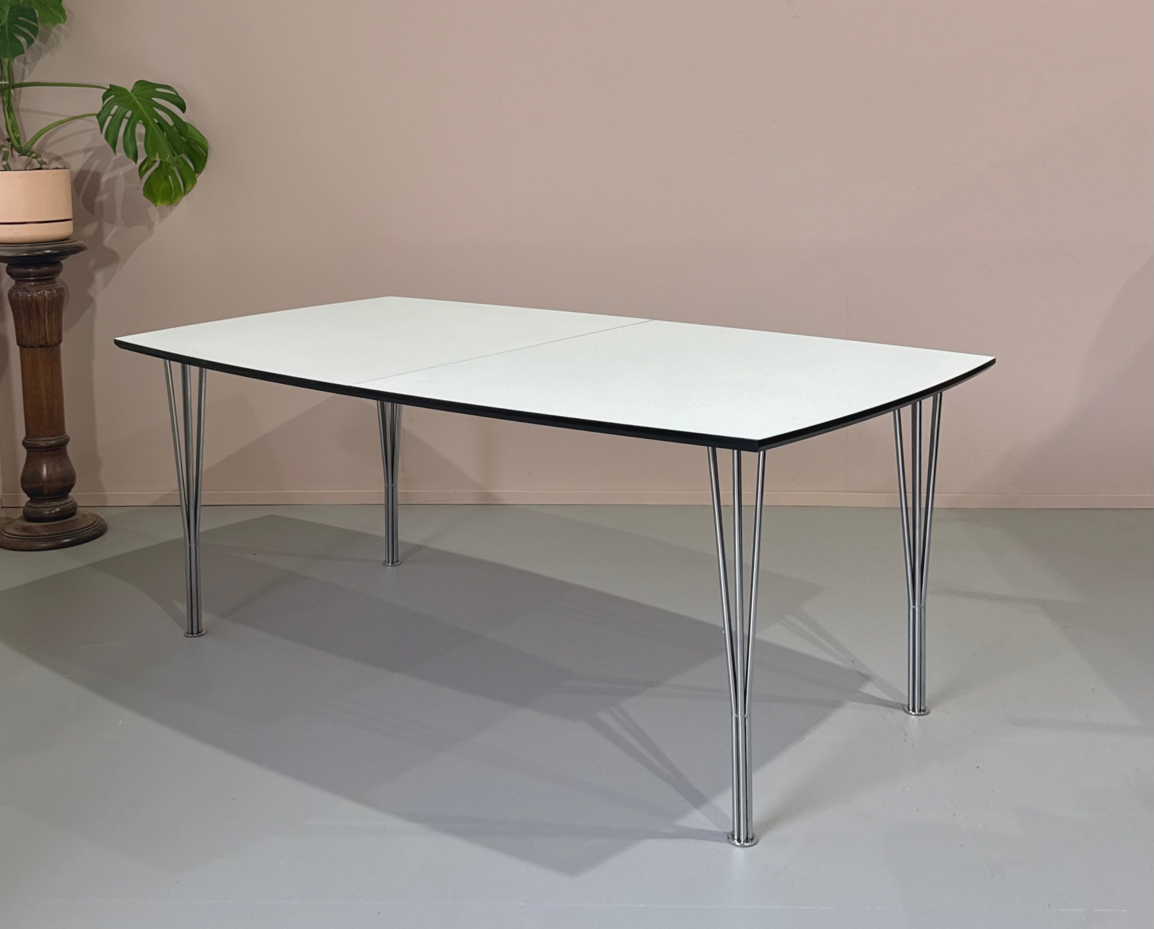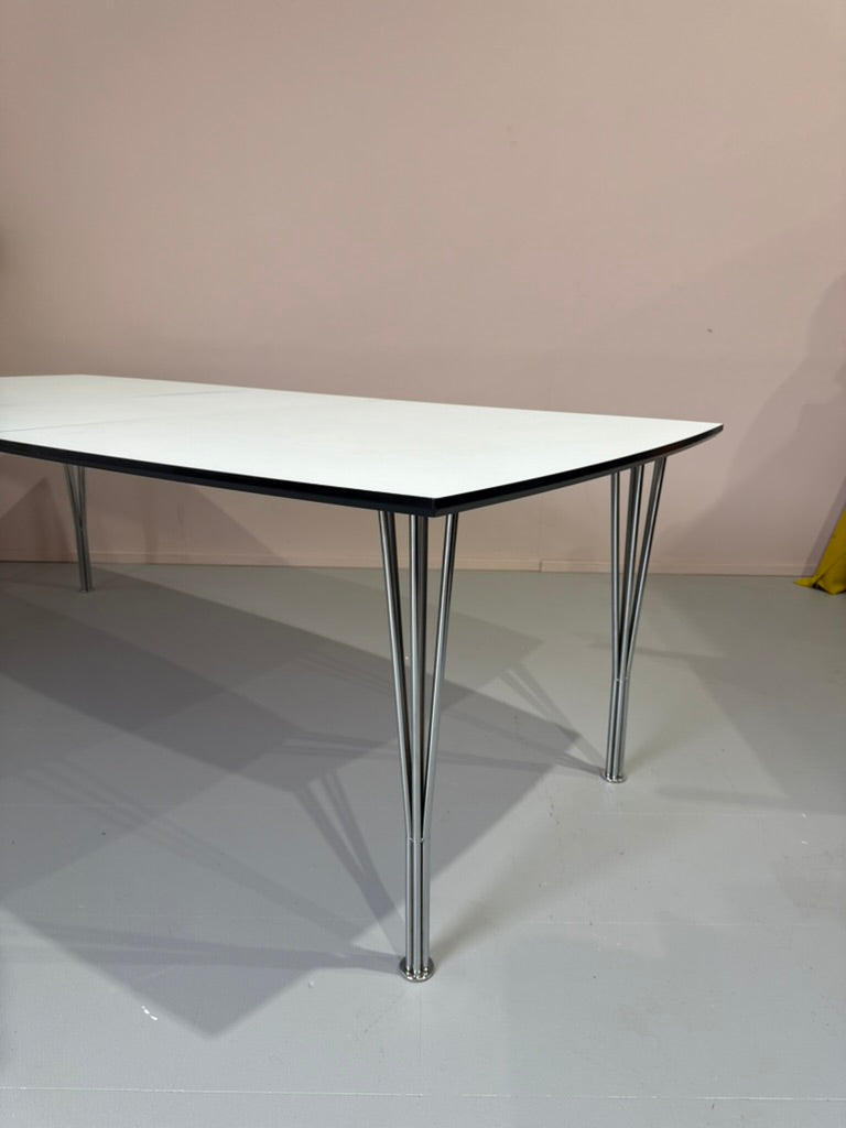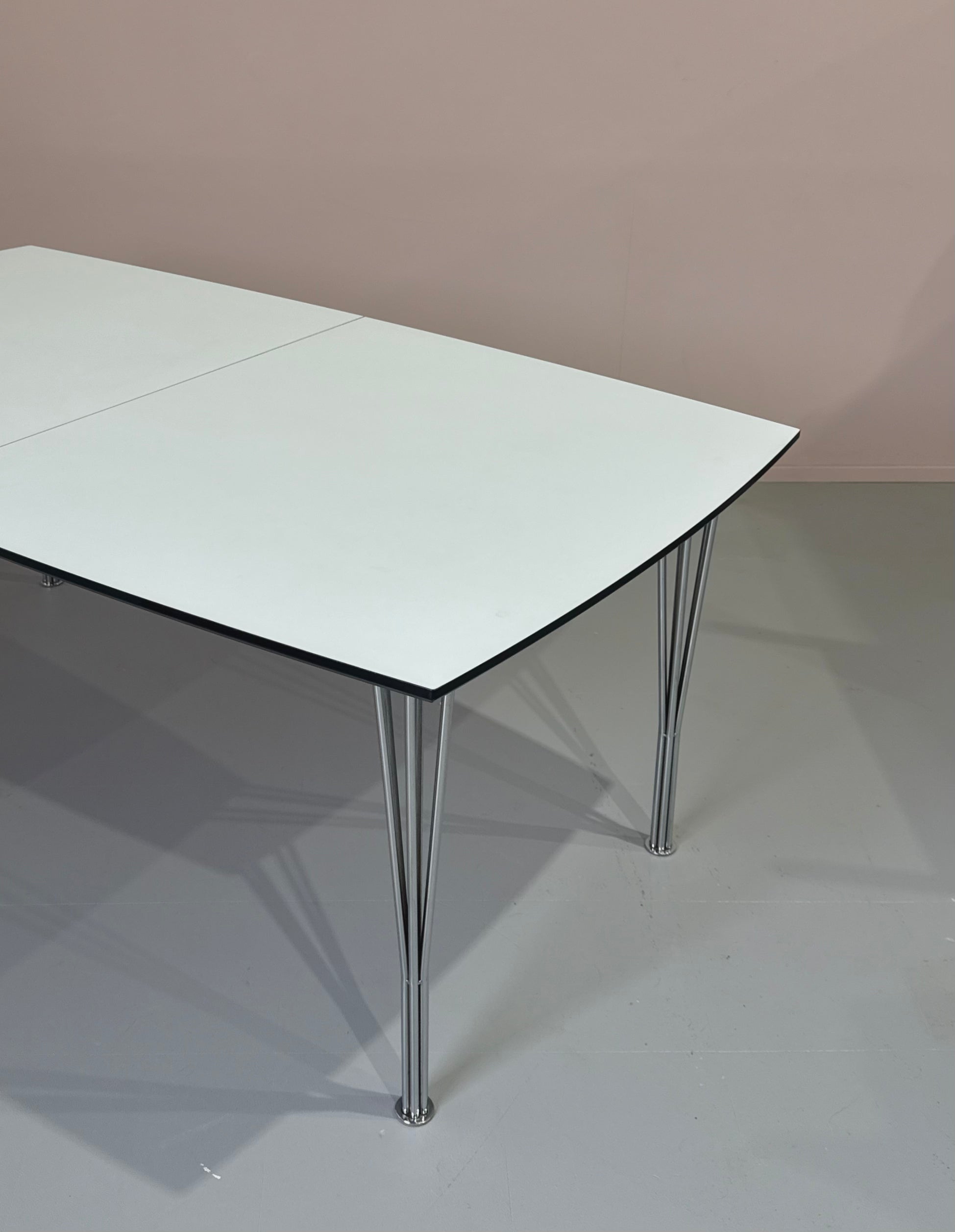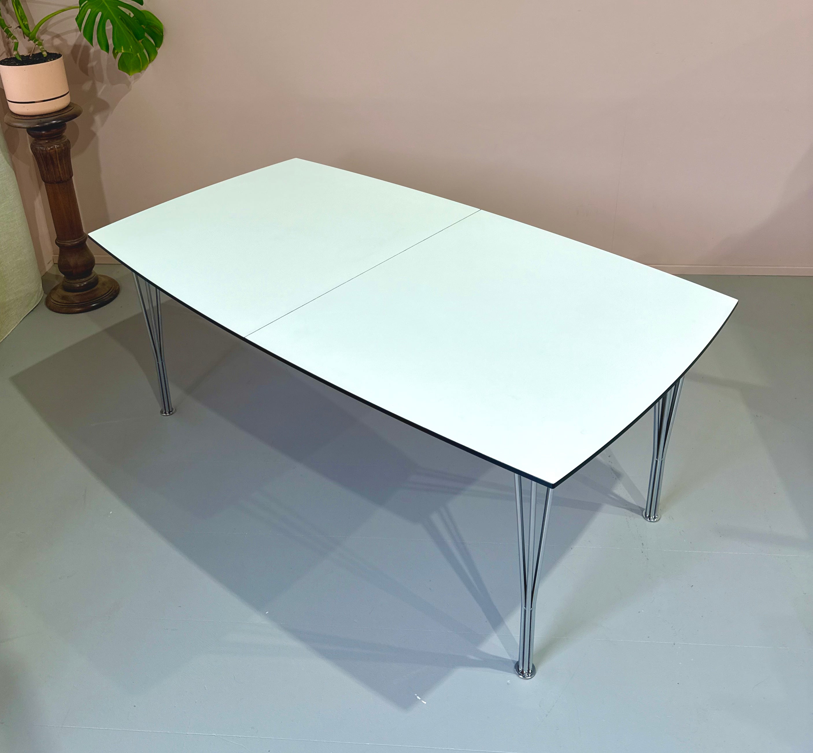 Impressive extension dining table in white laminate and with chrome plated split rod legs.