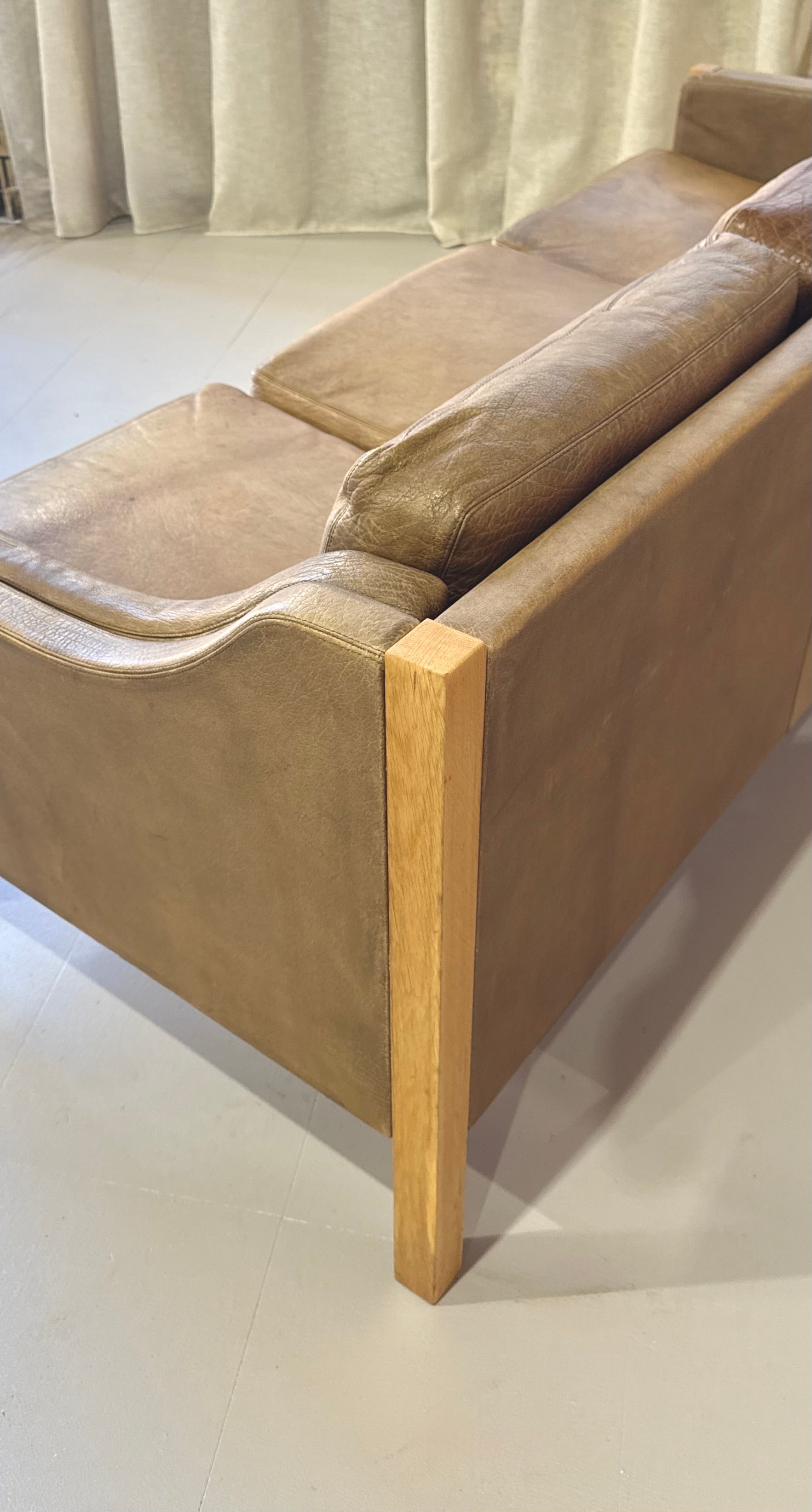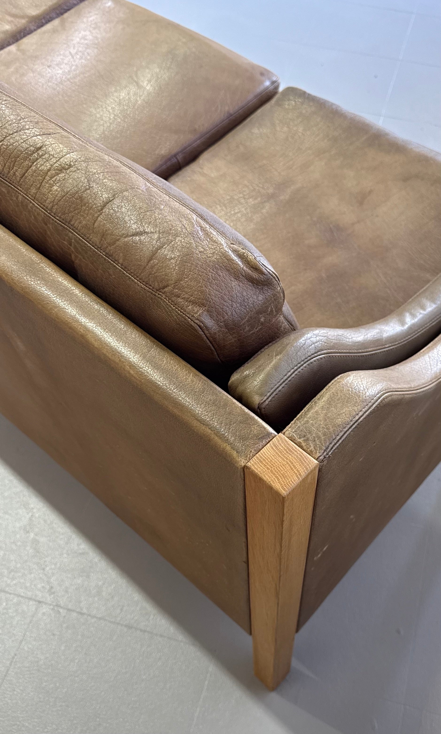 Incredible sofa in patinated leather and with a European oak frame.