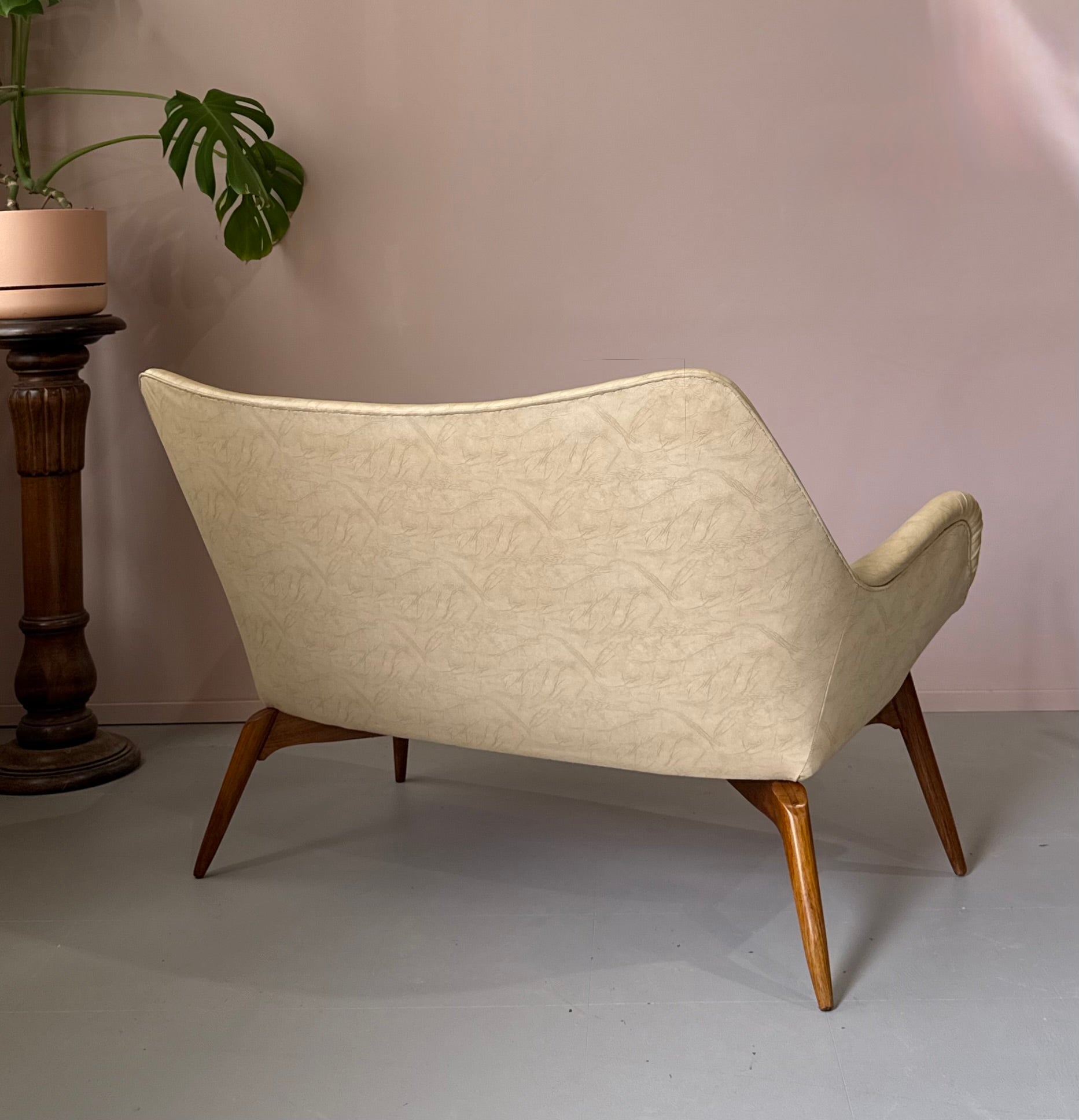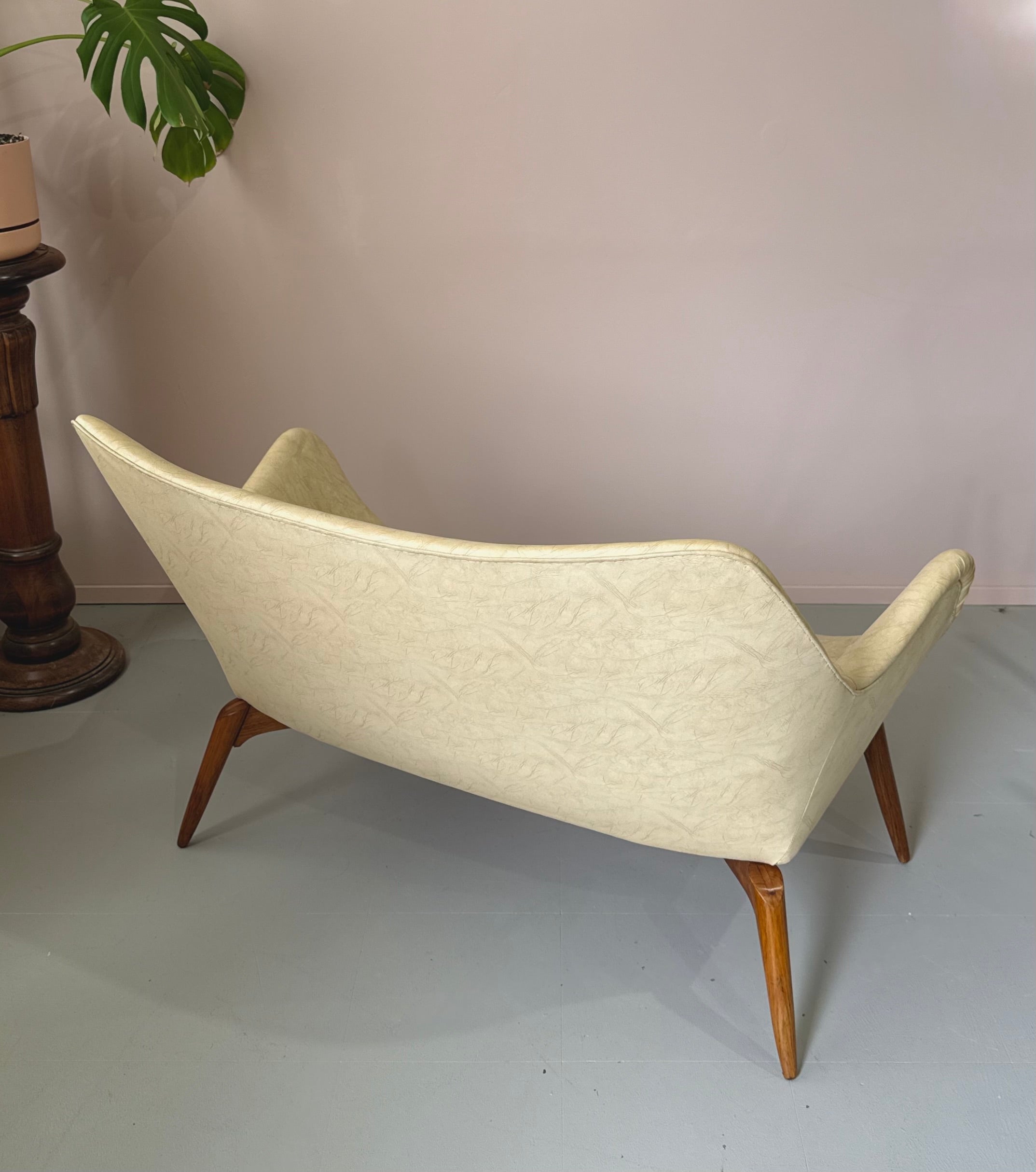 Iconic settee from Featherston’s contour series in the original textured vinyl upholstery.
