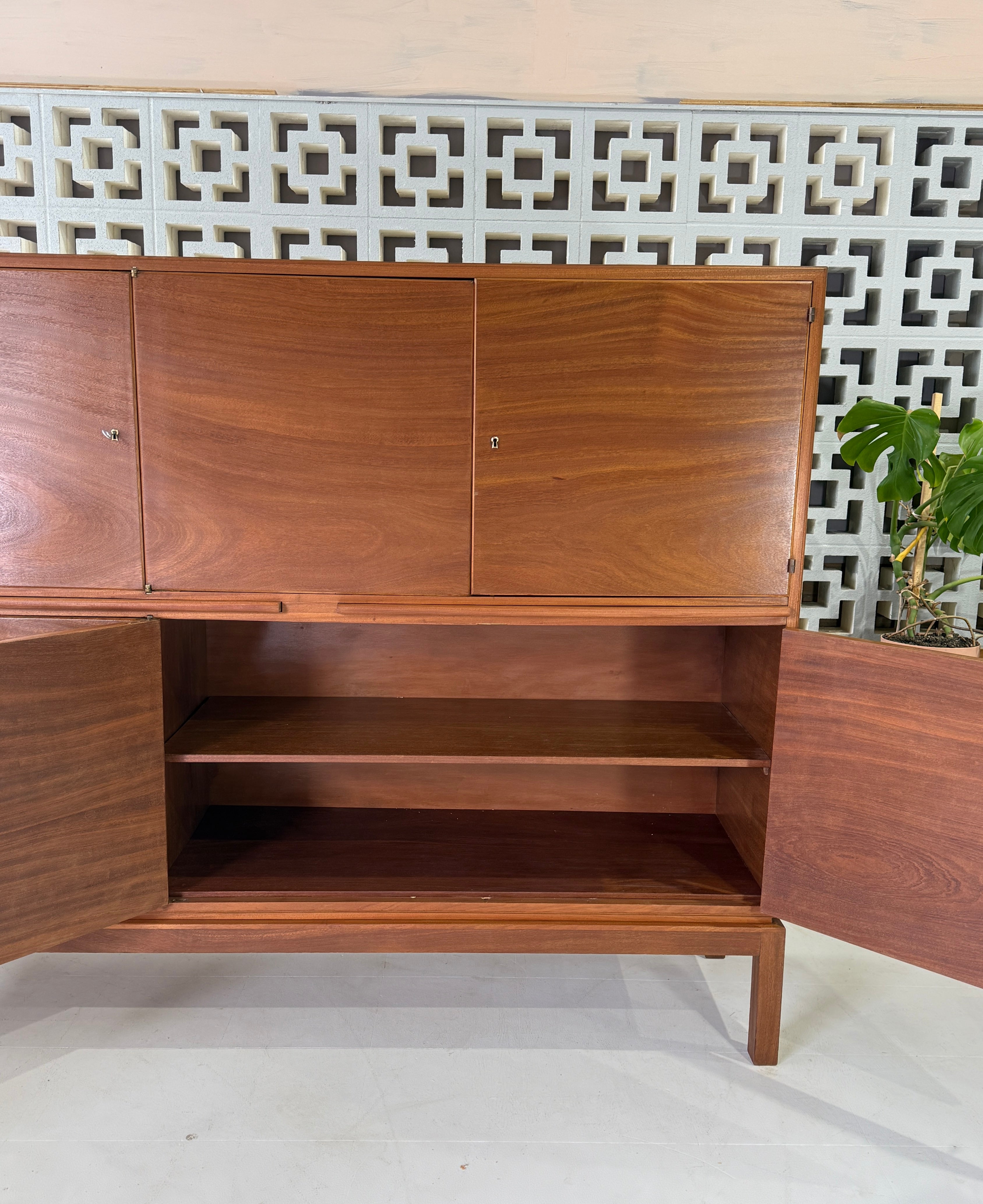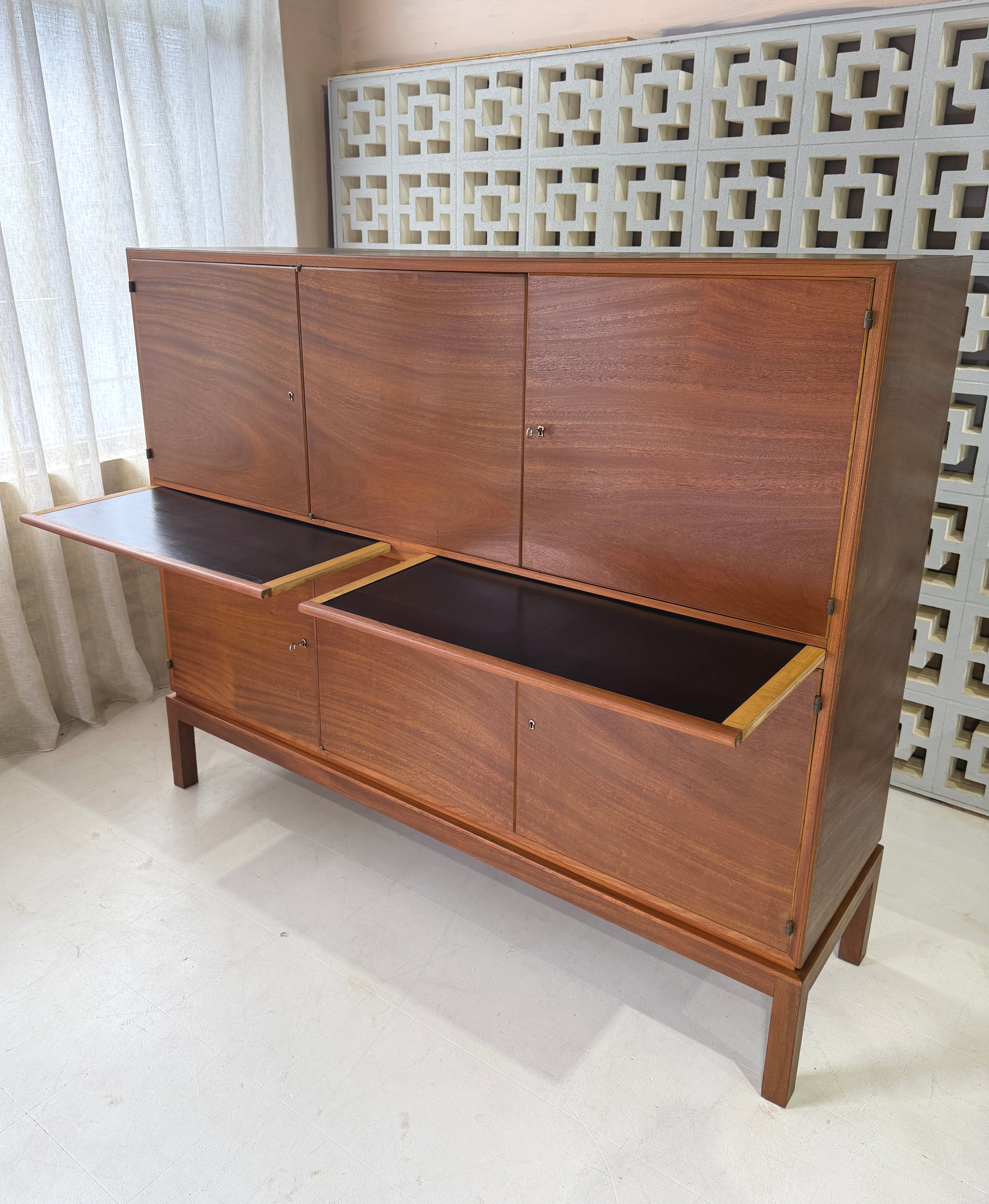 A very early piece in the Danish Modern era, the attention to grain was clearly the focus here for Rohweder. The flowing swirls of Khaya not only tell a story across the face of the cabinet but also carry on around the sides of the unit.