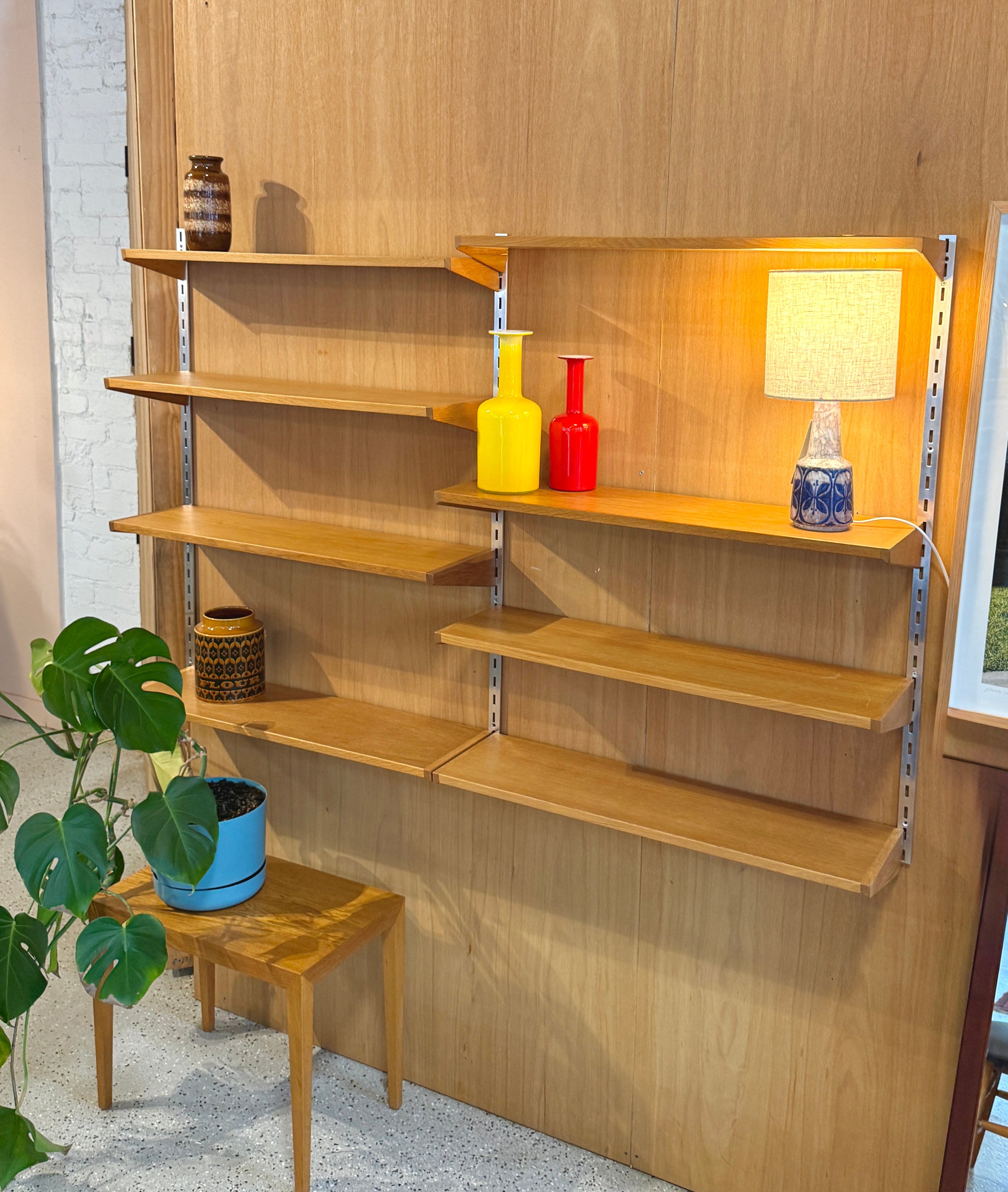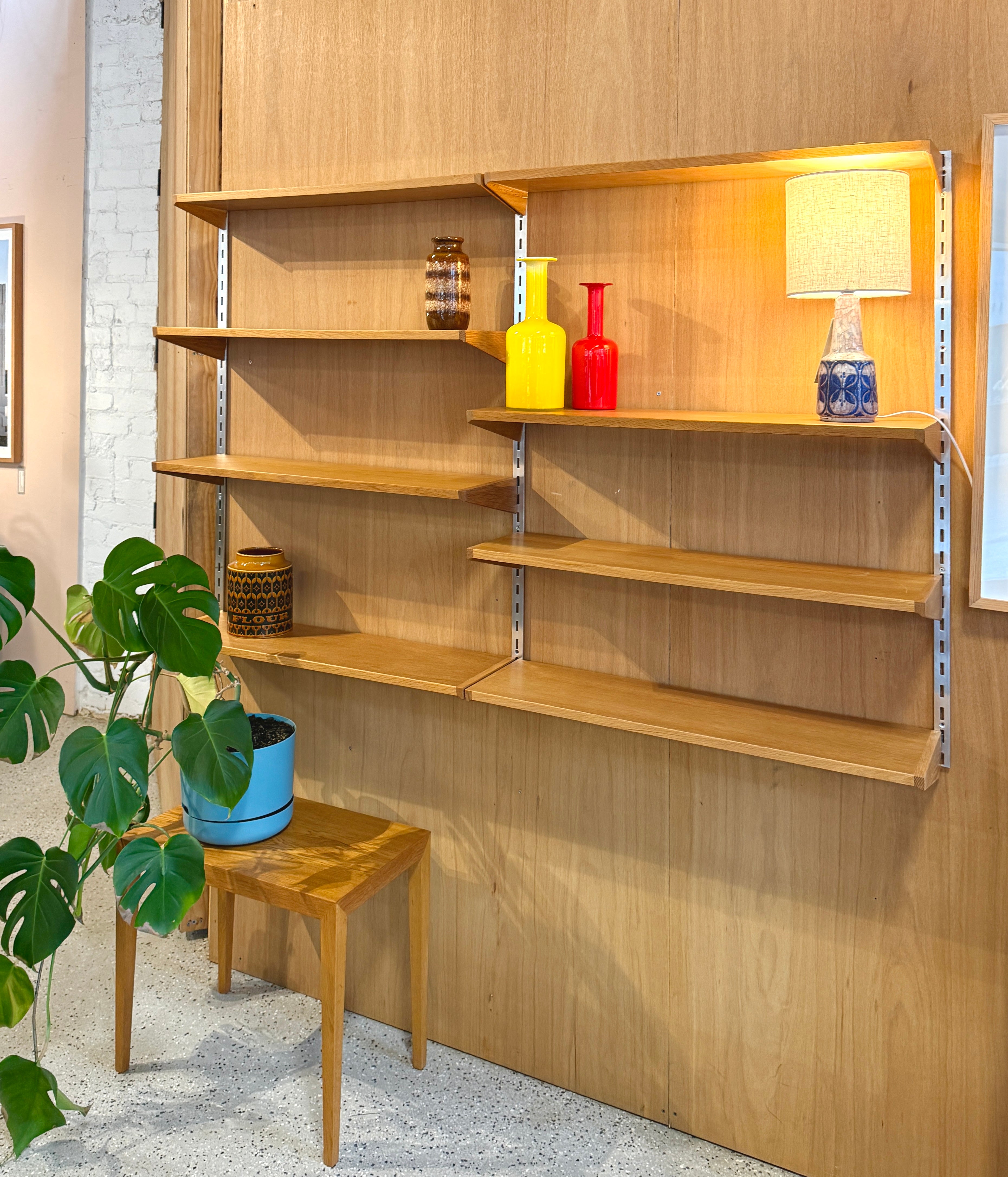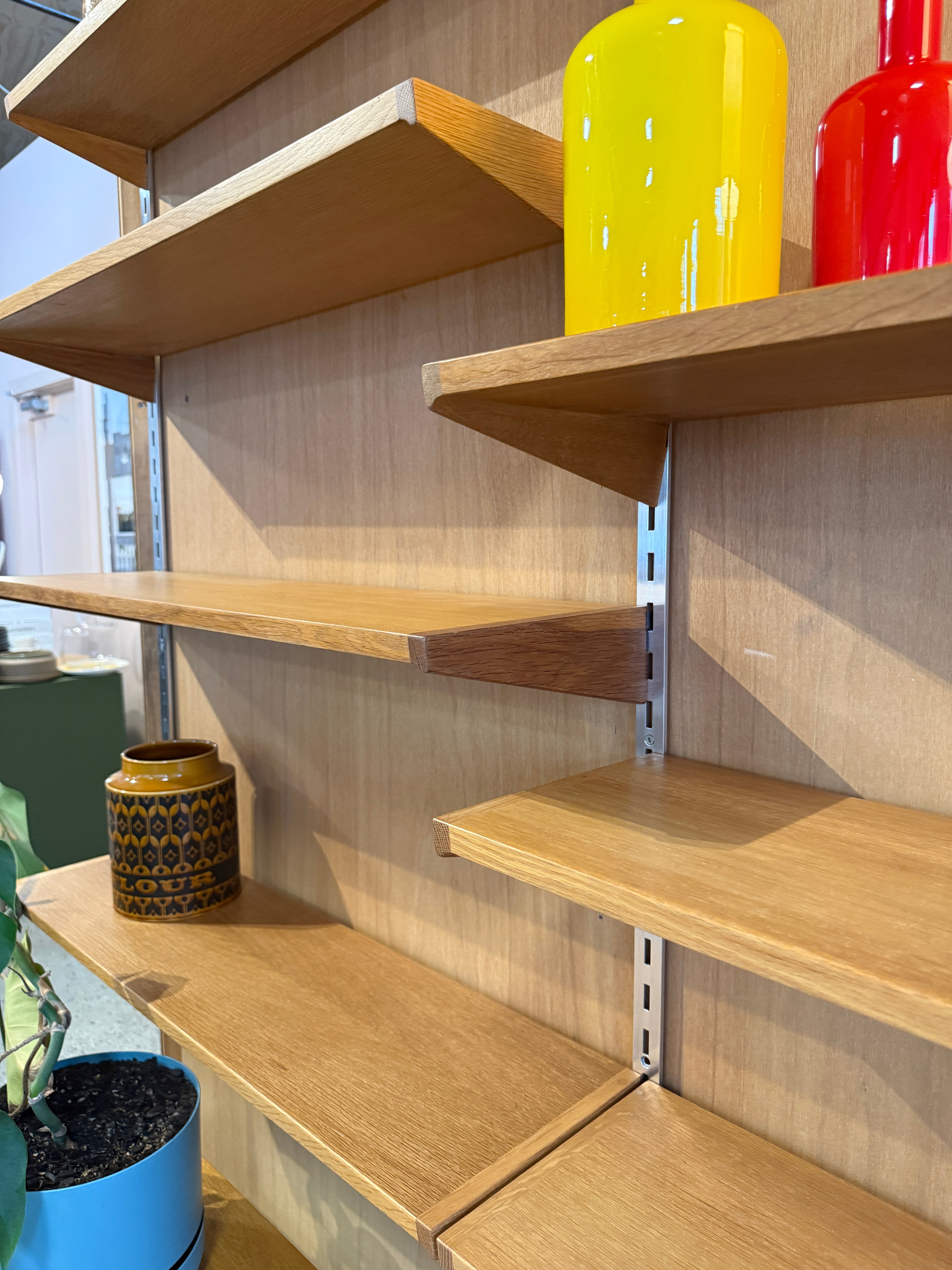 Two bay modular bookshelf wall unit in oak including nine shelves (eight pictured).