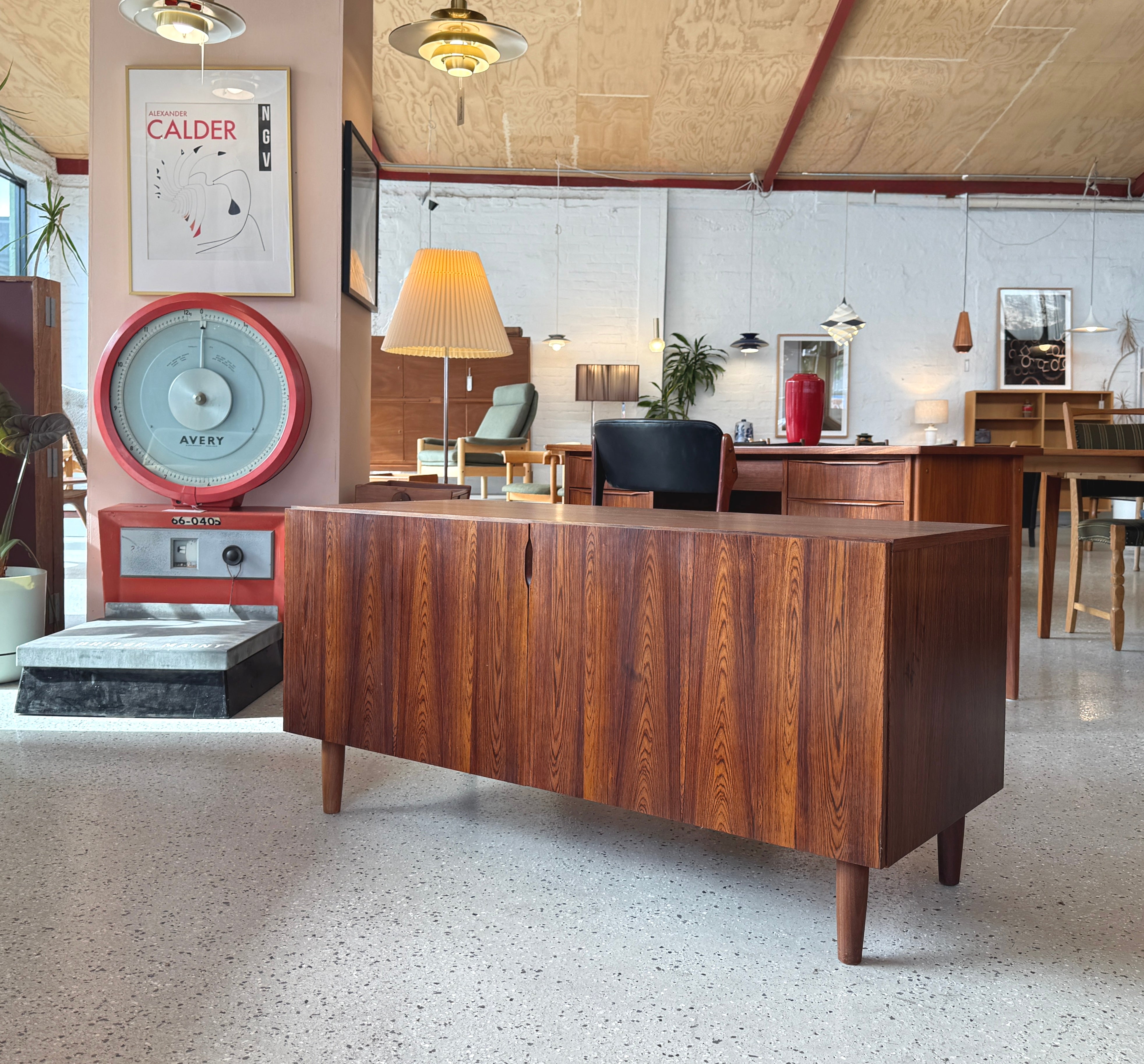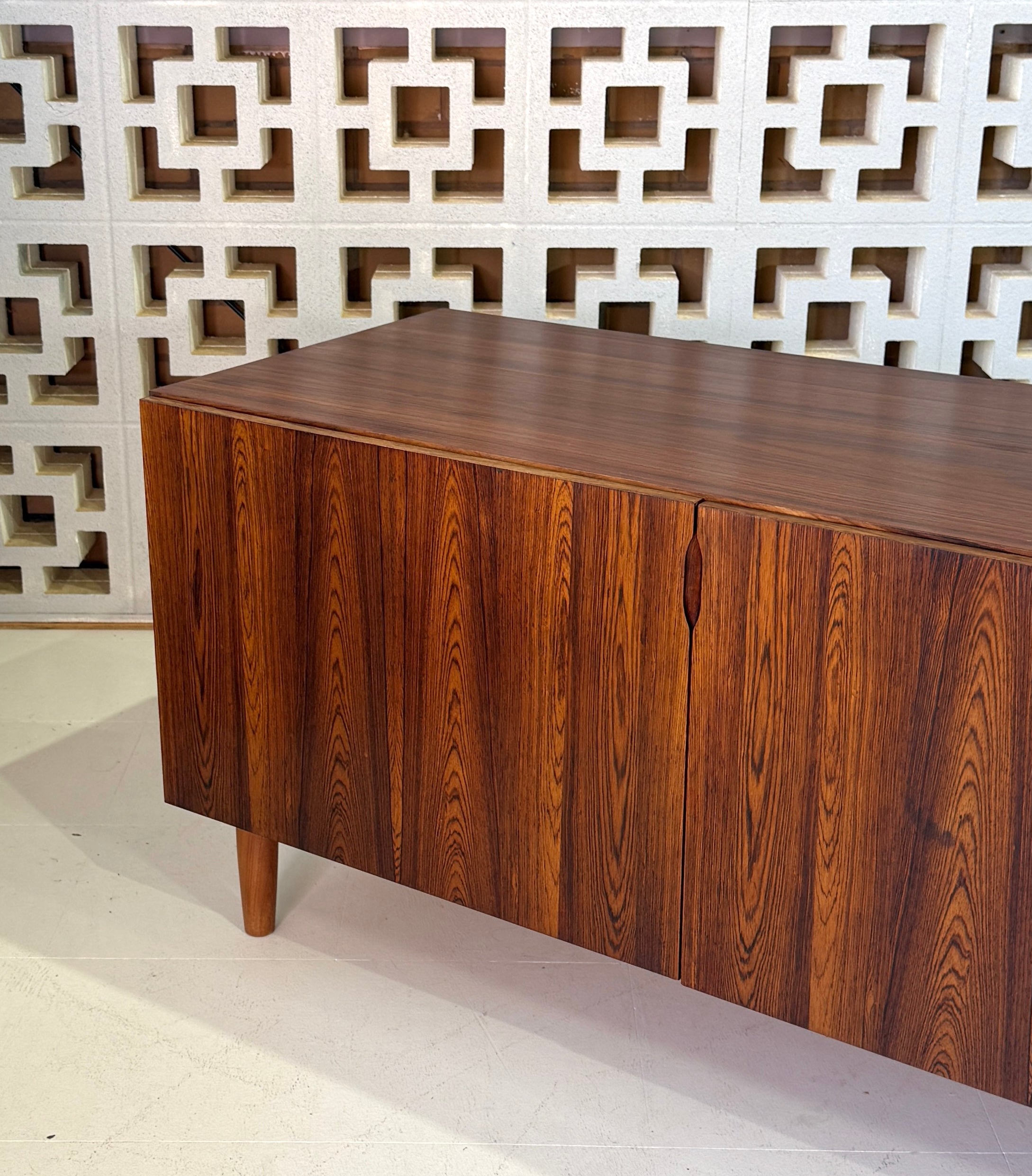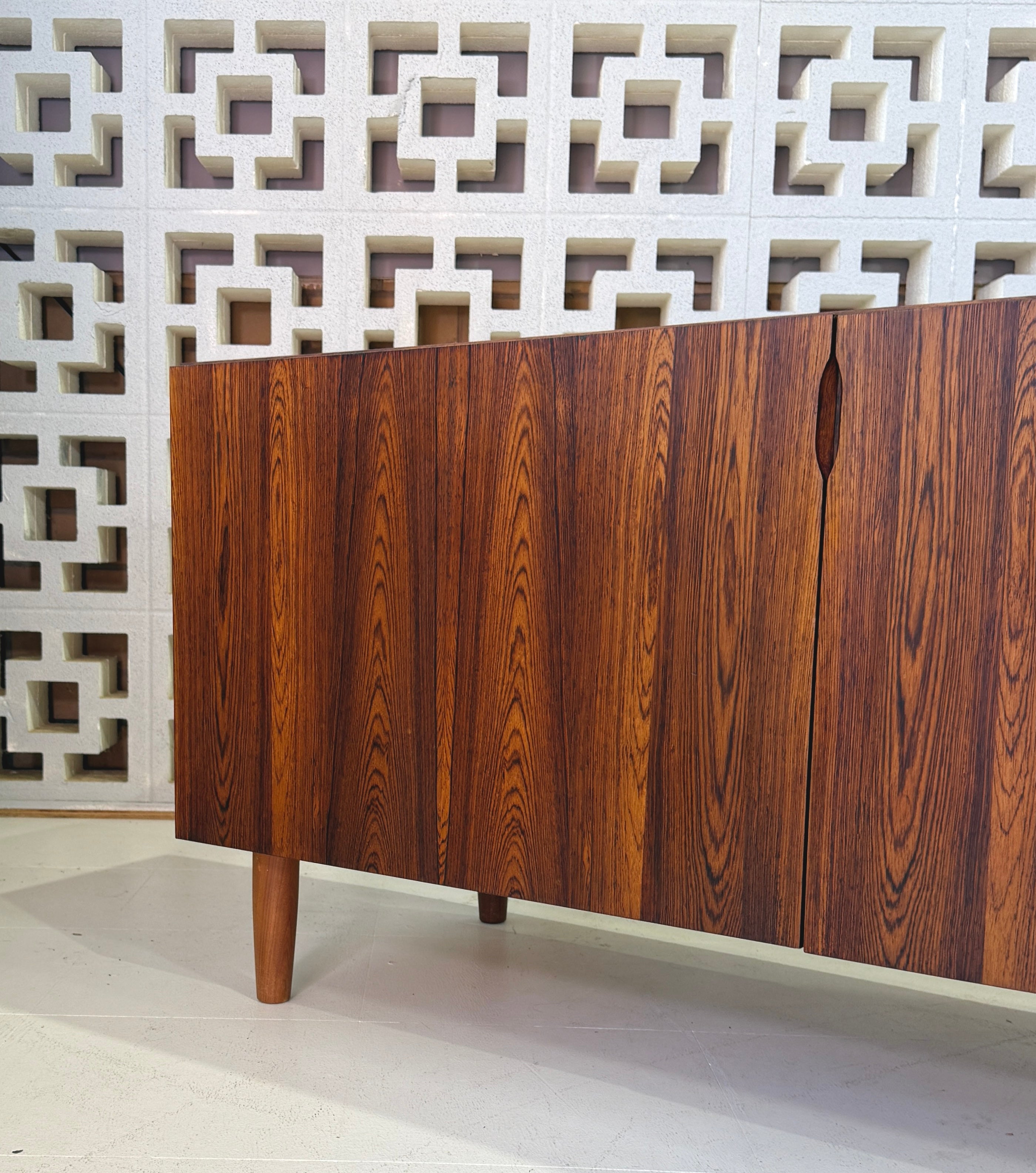 Low-profile sideboard in rosewood with two swing doors revealing substantial storage space.