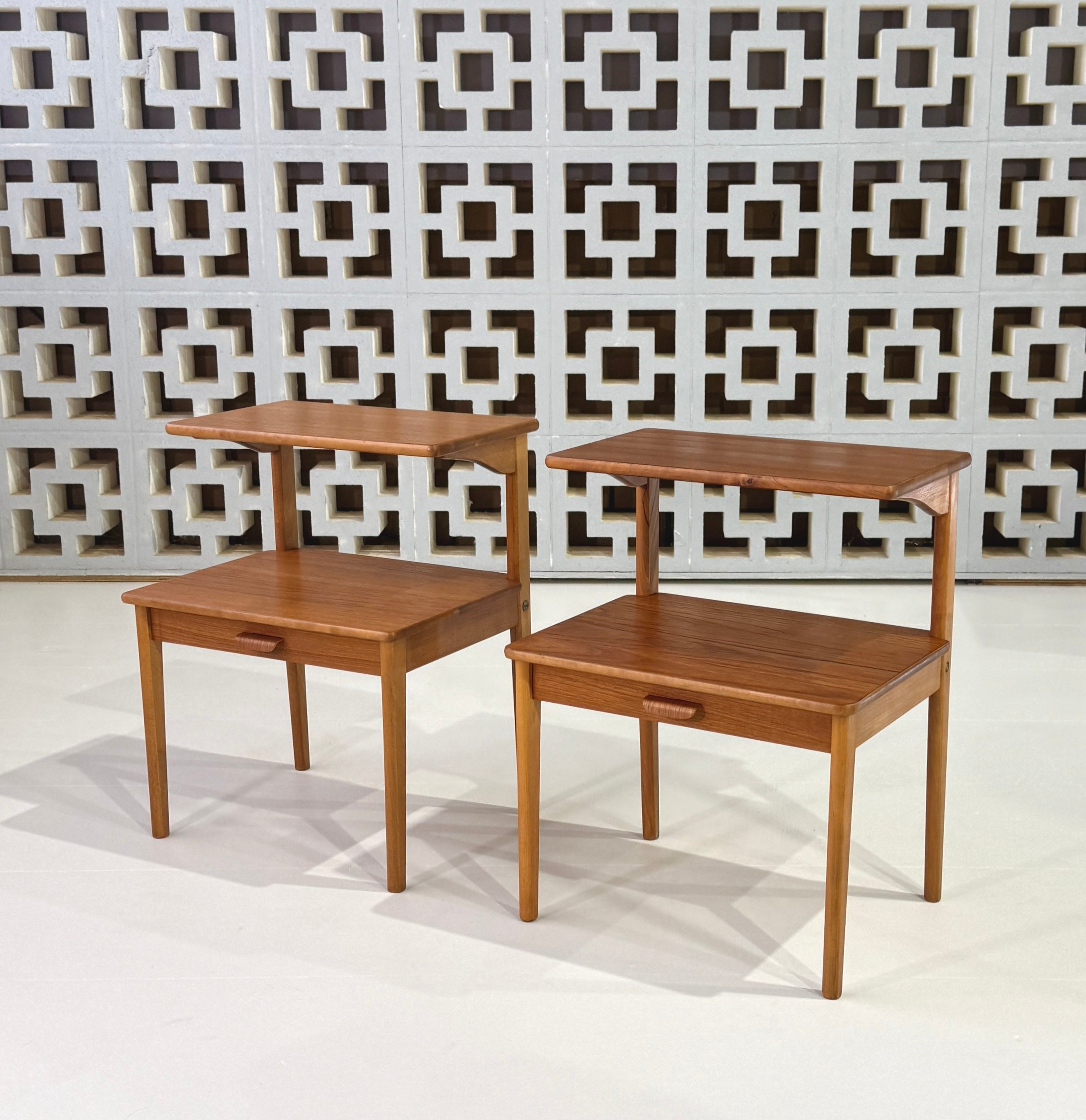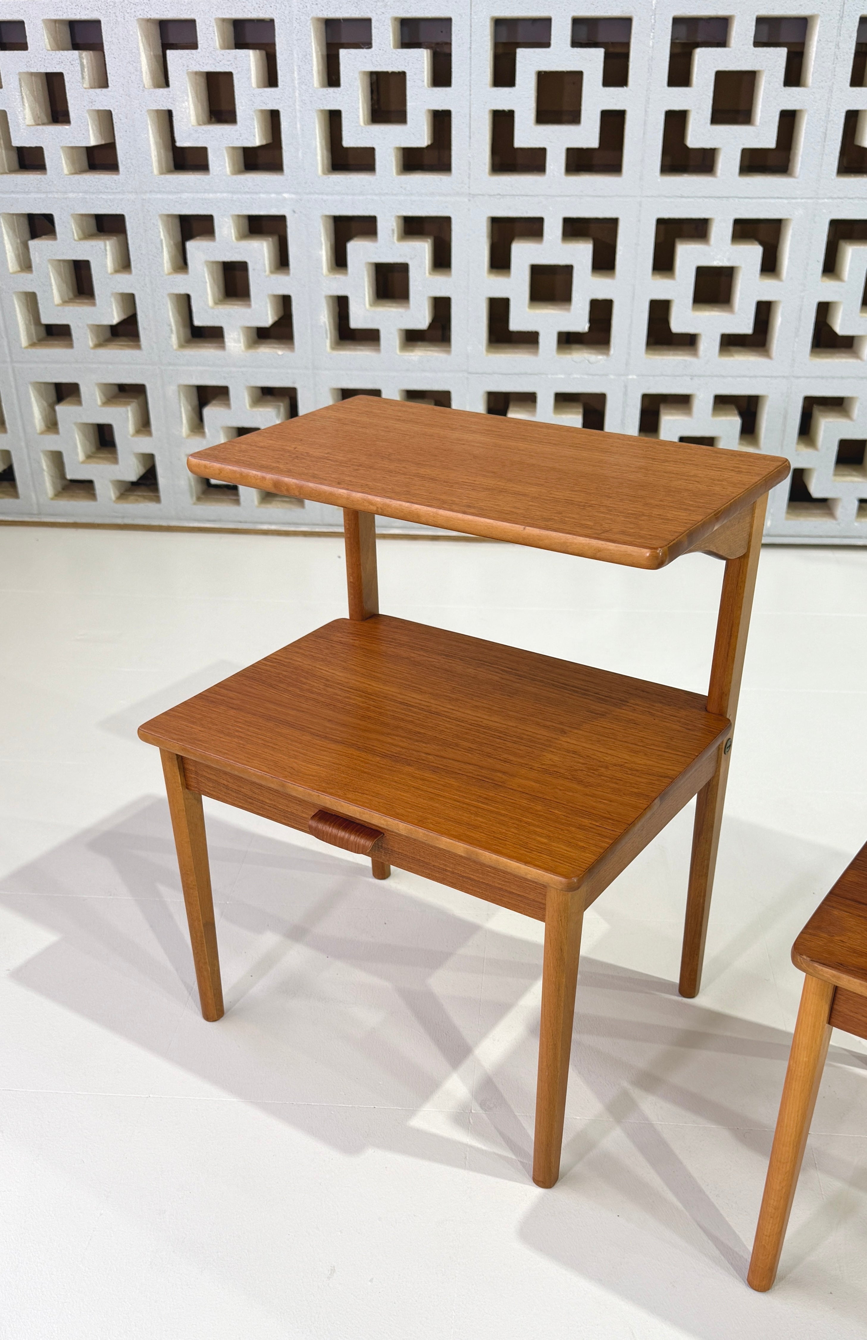Well proportioned bedside tables in teak, each with an upper shelf, a lower drawer and a generous primary surface.