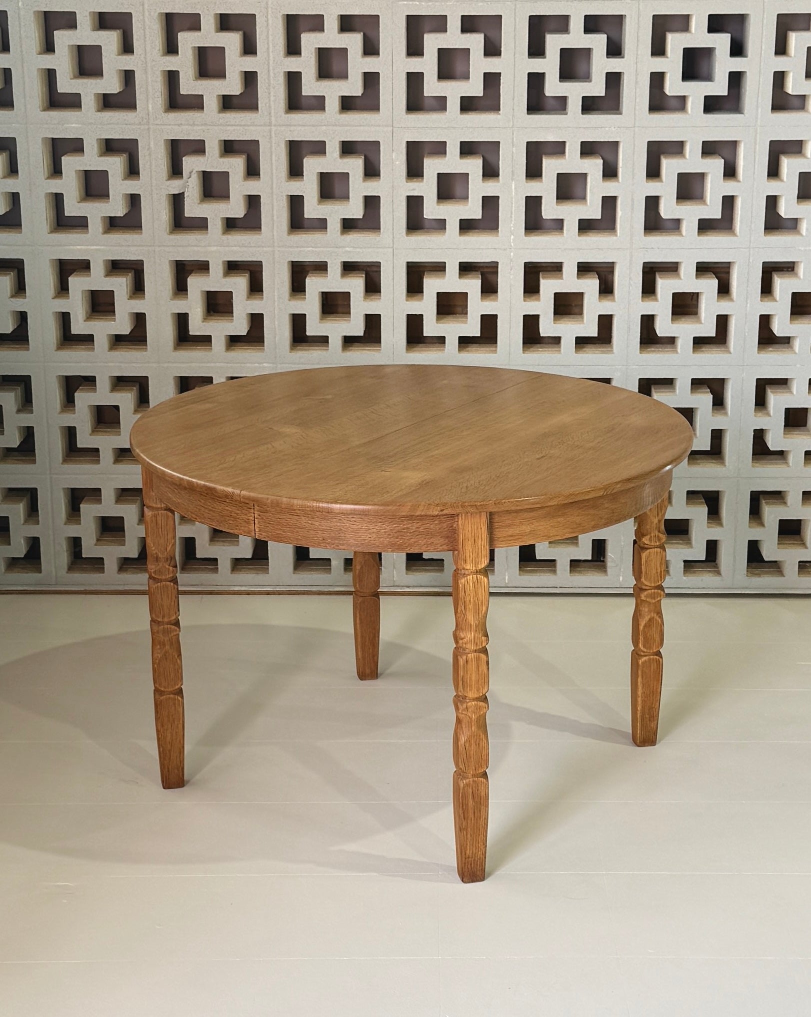 Impressive extension dining table in European oak. Sits as a round table in its compact form and extends with two large plates.