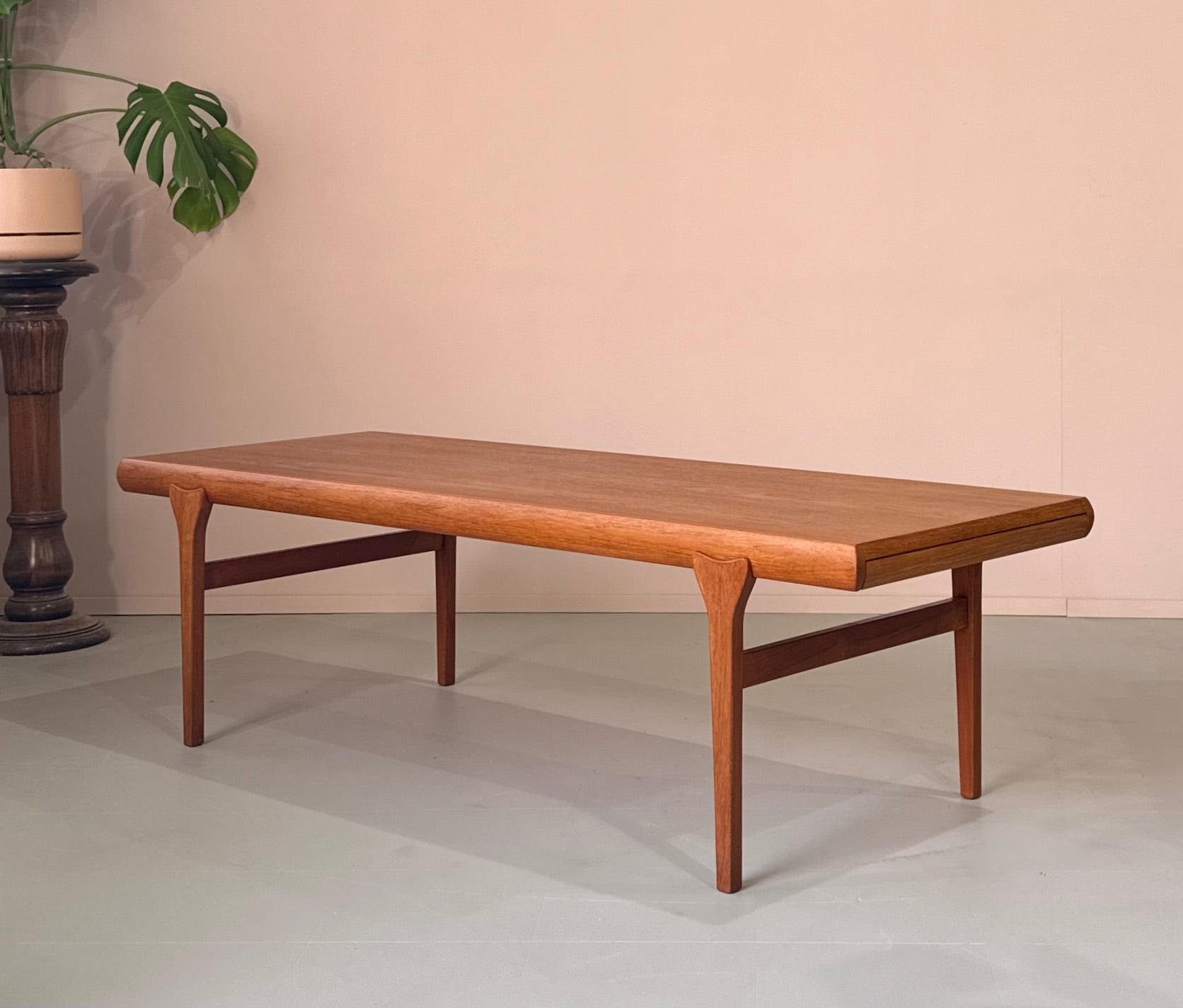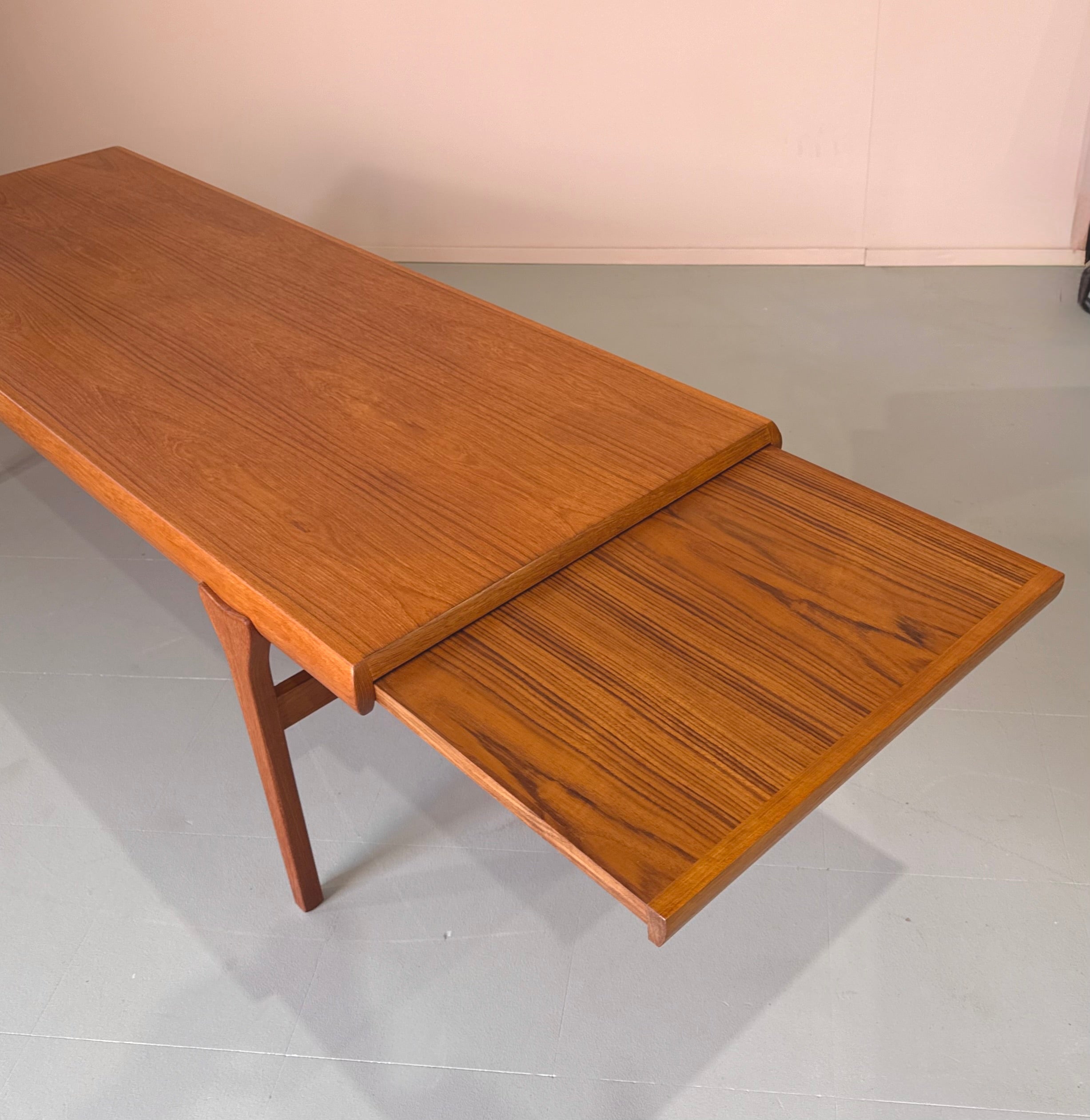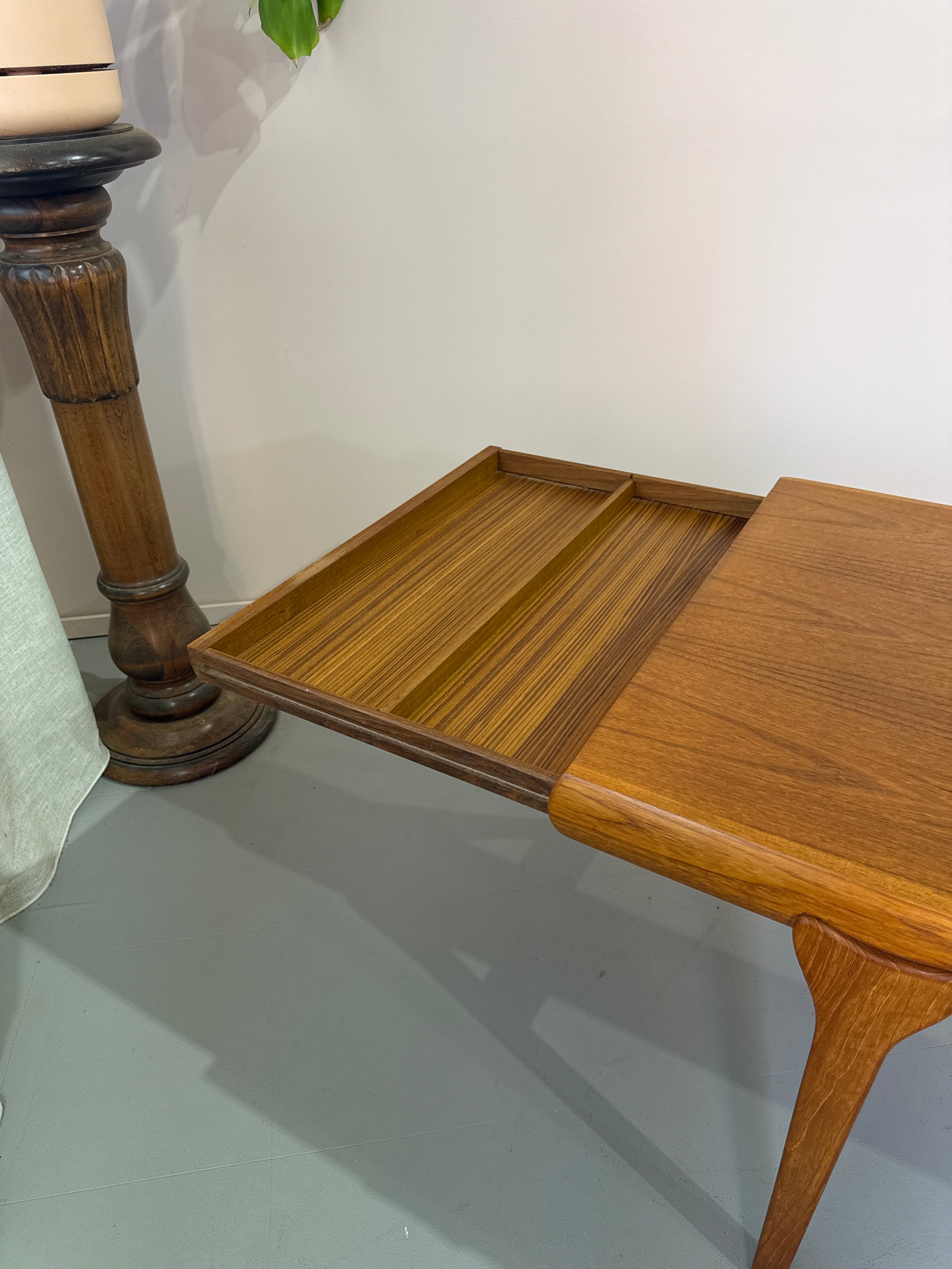 Substantial coffee table in warm teak and with a slide out shelf and a drawer.