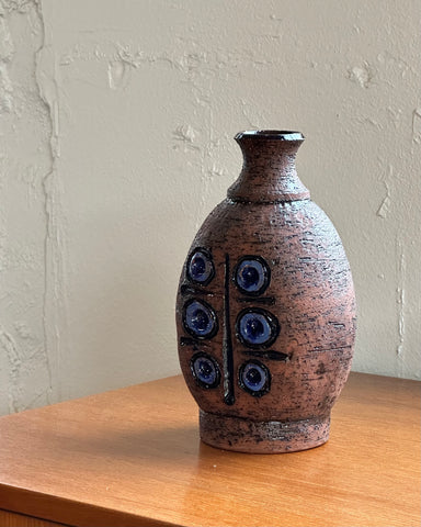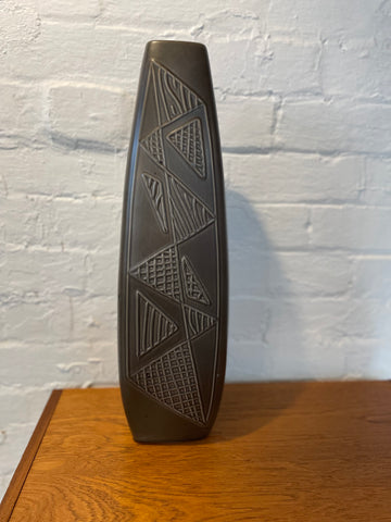 Produced in the mid 1960s by Scheurich Keramik, this large floor vase has a soft oatmeal glaze adorned with two bands of grey swirls.