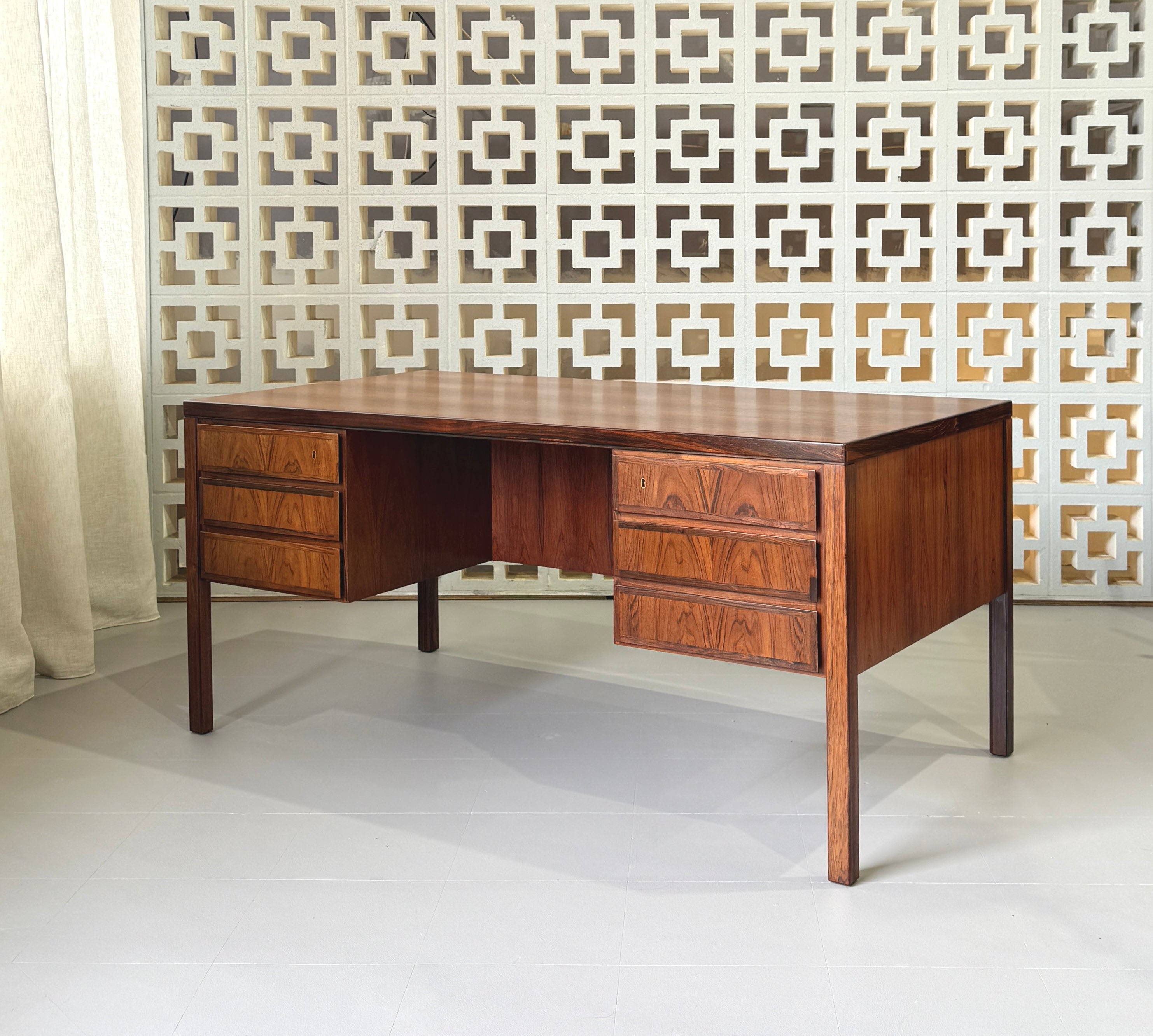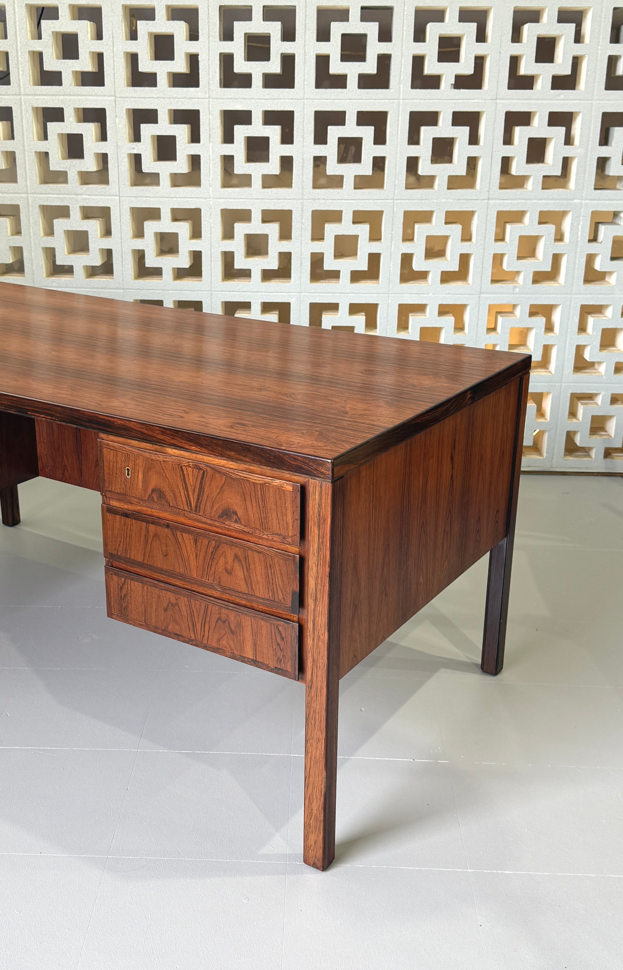 Substantial executive desk in Brazilian rosewood with six front drawers and a rear hutch / bookshelf combination.