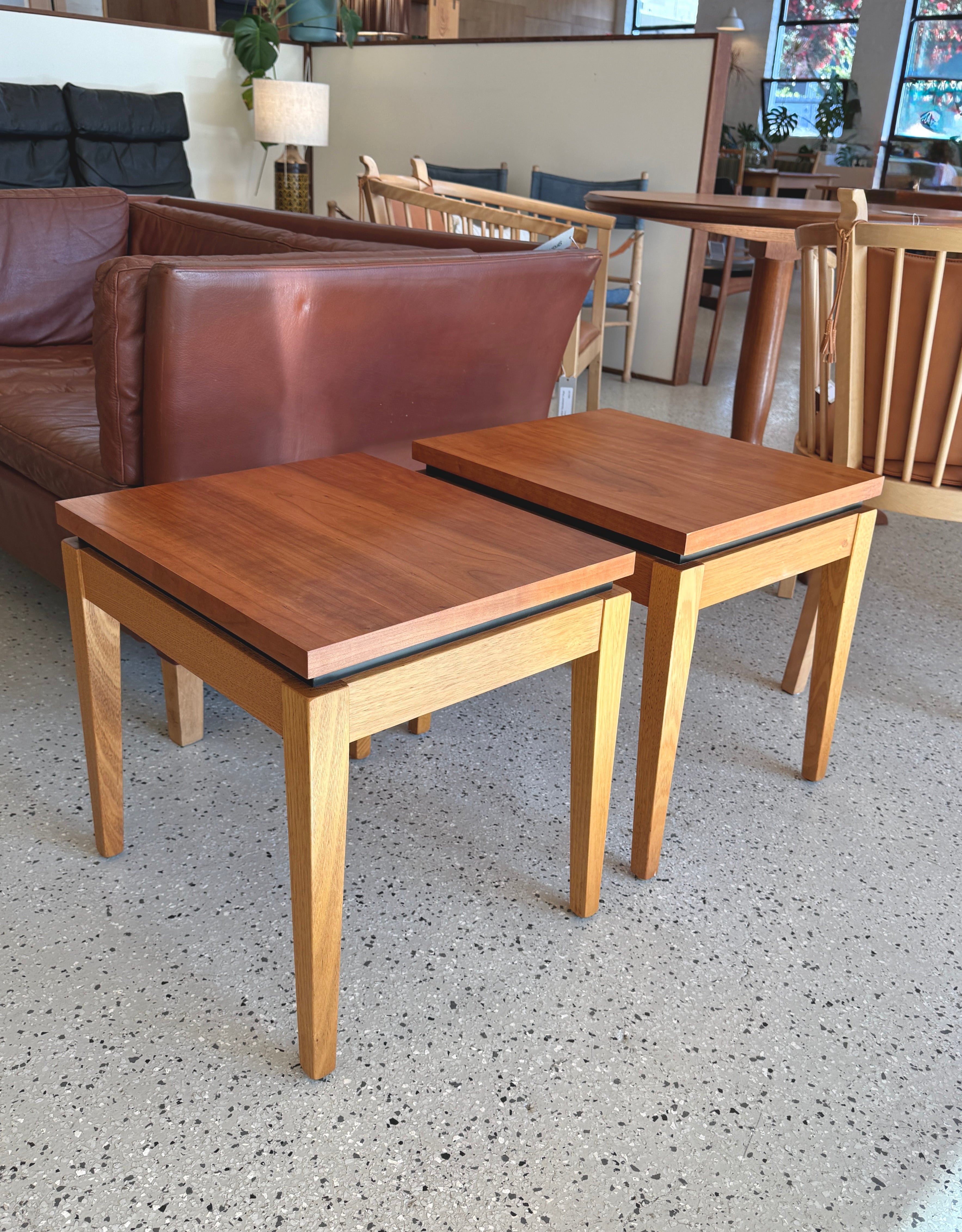 Matching pair of floating top side tables with tapered legs and a black shadow-line inlay.
