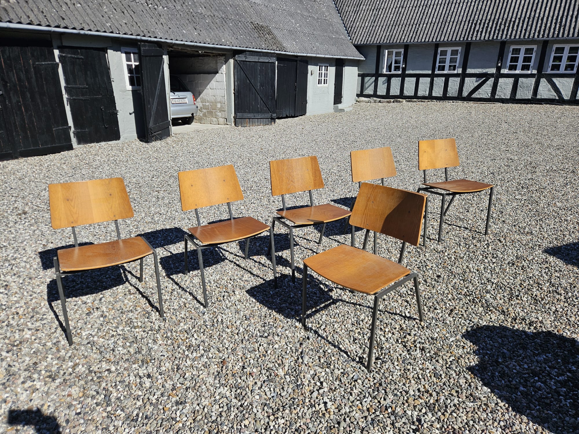 Set of six gun metal-framed school chairs with well intact seat and backrests in ply.