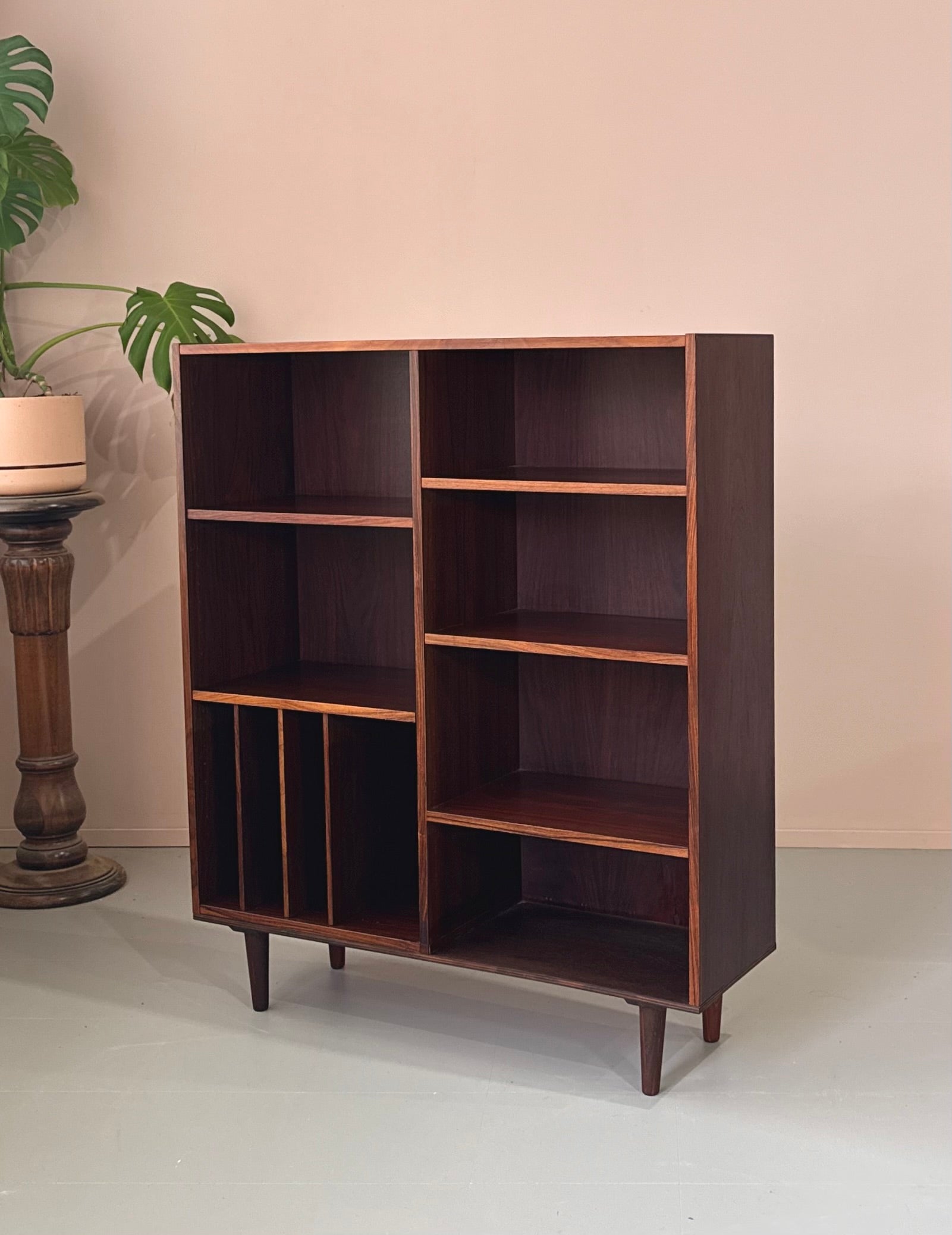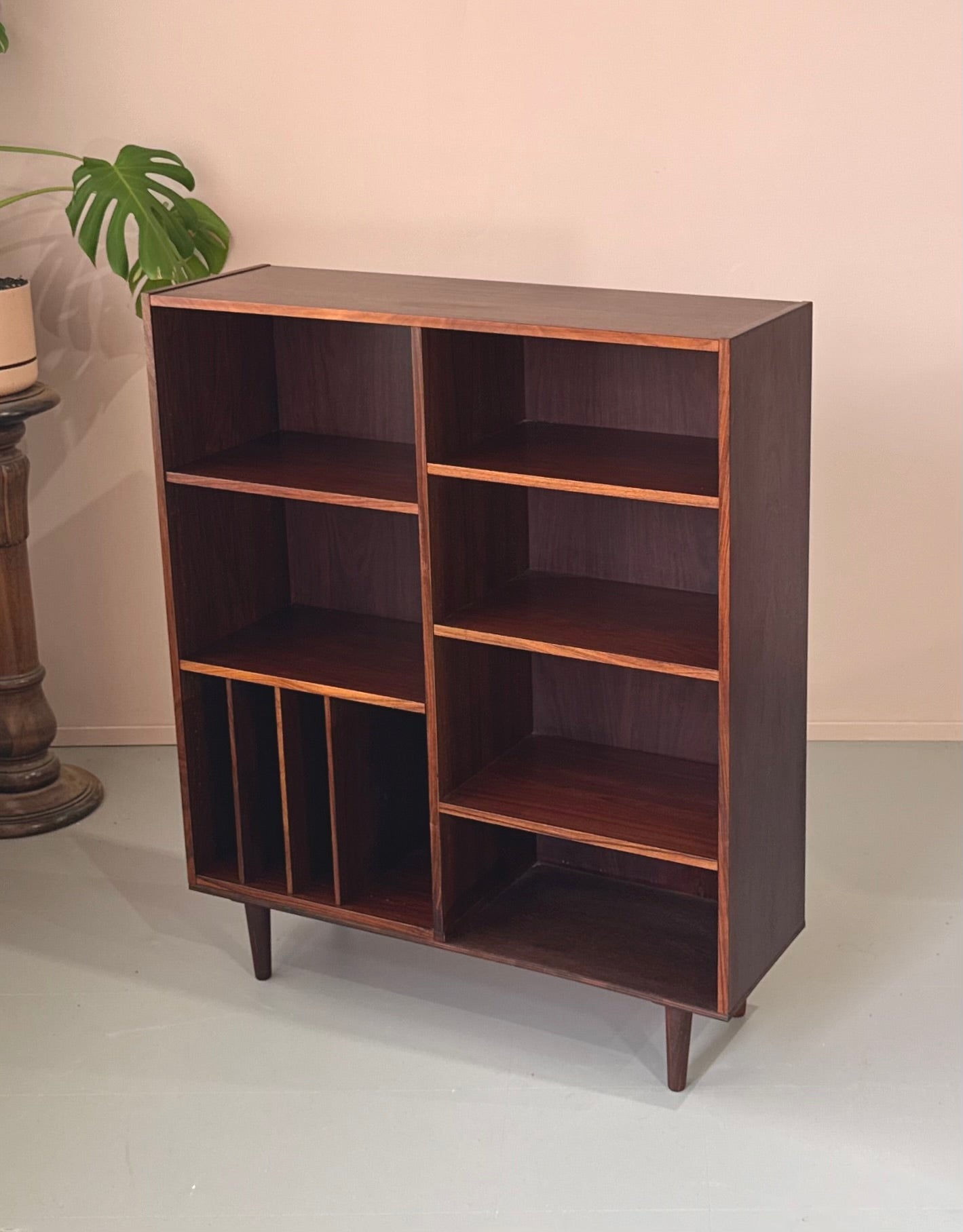 Handsome bookcase in rosewood with adjustable shelves and a divider section ideal for records/vinyl etc.